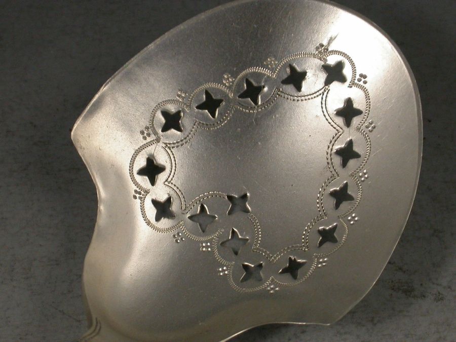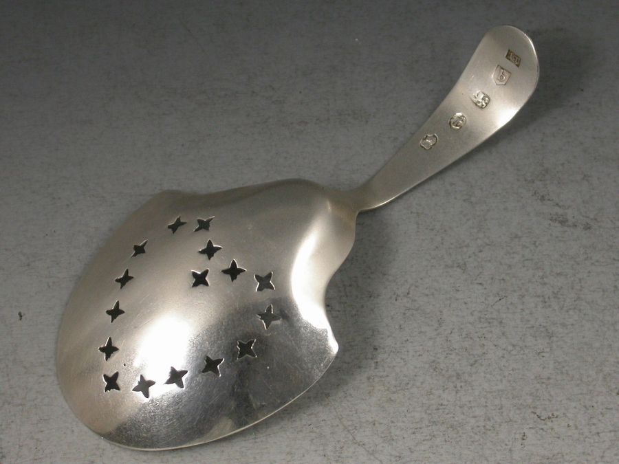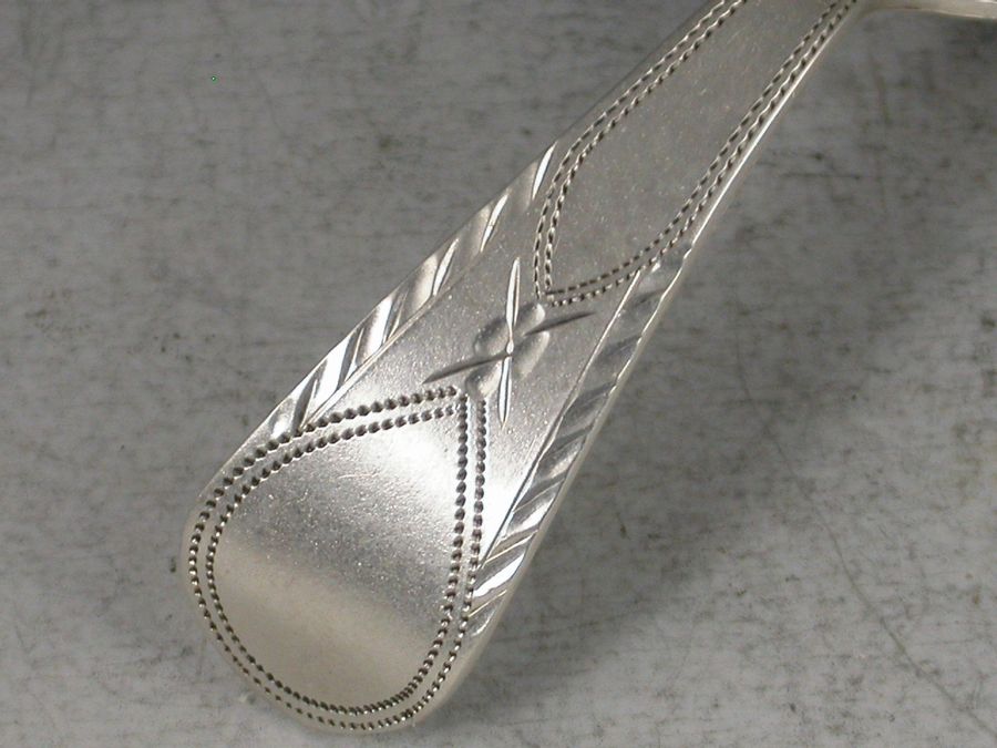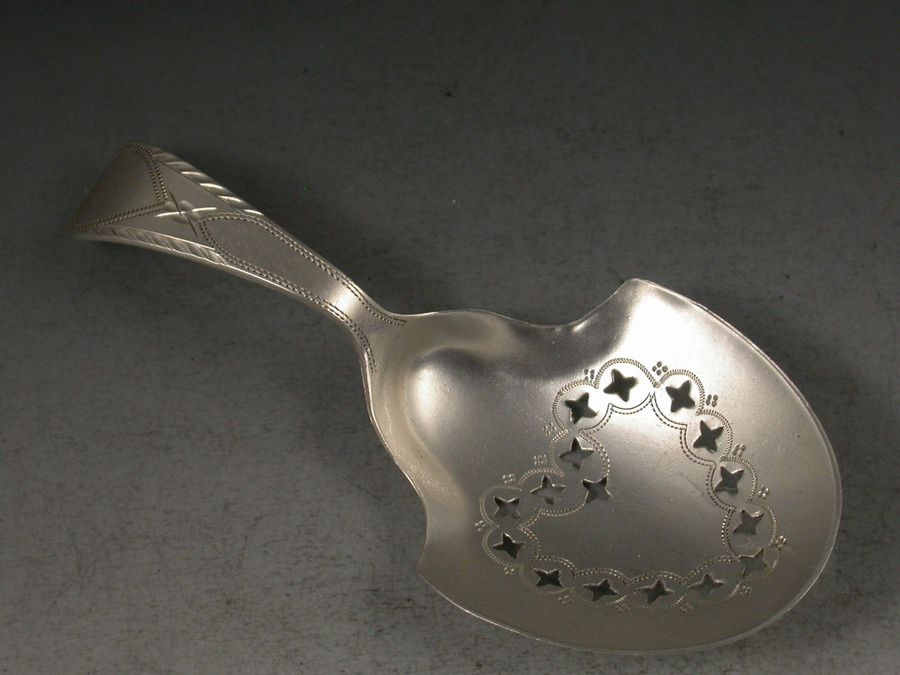 A good George III silver Caddy Spoon with bright cut engraved Old English pattern handle, the pear shaped bowl with engraved decoration and pierced with stars.