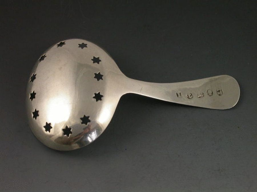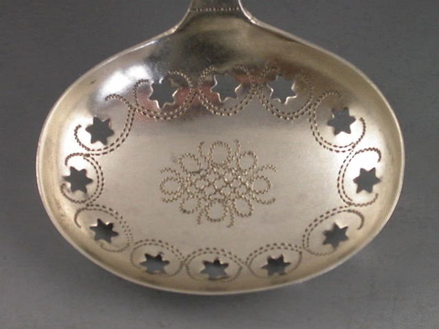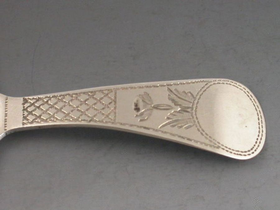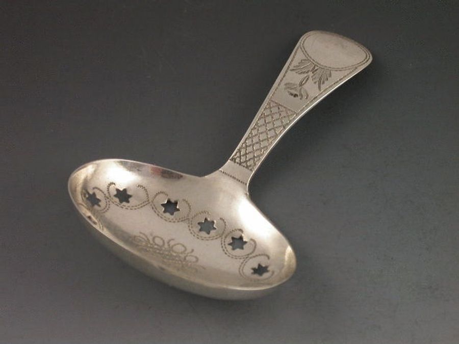 A good George III silver Caddy Spoon with oval bowl and Old English type handle, bright cut and prick dot engraved floral decoration to bowl and handle, the bowl with star shaped piercing.