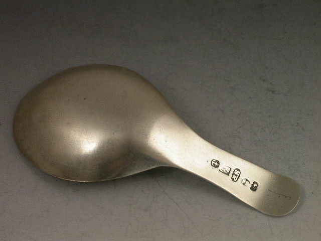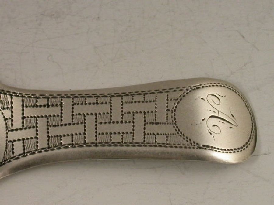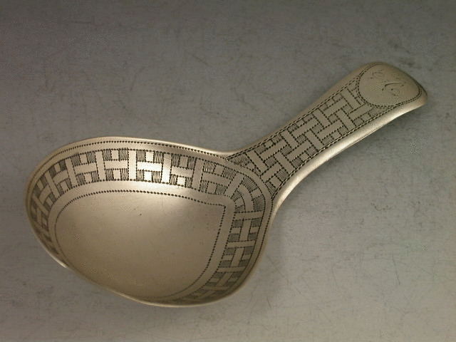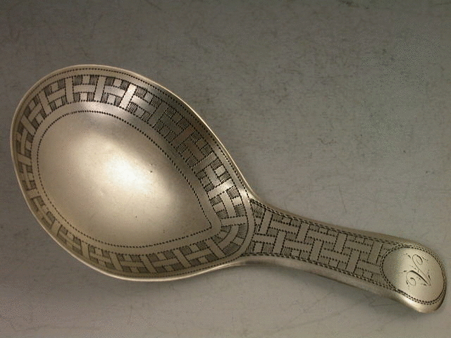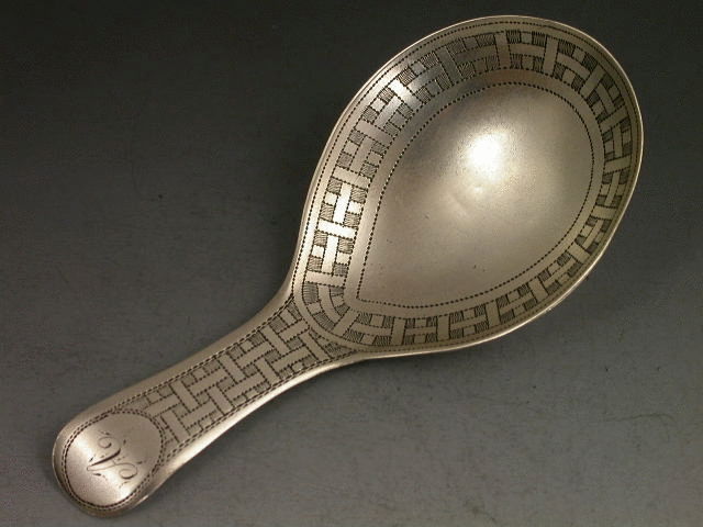 A George III silver Caddy Spoon with pair shaped bowl and Old English type handle, bright cut and prick dot engraved decoration in a basket weave pattern. The handle engraved with contemporary initial A.