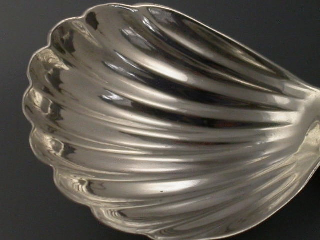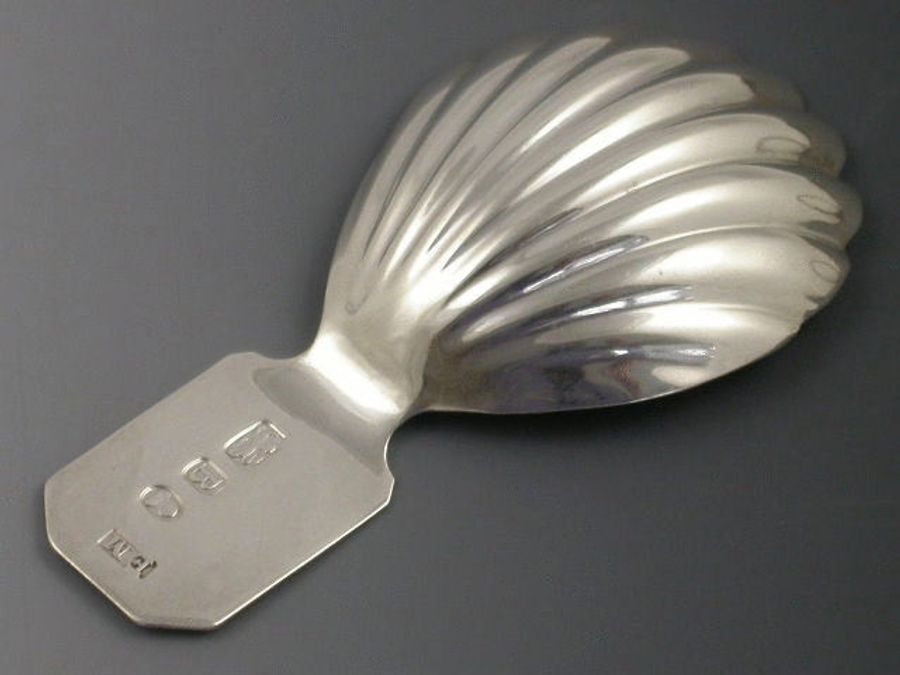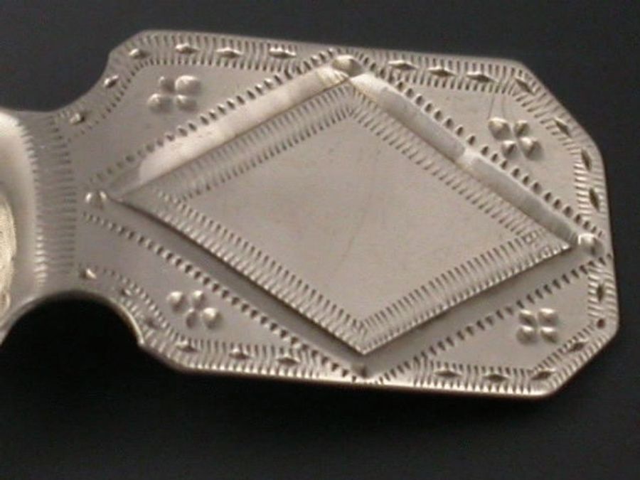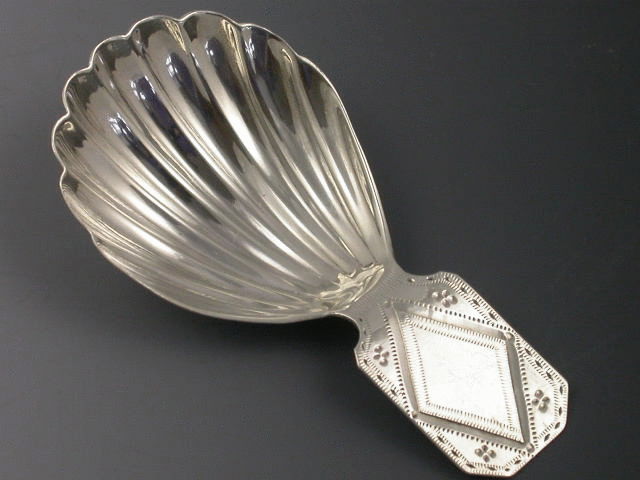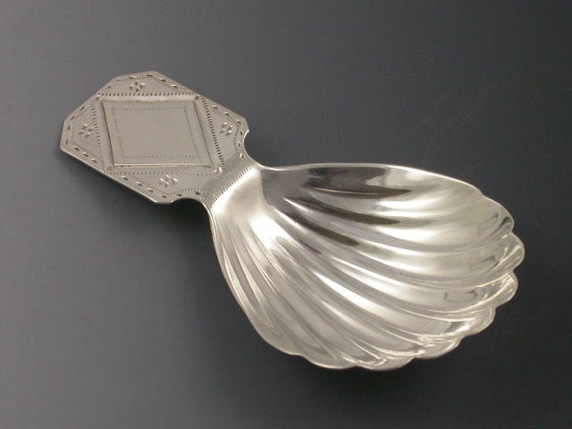 A good George III 18th century silver Caddy Spoon with oval scallop shell bowl, bright-cut engraved rectangular handle with cut-corners, vacant diamond shape cartouche.
