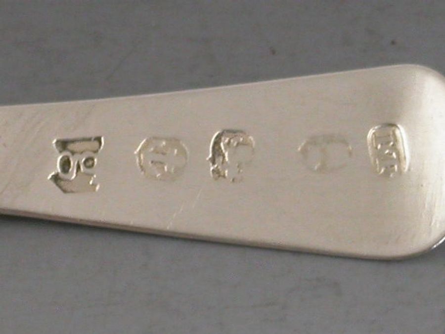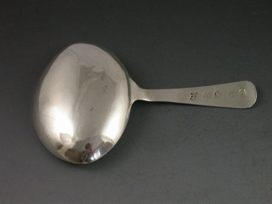 A good George III silver Caddy Spoon with sideways oval bowl and Old English type handle, bright cut and prick dot engraved decoration to bowl and handle.