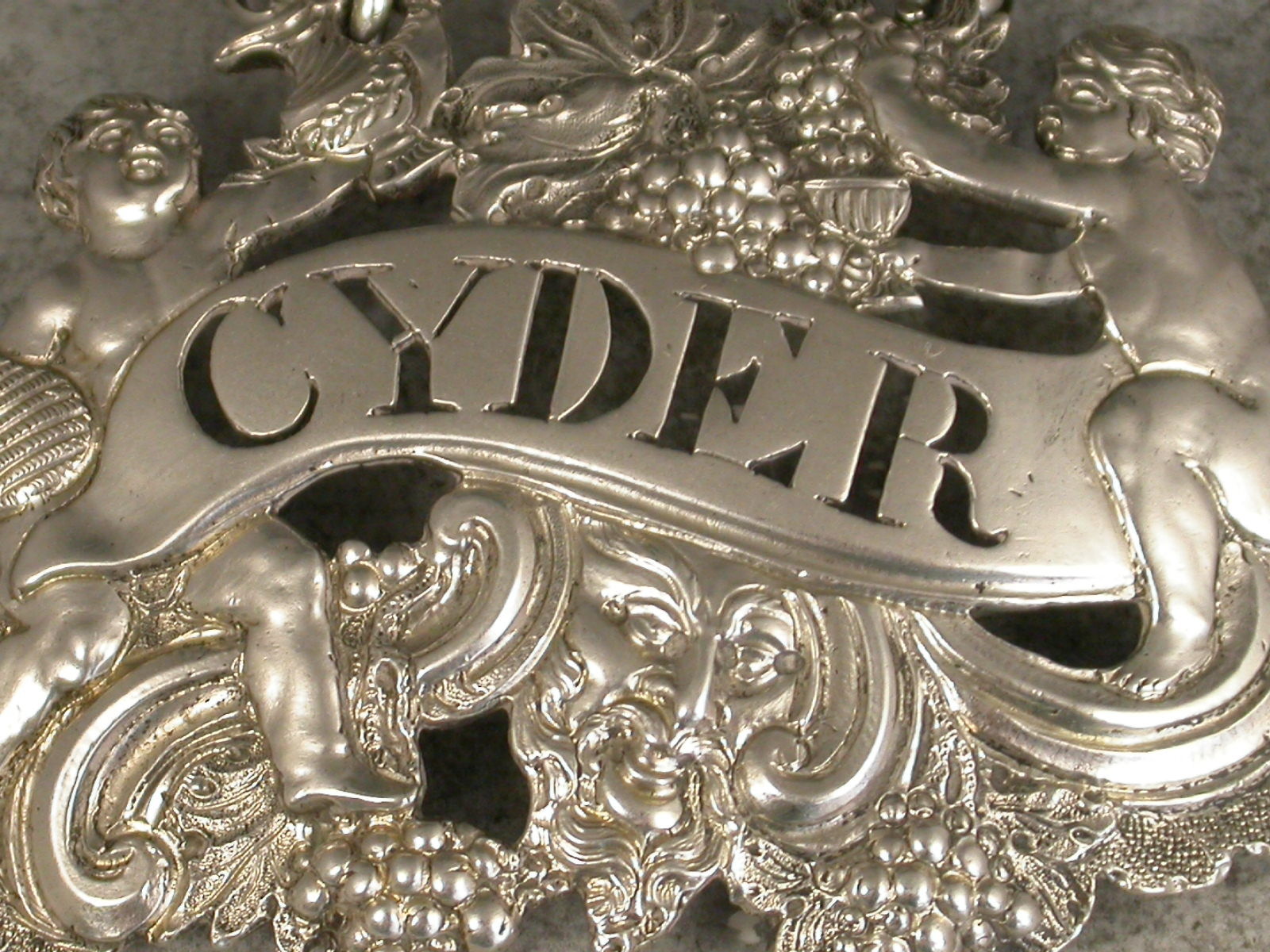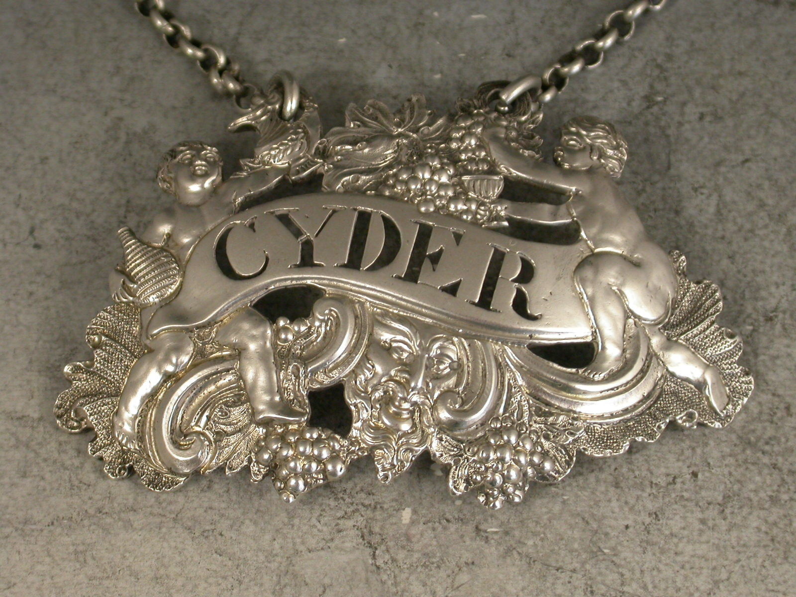 A fine quality George II/early George III cast silver Wine Label, the scrolled name plate pierced for Cyder with fruiting vines above and a Bacchanalian mask below, a naked putti at each end, one holding a jug and bottle and the other squeezing grapes into a bottle.
