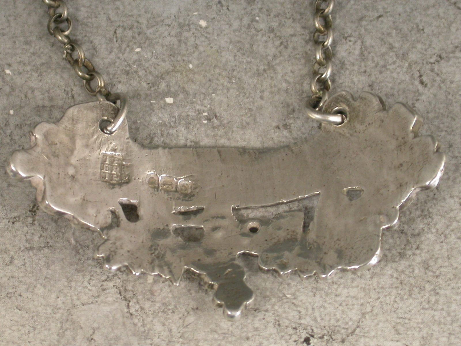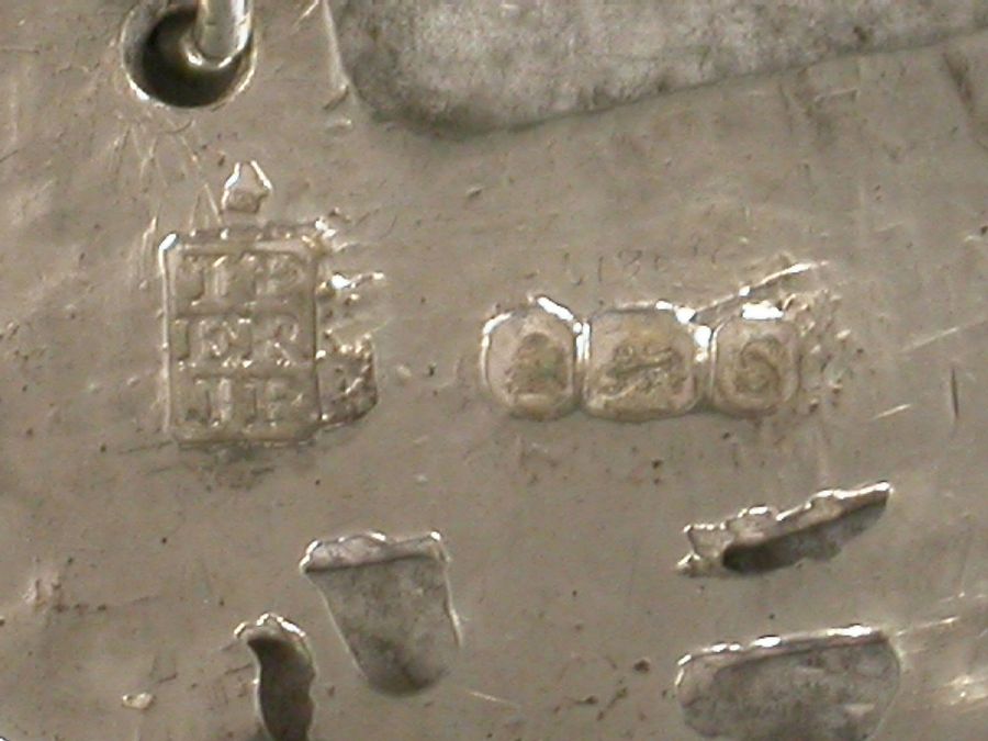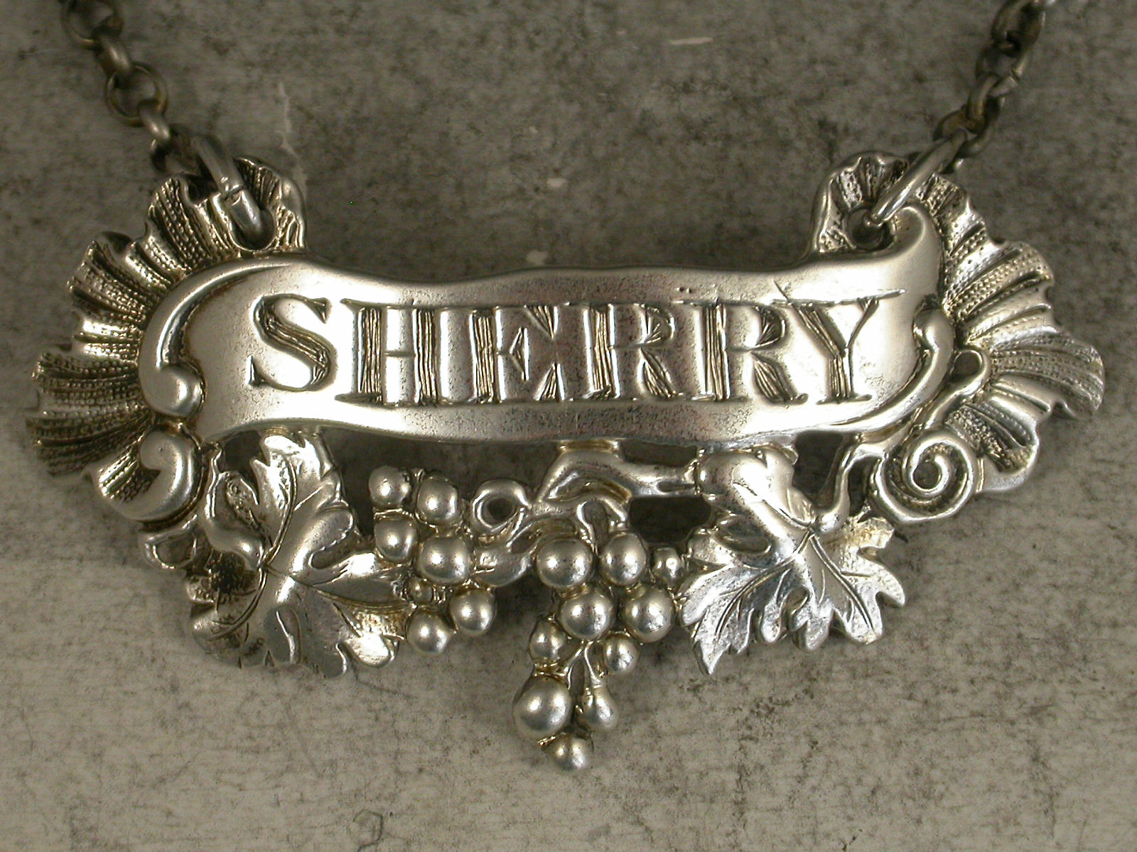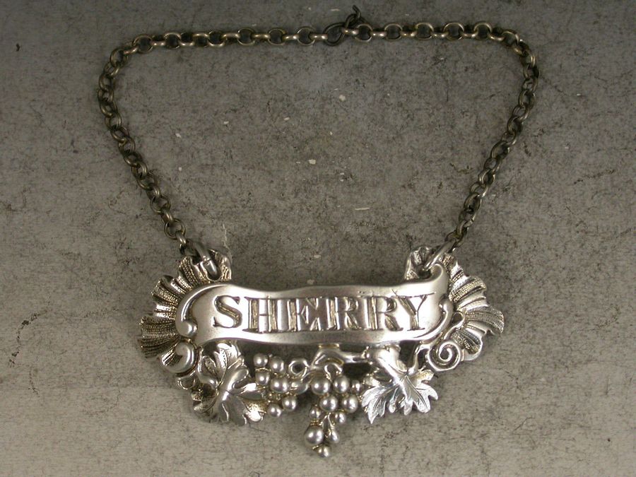 A good George III heavy cast silver Wine Label of scrolled form with vine leaves and grapes below and Rocaille shells to either end, incised for Sherry.