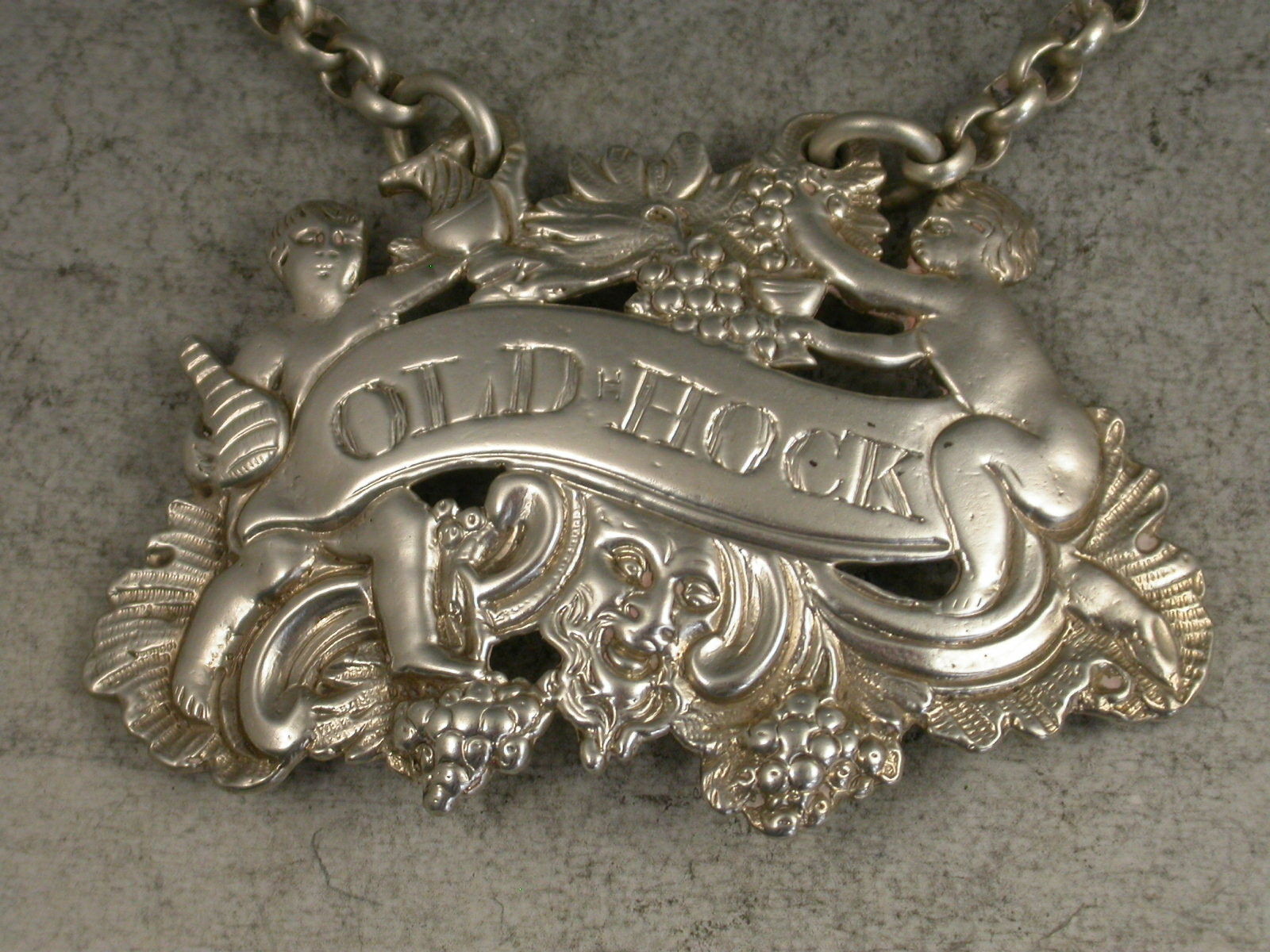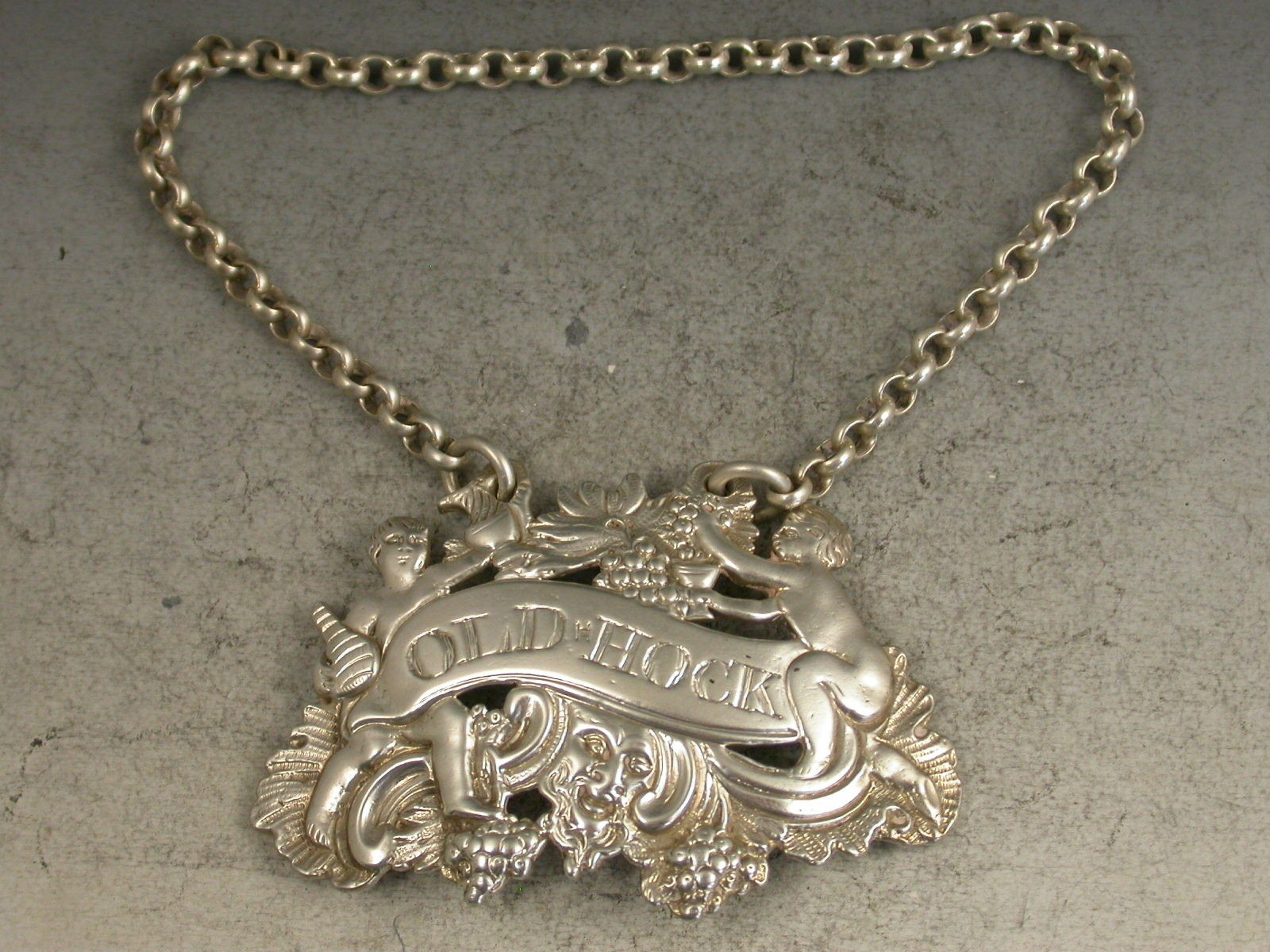 A rare early George III heavy cast Silver Wine Label of two Putti, Bacchanalian mask and fruiting vine form, one putto holding a jug and bottle, the other squeezing grapes into a goblet, incised for Old Hock.