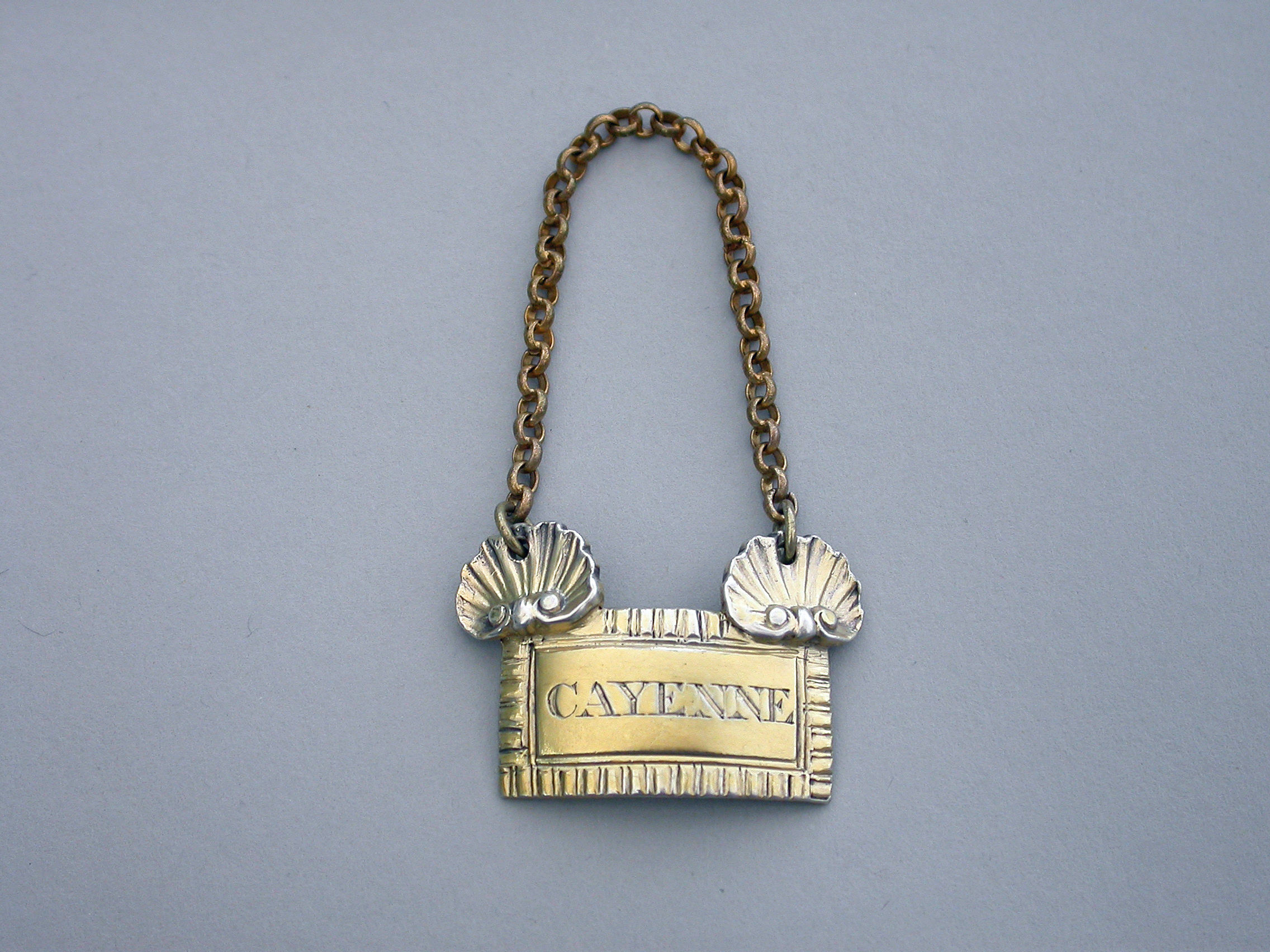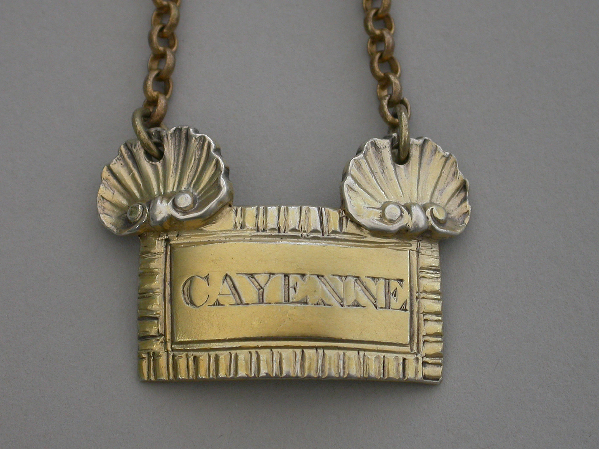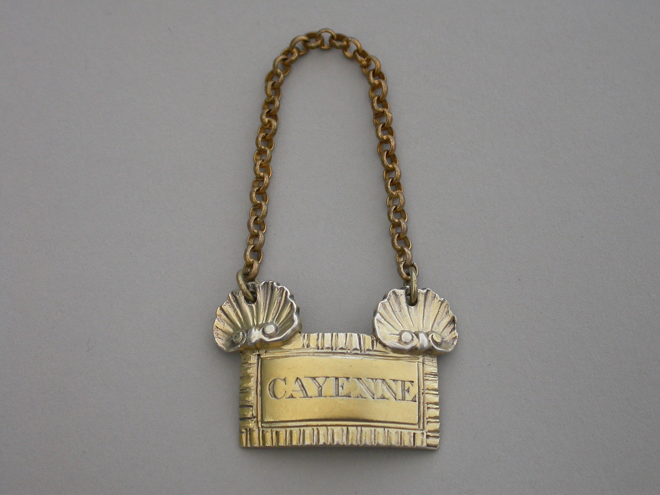 An extremely fine and rare George III cast silver gilt Sauce Label of broad rectangular form with gadrooned border, a large applied scallop shell to the top corners from which the suspension chain is attached. Incised for CAYENNE.