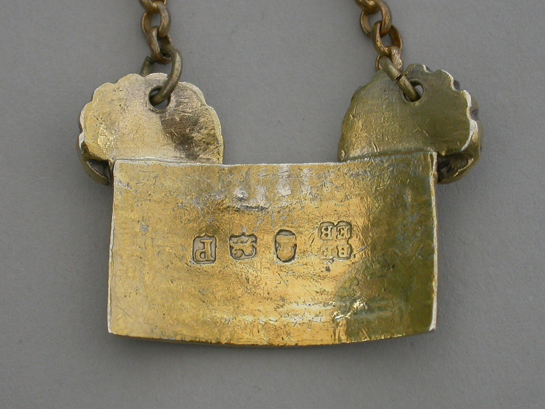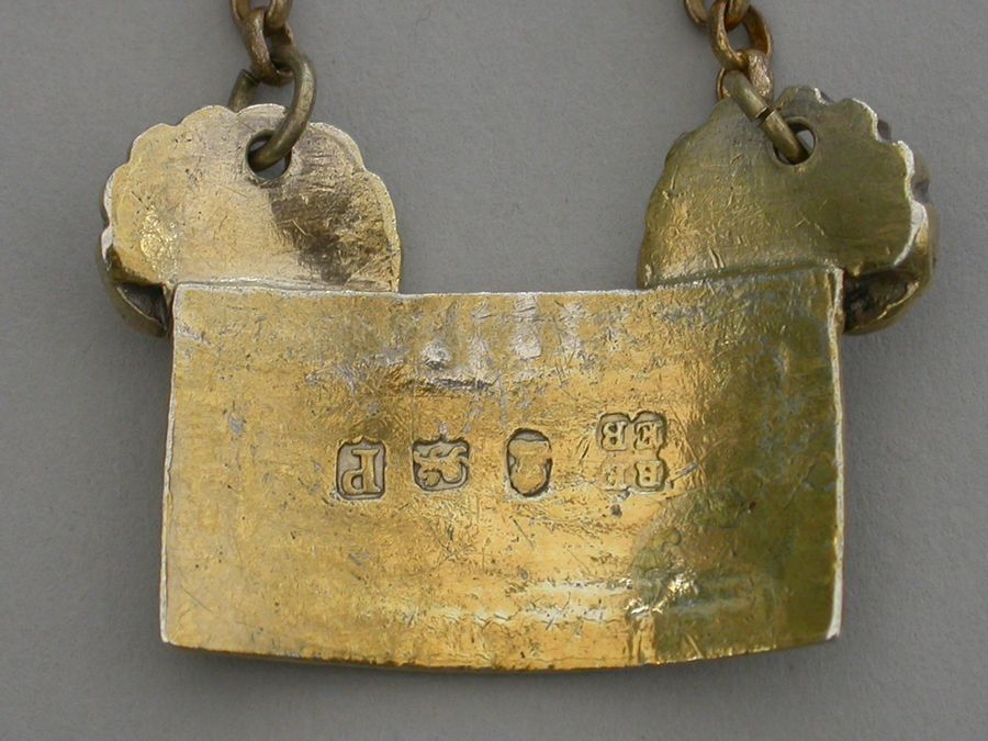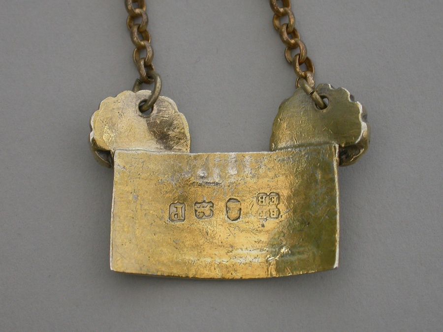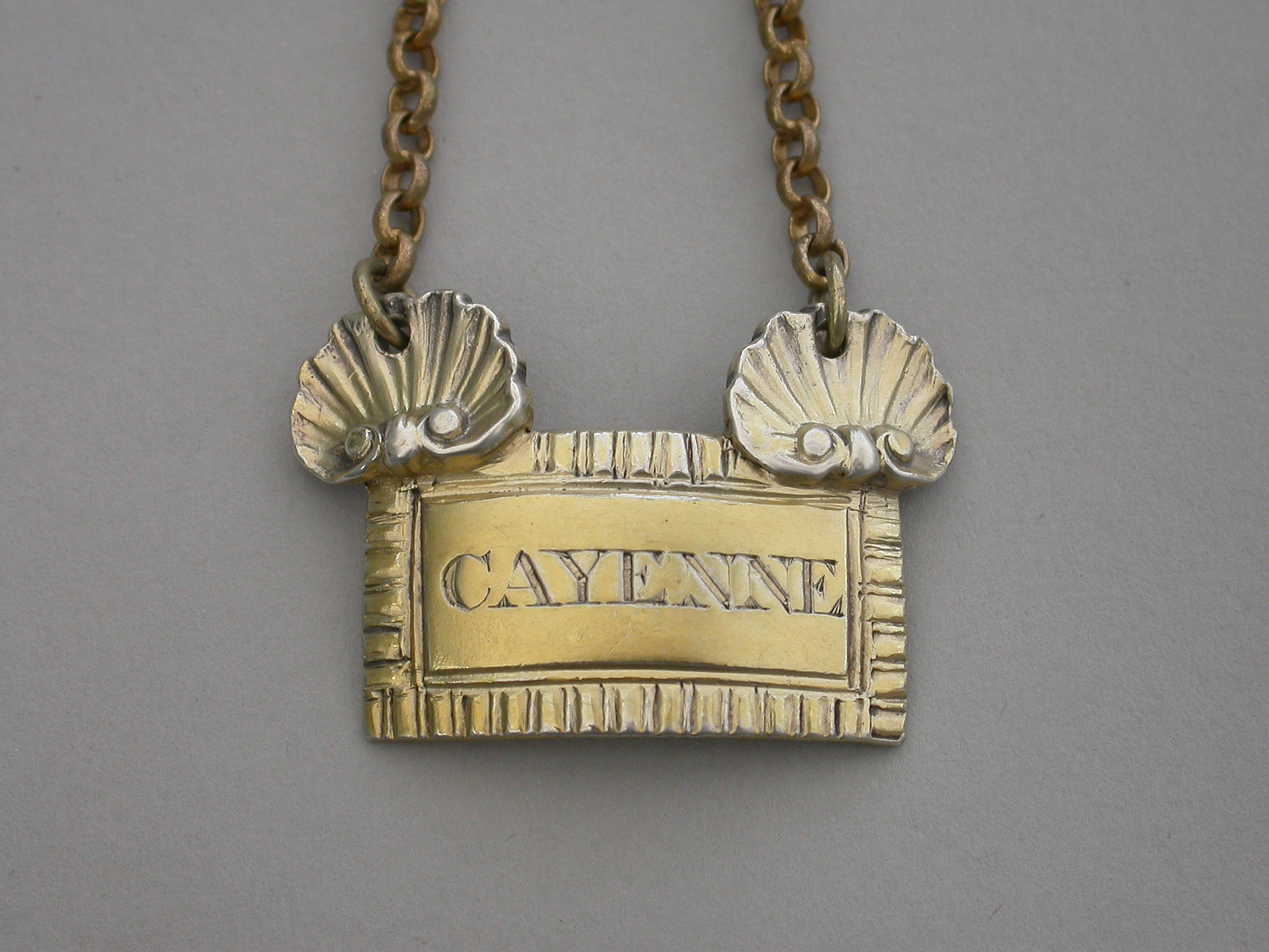 An extremely fine and rare George III cast silver gilt Sauce Label of broad rectangular form with gadrooned border, a large applied scallop shell to the top corners from which the suspension chain is attached. Incised for CAYENNE.