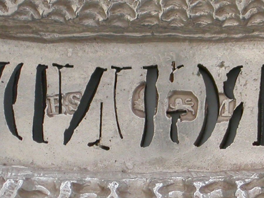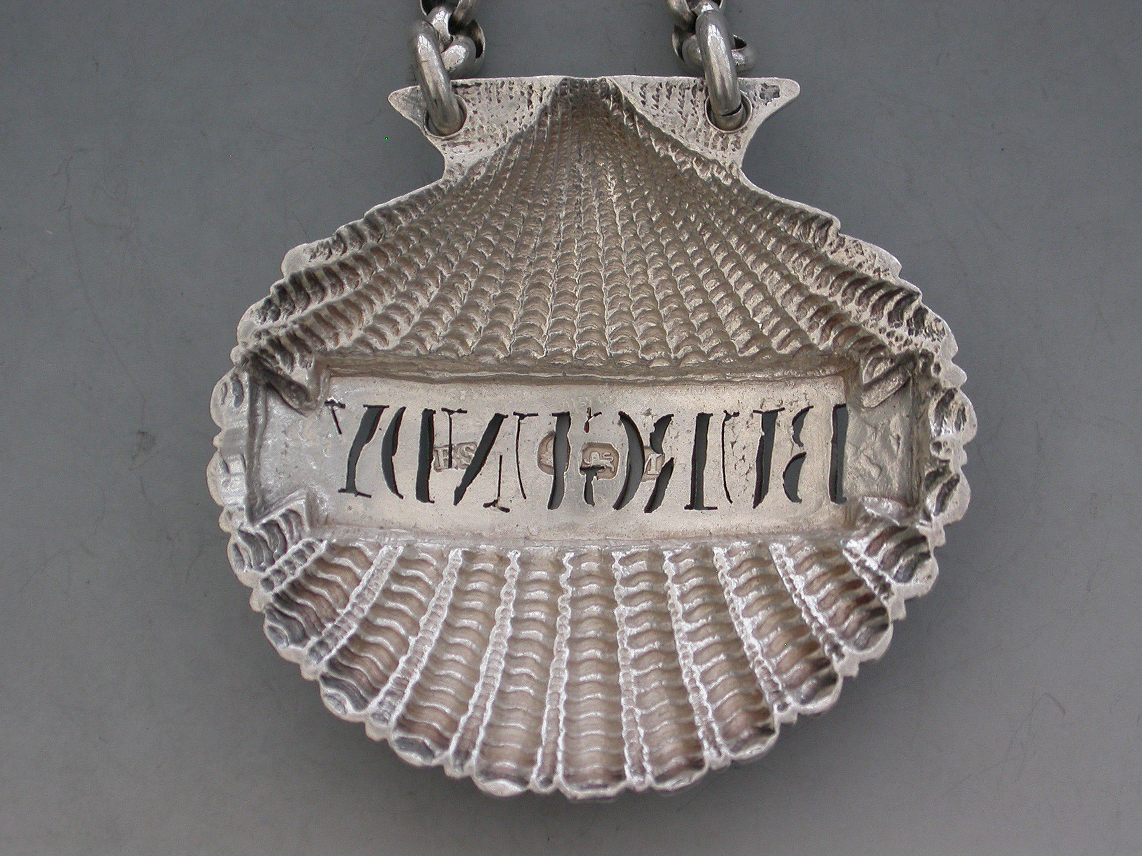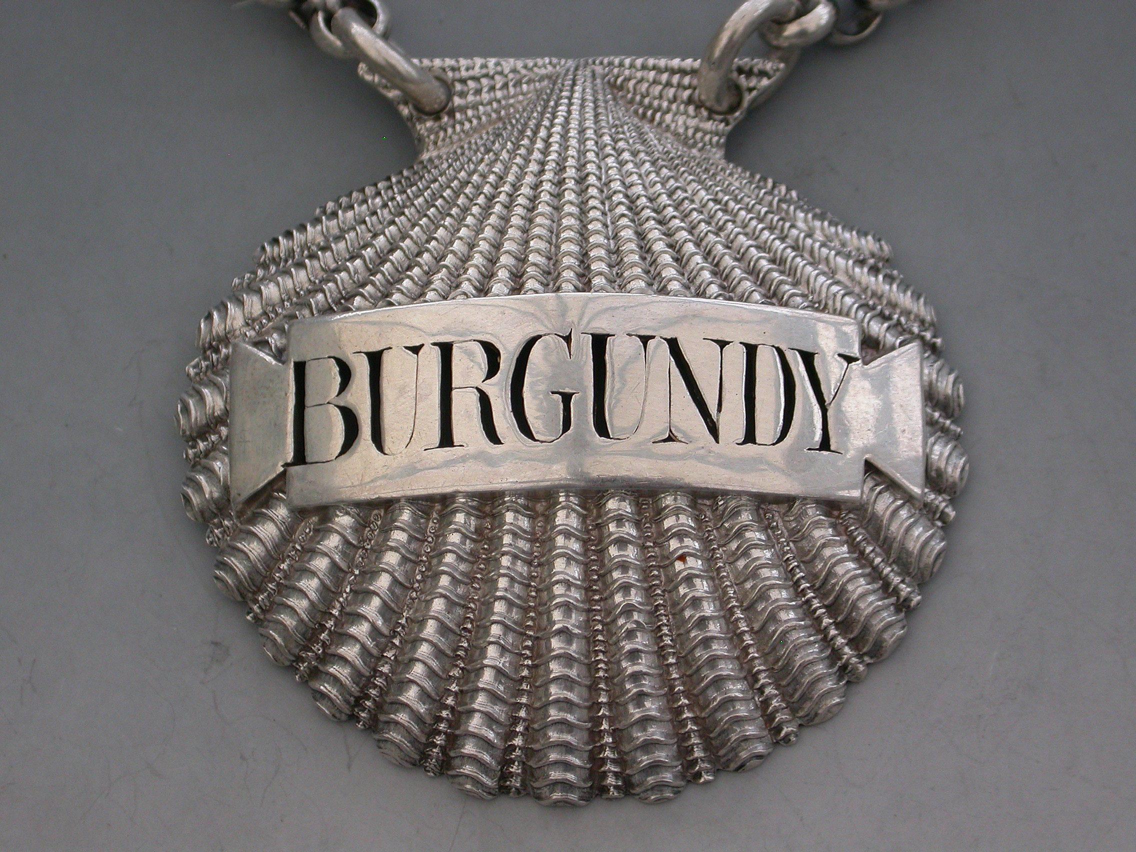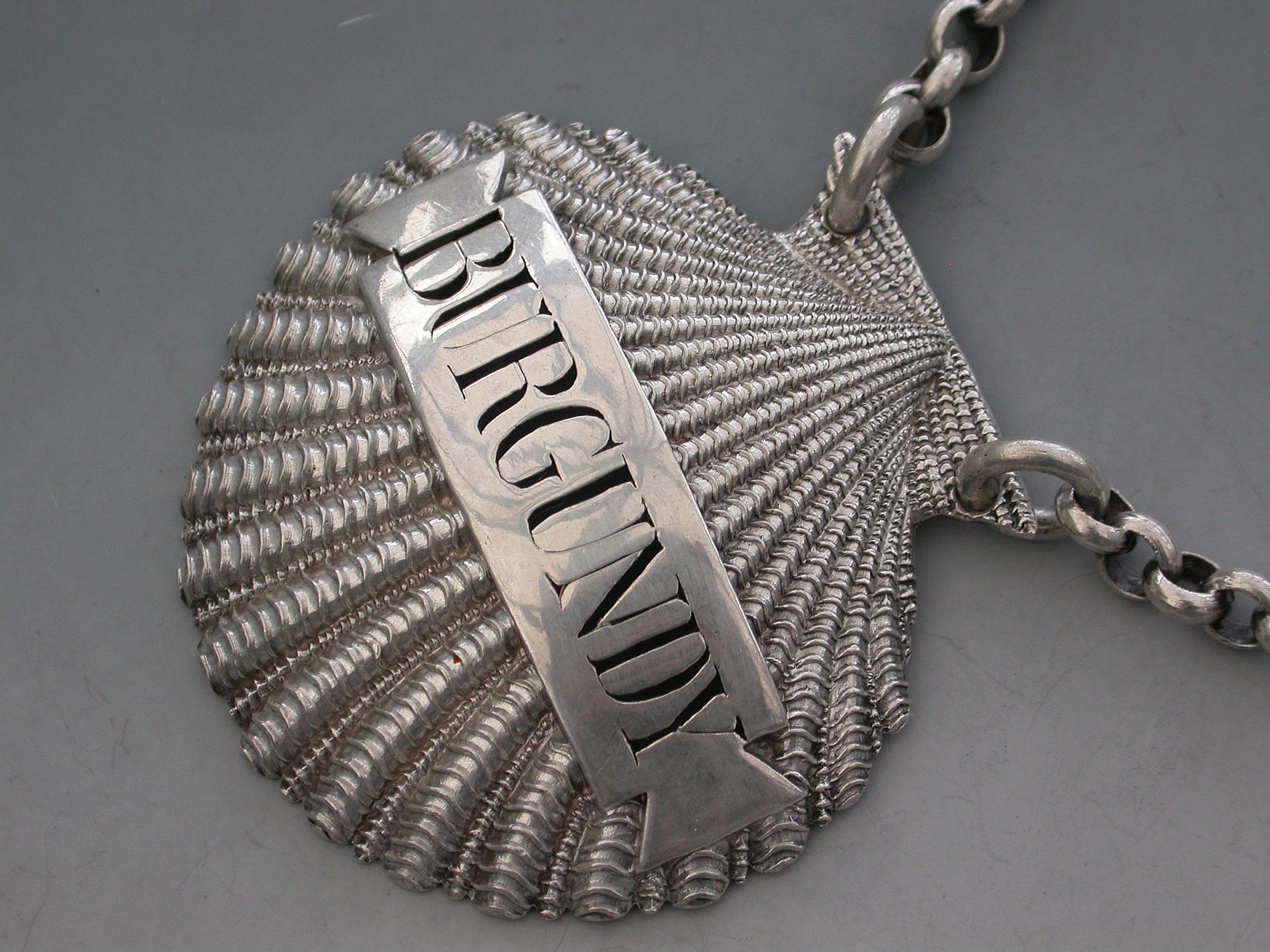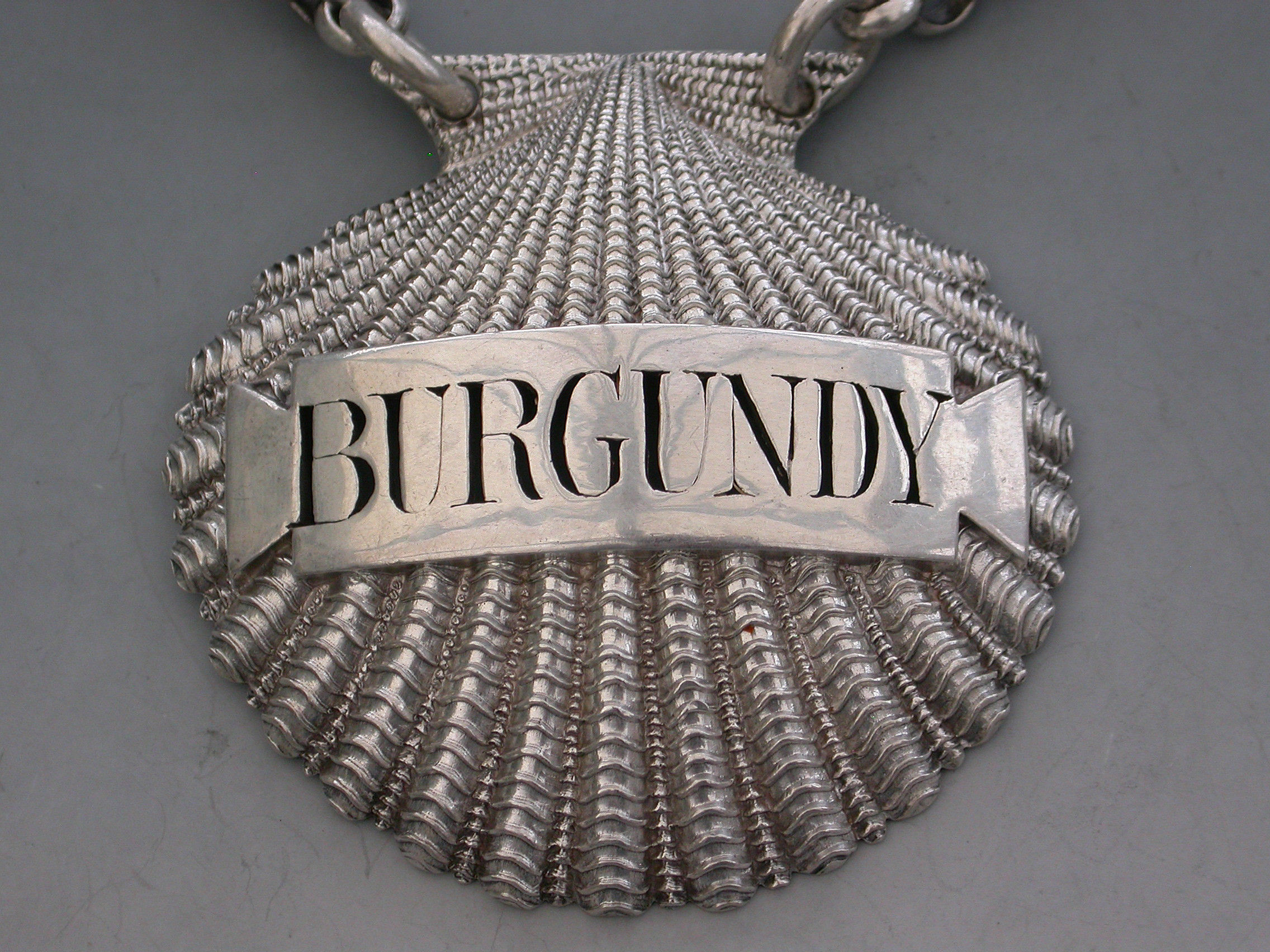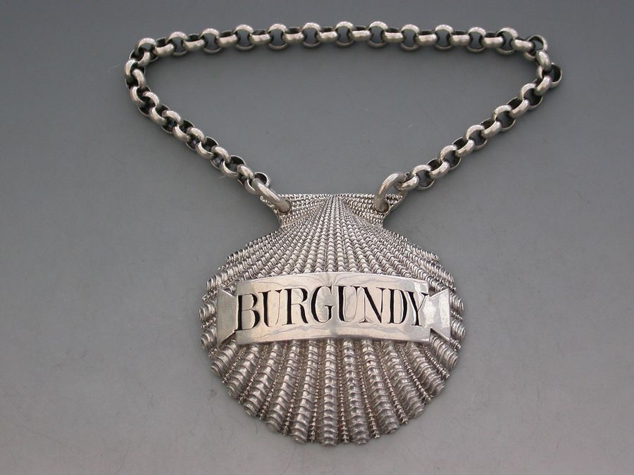 A very fine and rare George III heavy cast silver Wine Label made in the form of a scallop shell, the shaped name plate pierced for Burgundy.