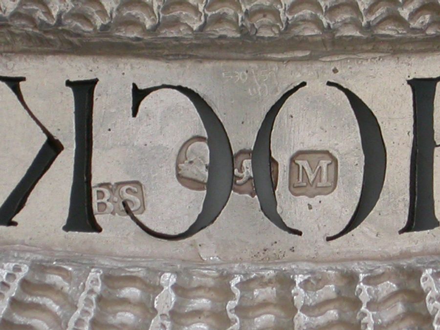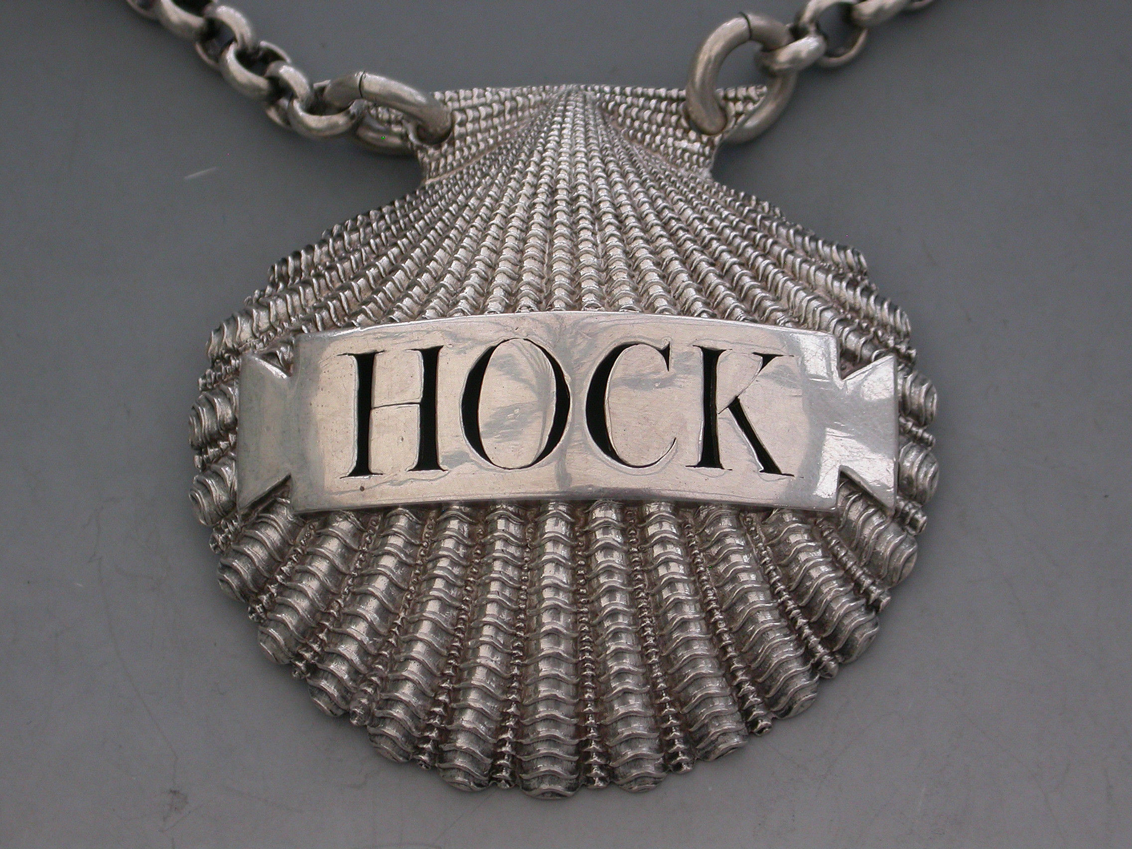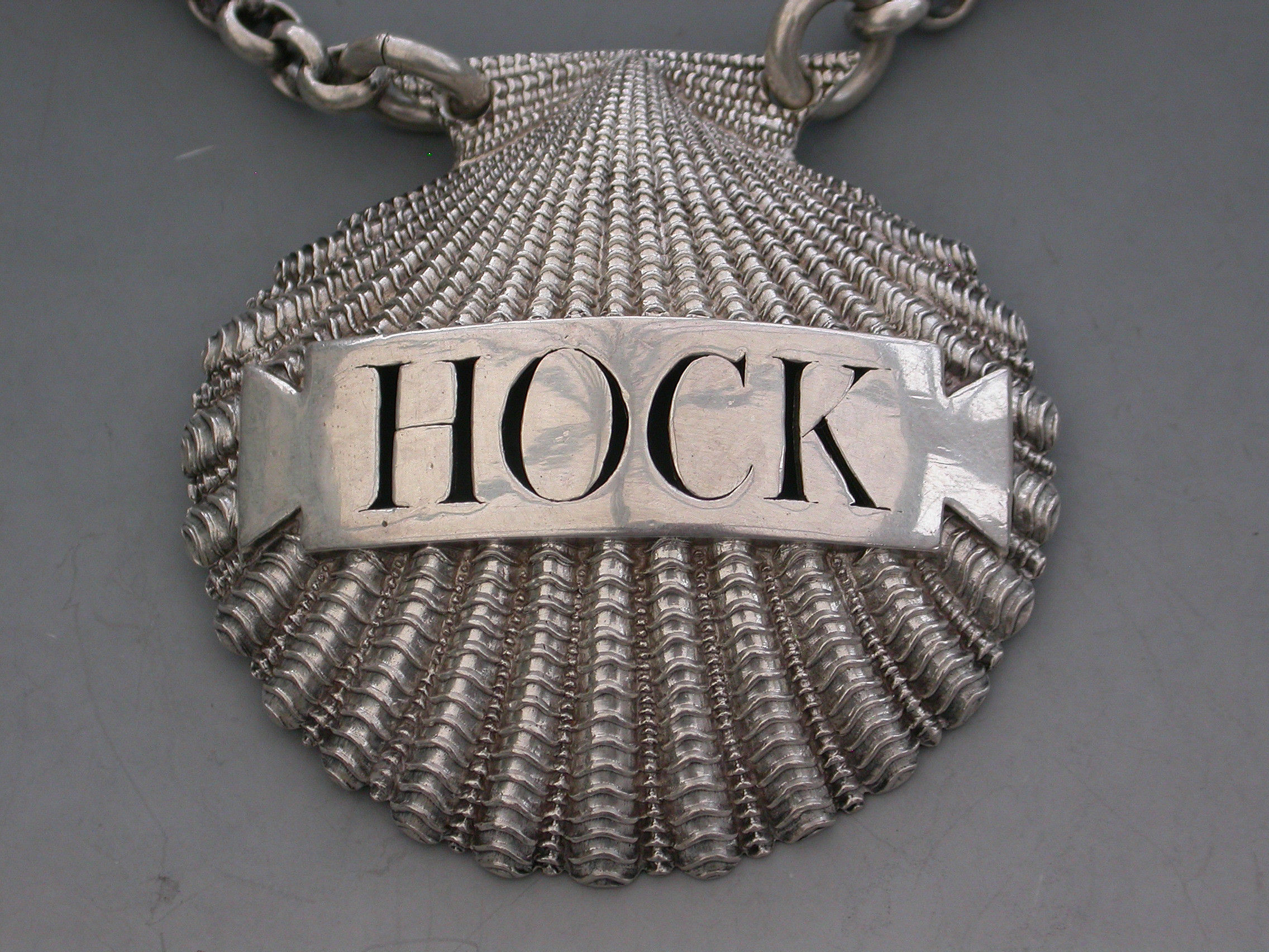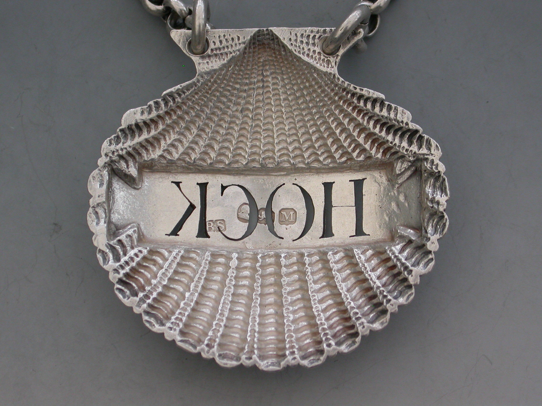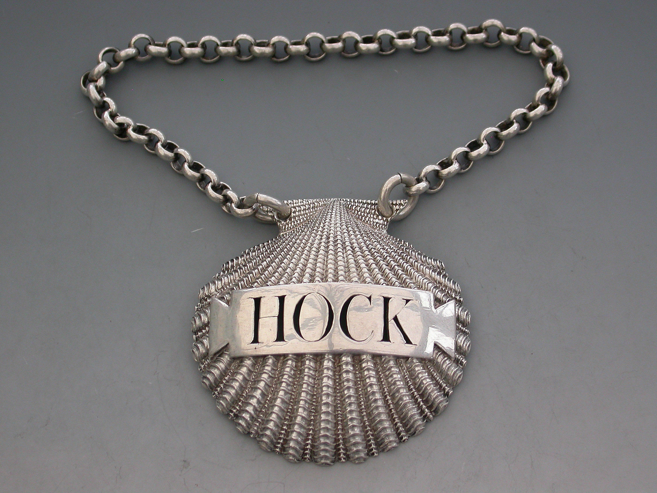 A very fine and rare George III heavy cast silver Wine Label made in the form of a scallop shell, the shaped name plate pierced for Hock.