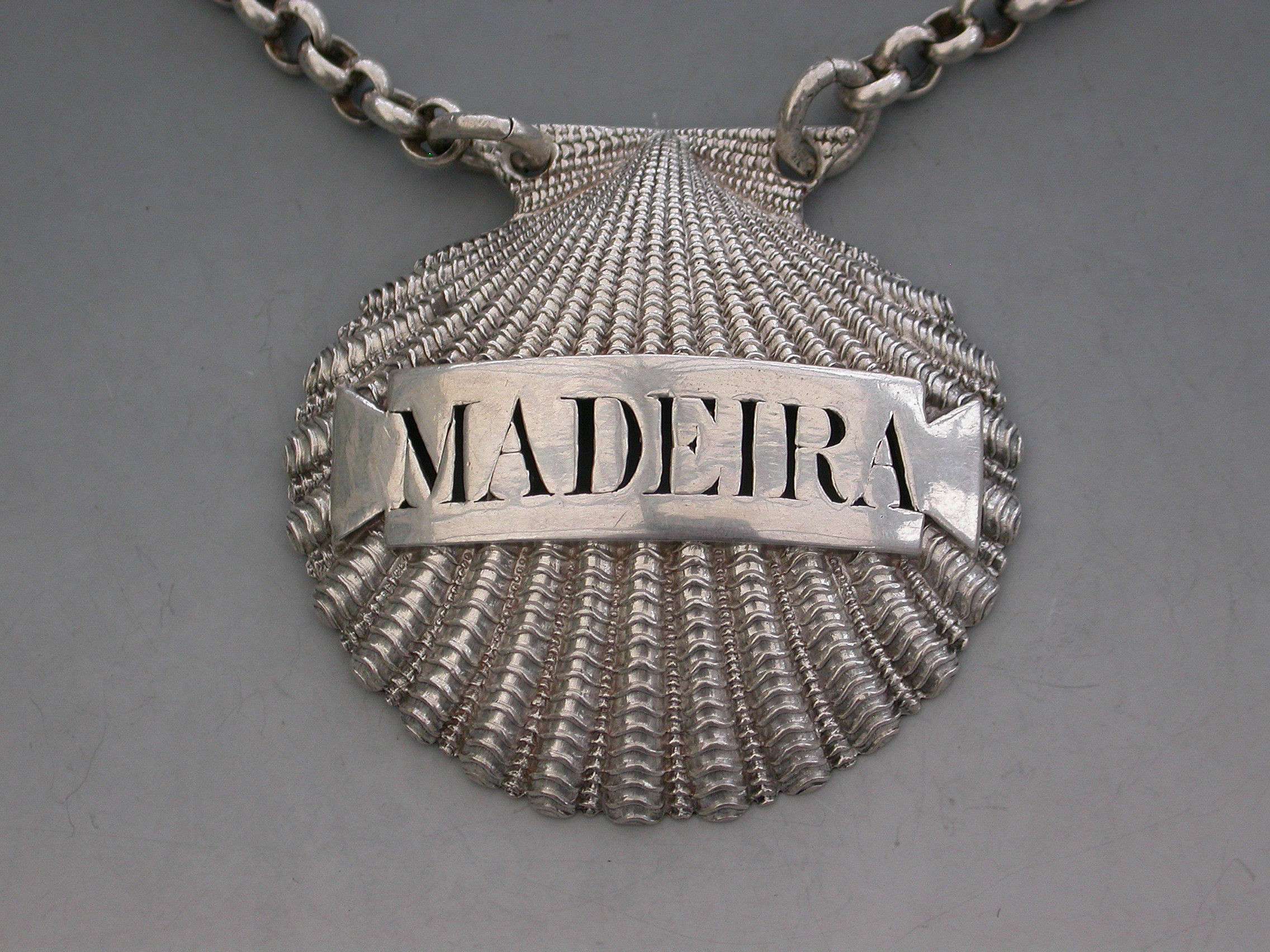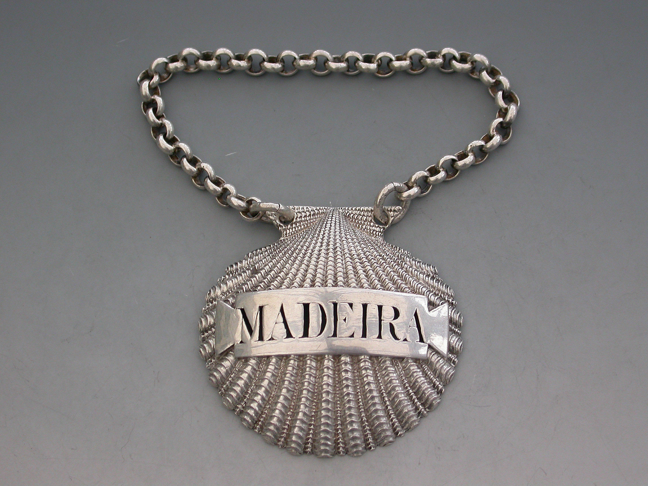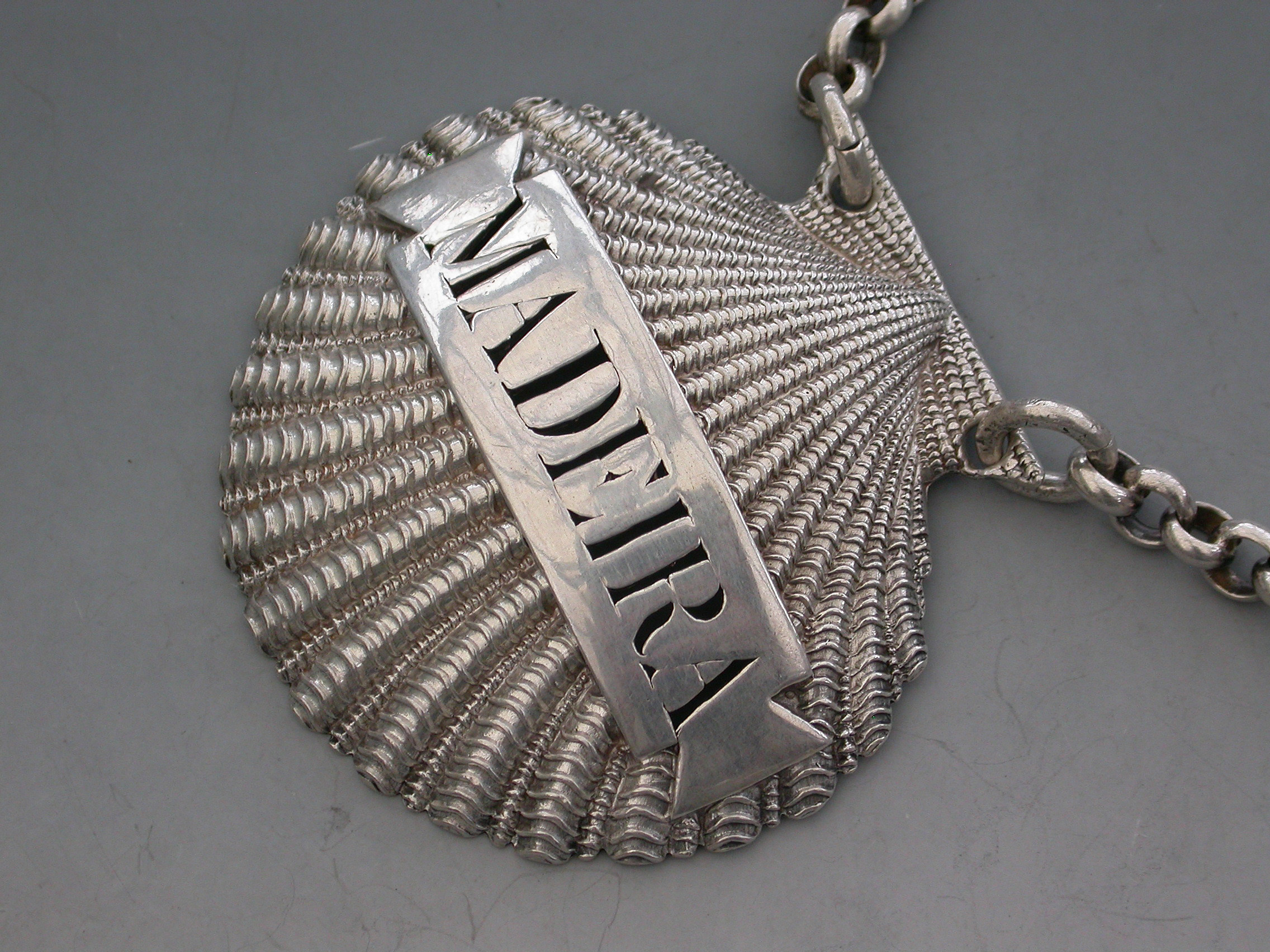 A very fine and rare George III heavy cast silver Wine Label made in the form of a scallop shell, the shaped name plate pierced for Madeira.