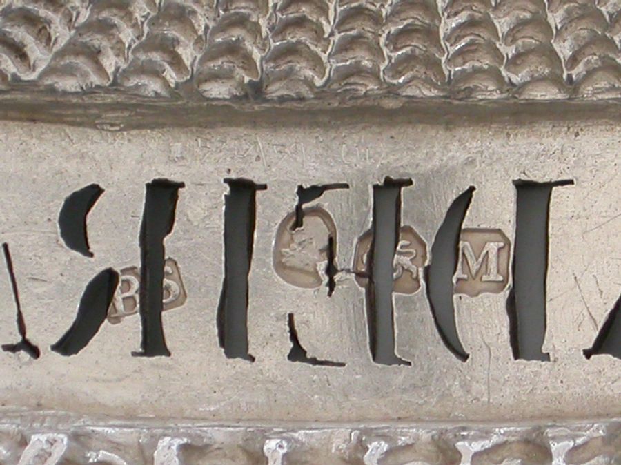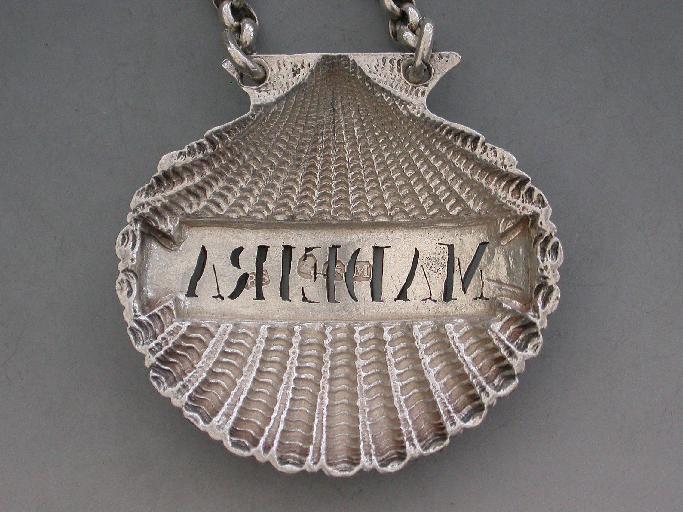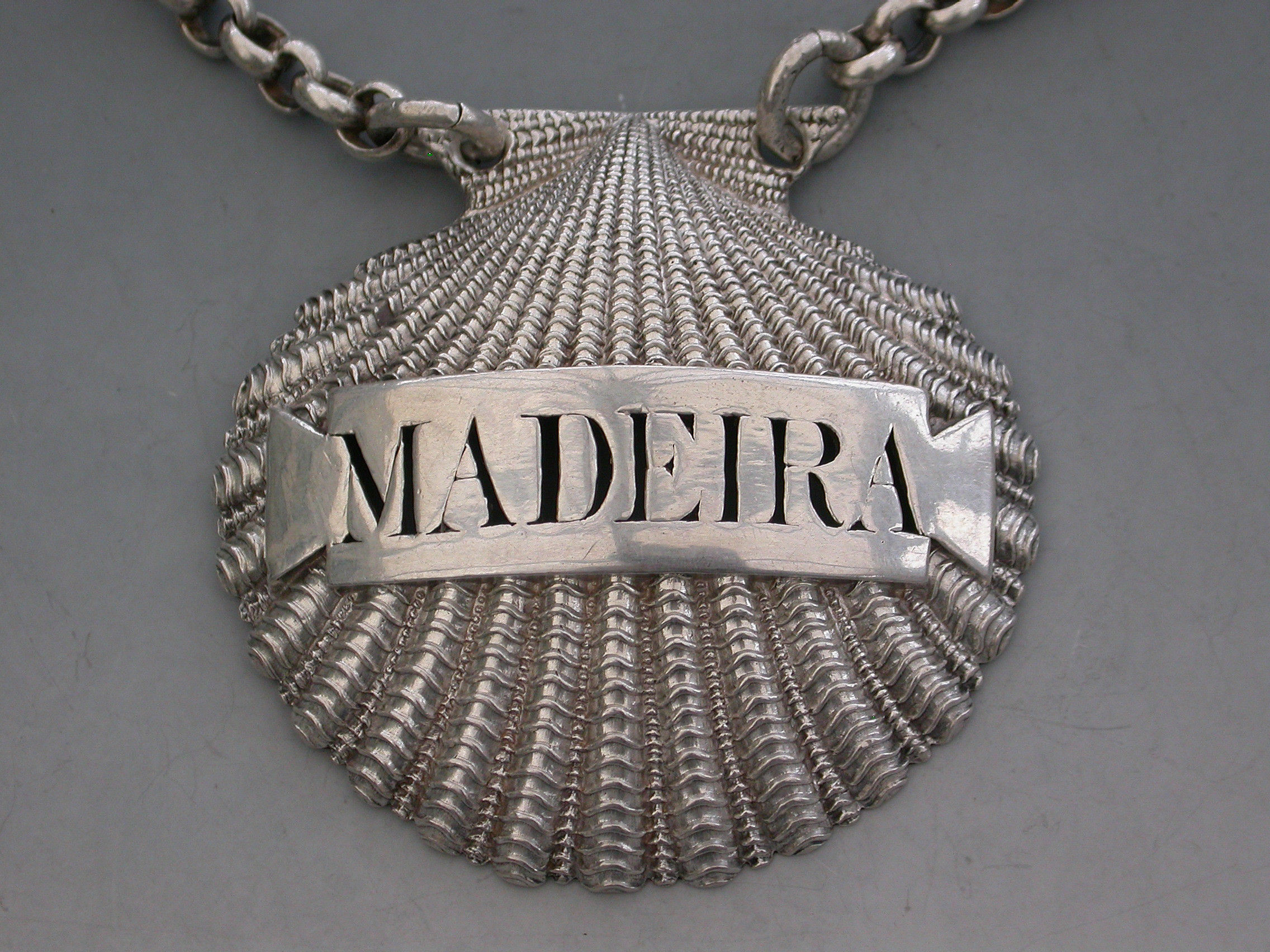 A very fine and rare George III heavy cast silver Wine Label made in the form of a scallop shell, the shaped name plate pierced for Madeira.