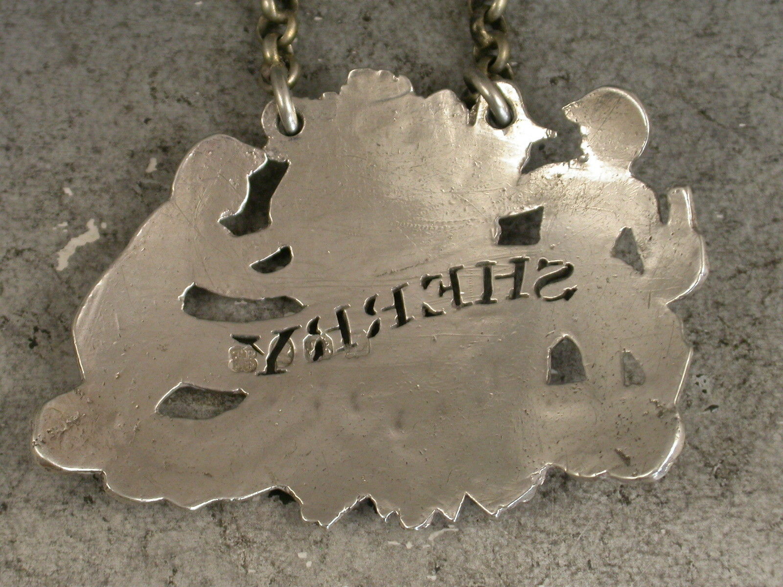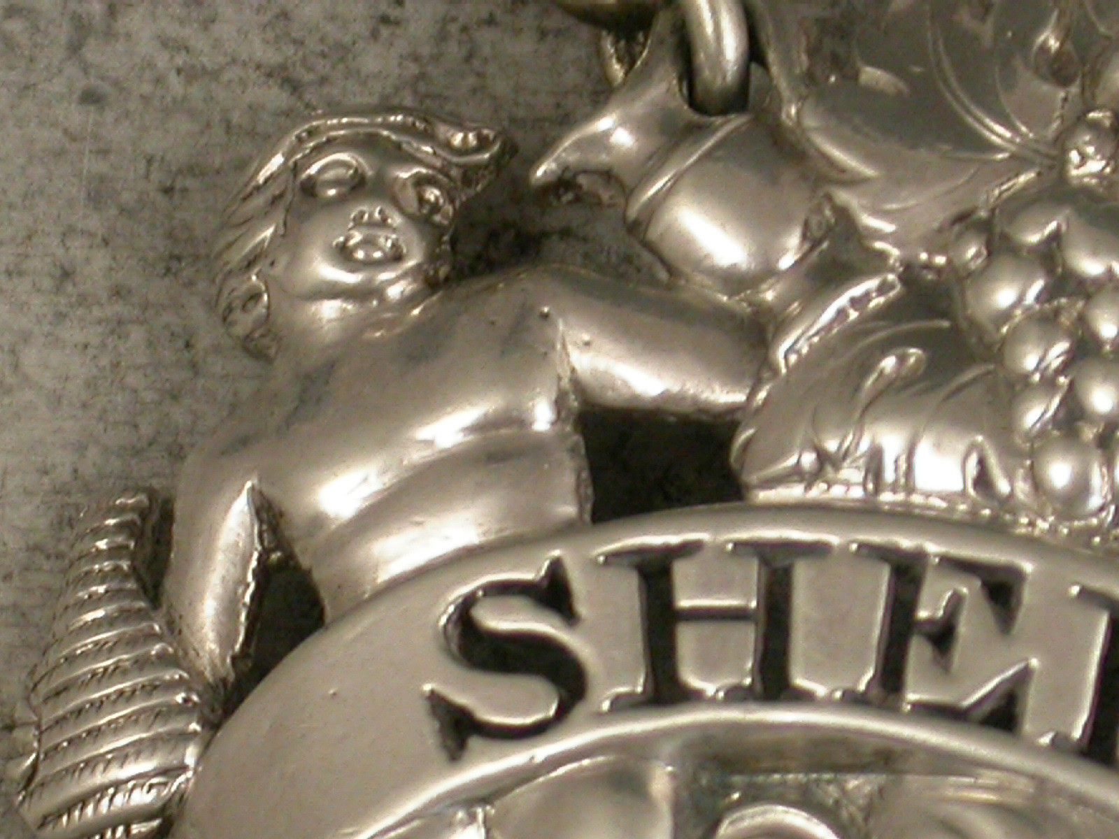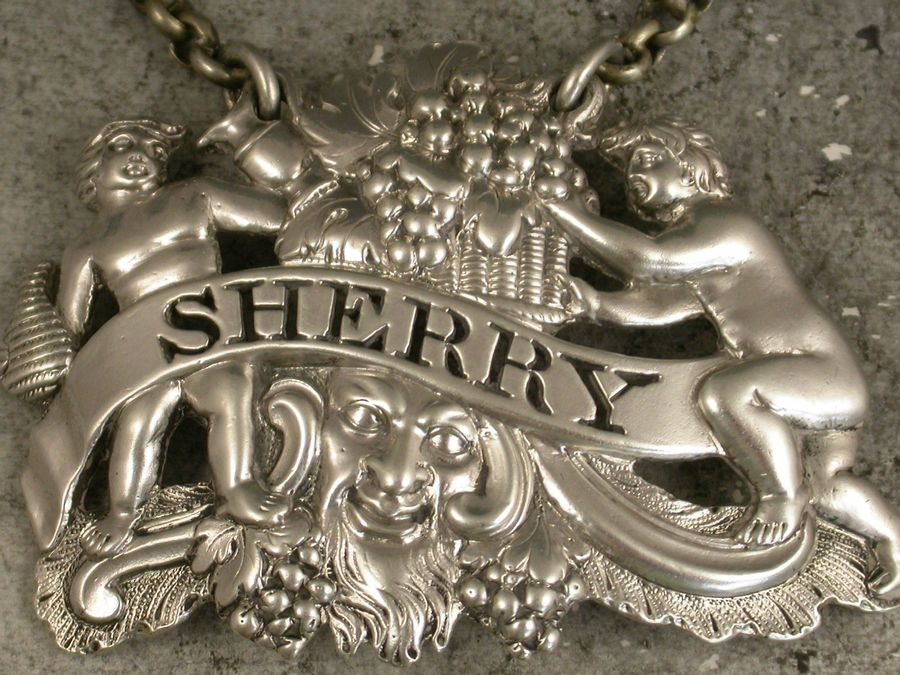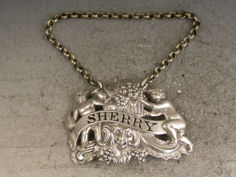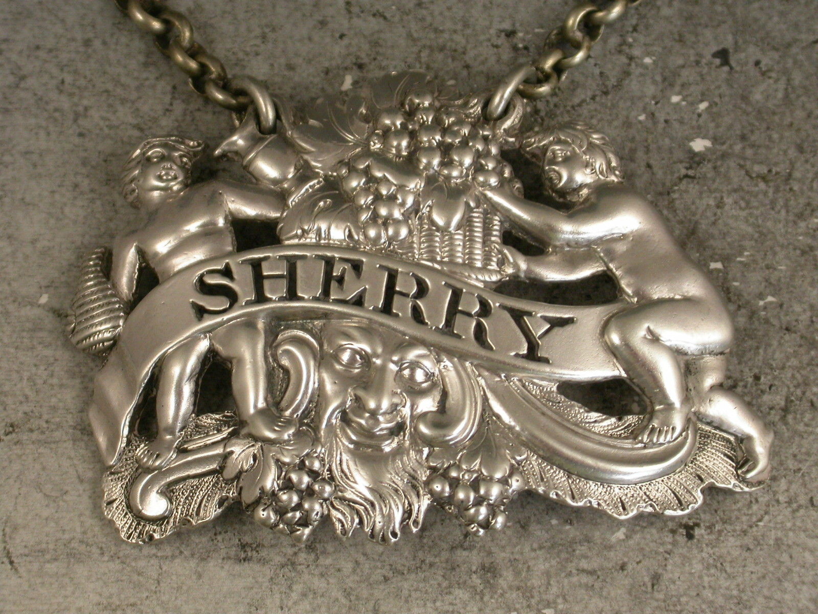 George III Cast Silver ""Two Putti with Jug & Bottle"" Wine Label 'Sherry'
