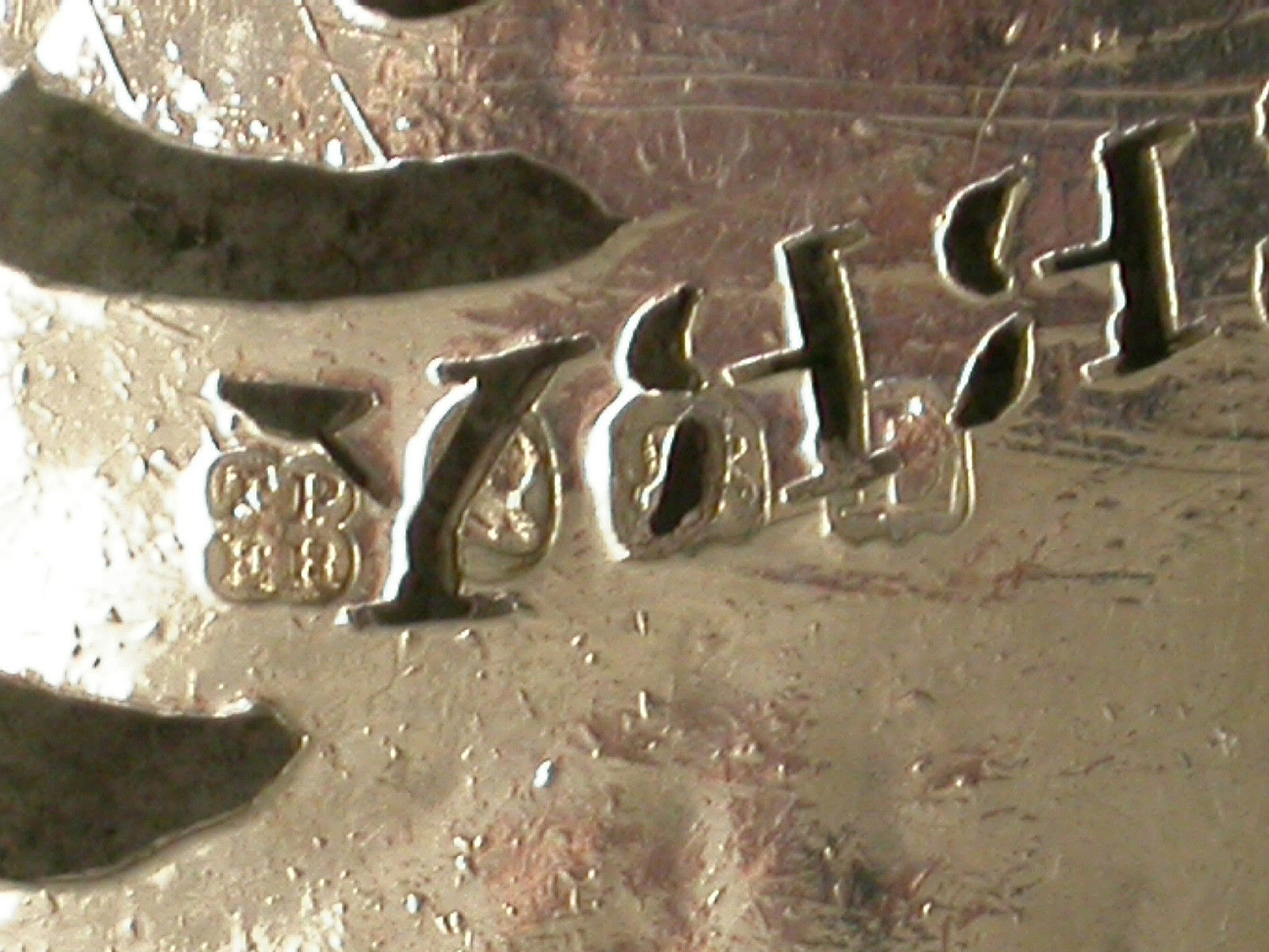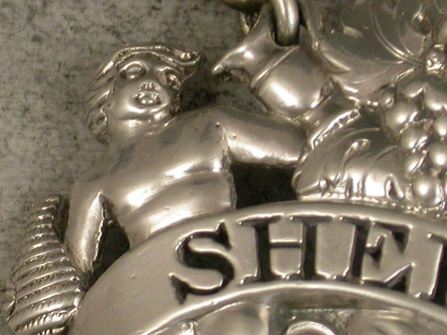 A very fine quality George III large and heavy cast silver Wine Label of ""two putti with jug and bottle"" form depicting two naked boys, one holding a jug and bottle the other with a basket of grapes, both supporting a scroll shaped name panel pierced for Sherry, a bearded Bacchus mask below.
