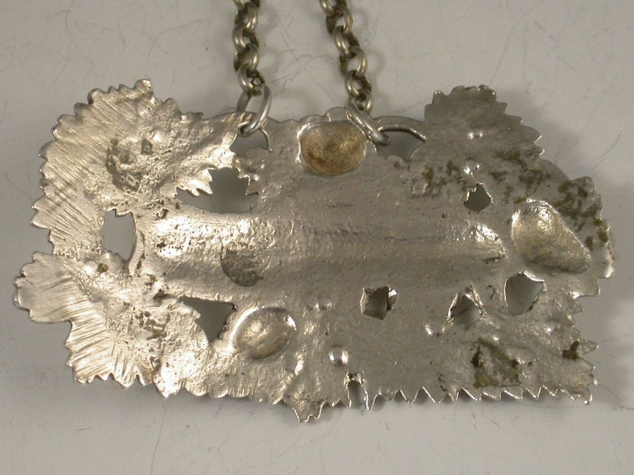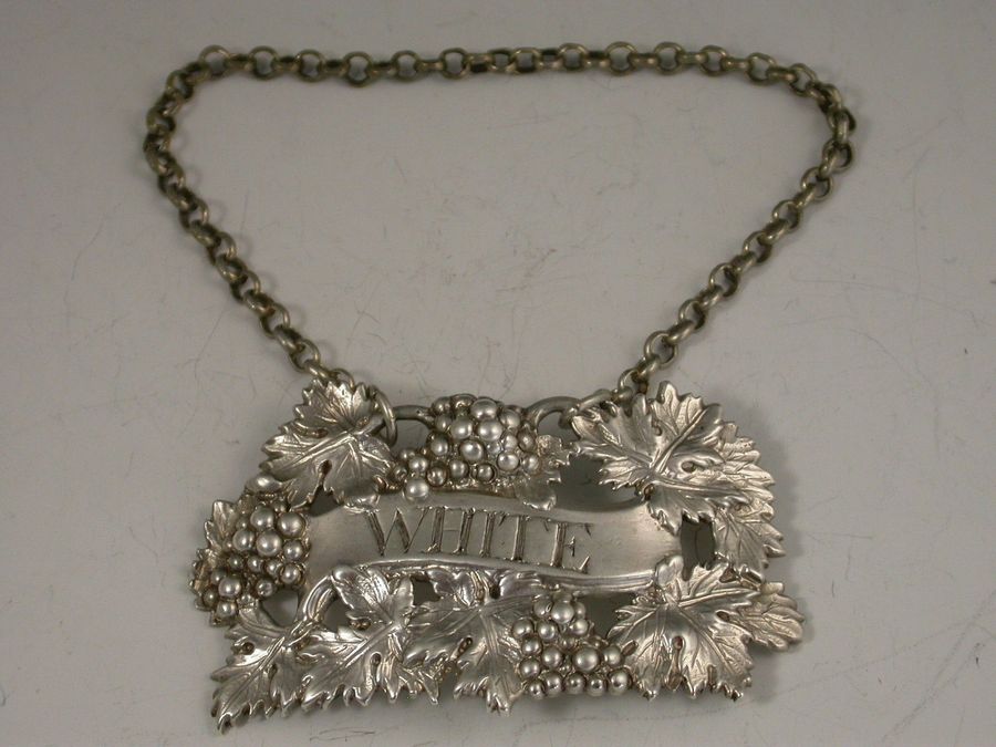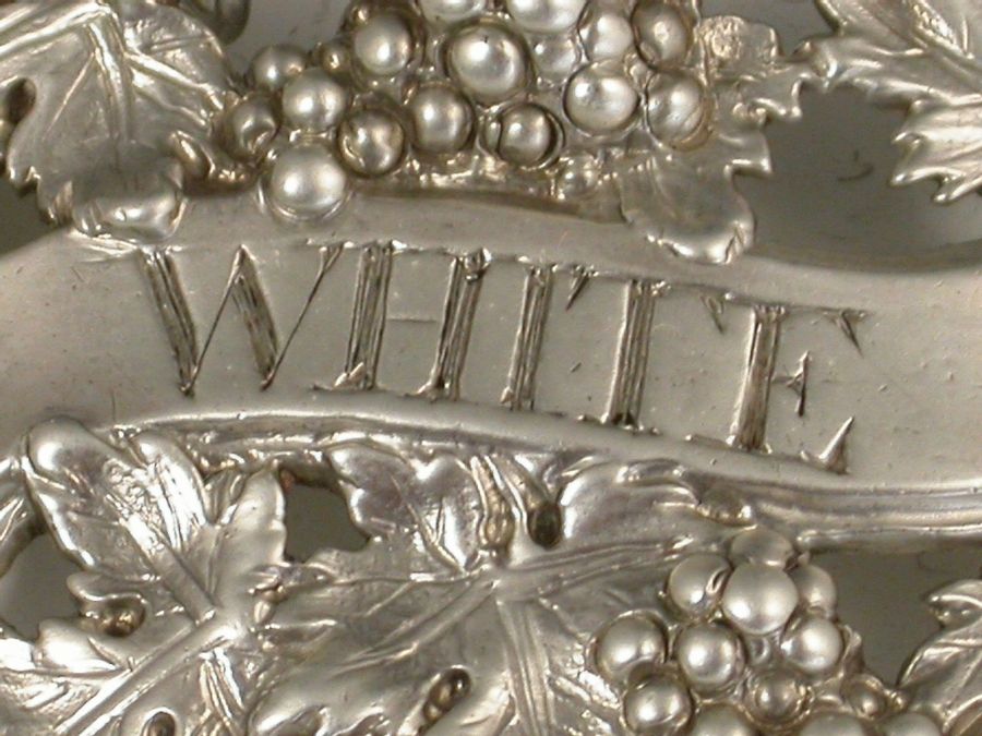 A fine quality heavy George III cast silver Wine Label, the pierced design made up from vine leaves and grapes surrounding a scrolled name plate incised for White.