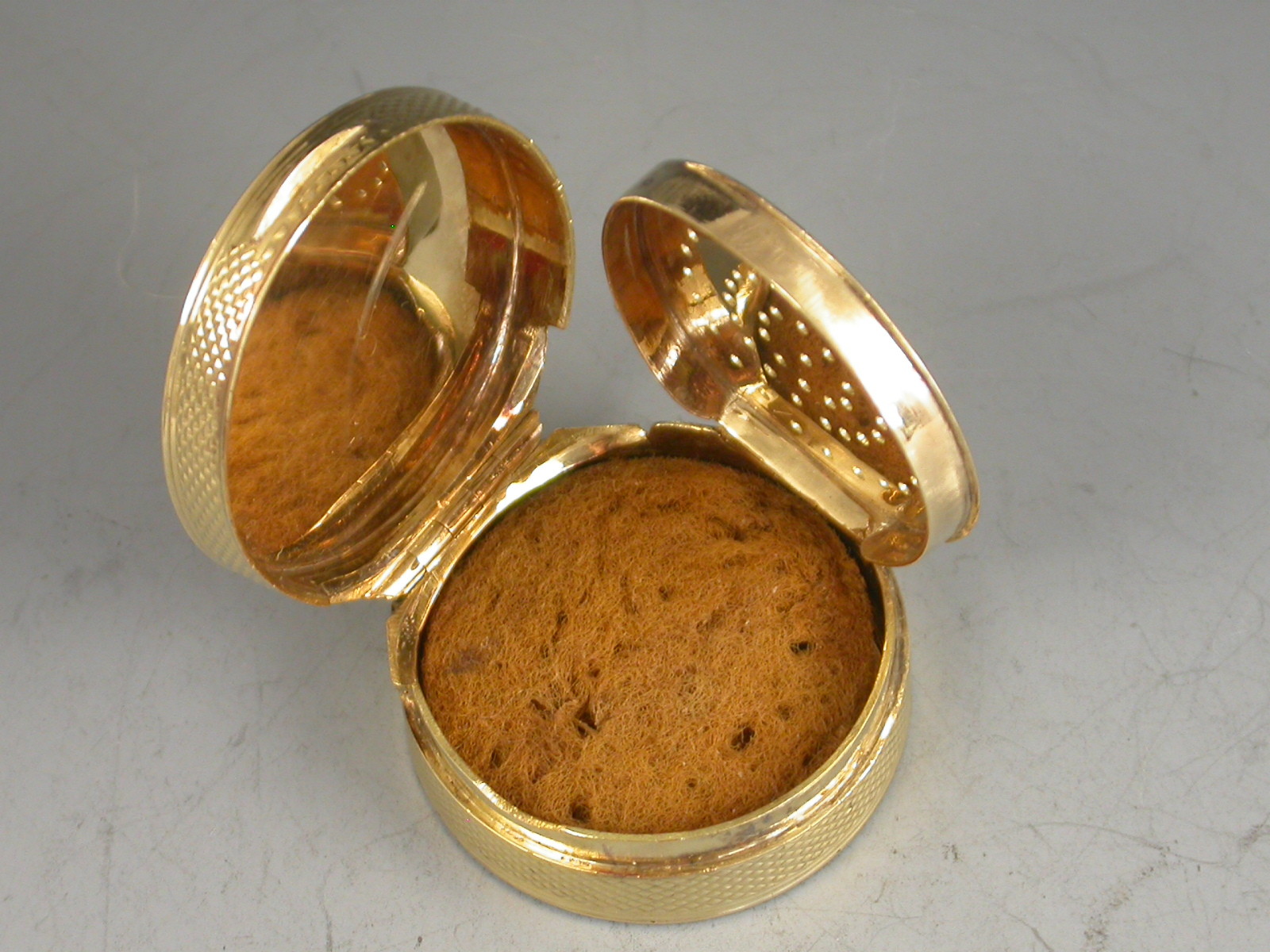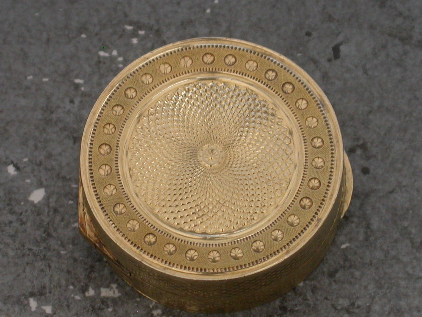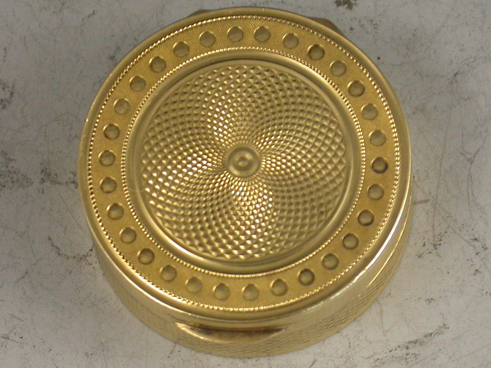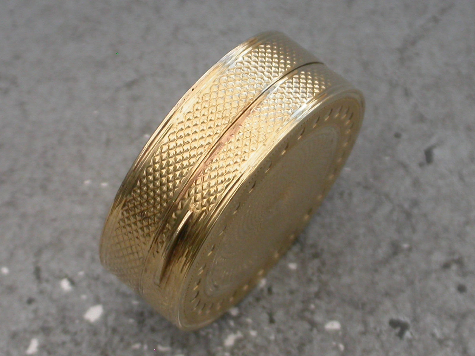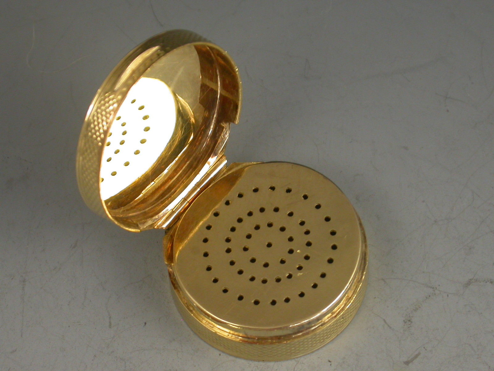 A good quality early 19th century gold Vinaigrette of circular form with hinged lid, engine turned decoration to the base, lid and sides with bands of pellets to the borders, a simply pierced internal hinged grille.
