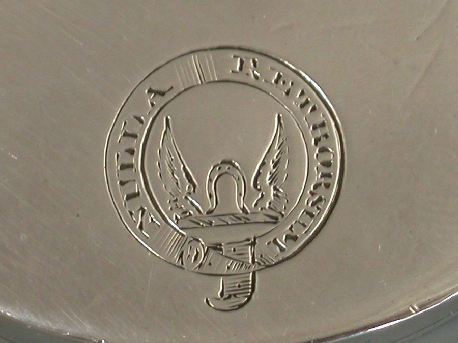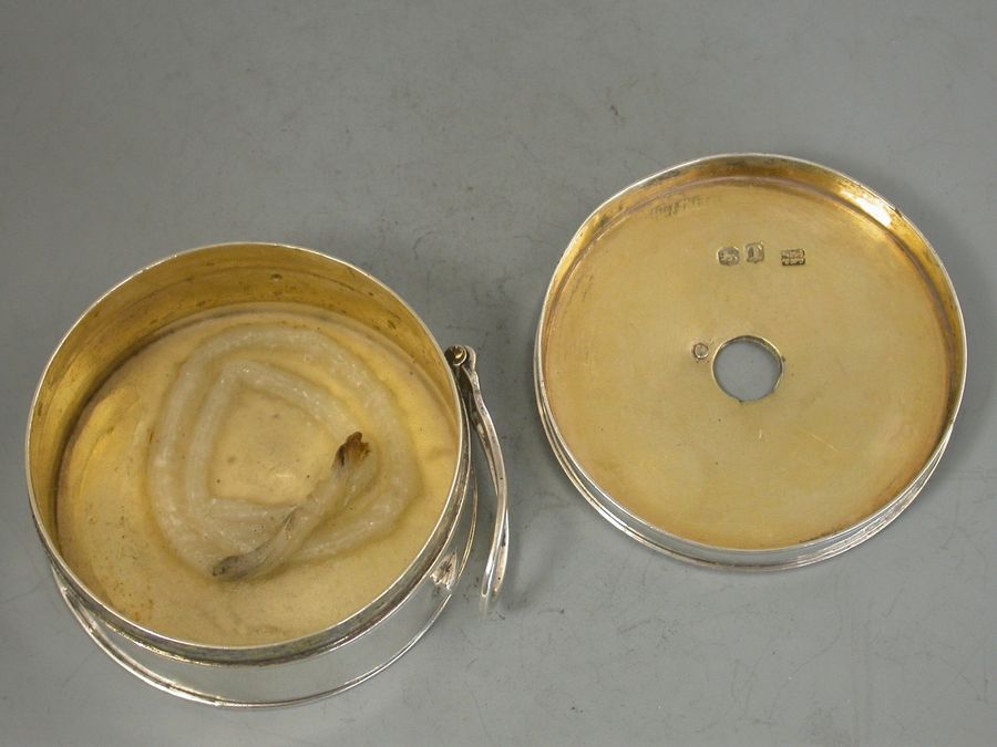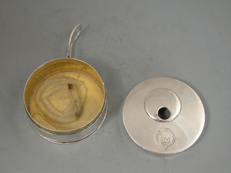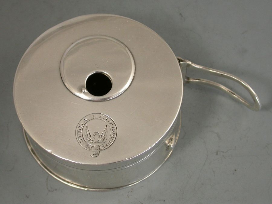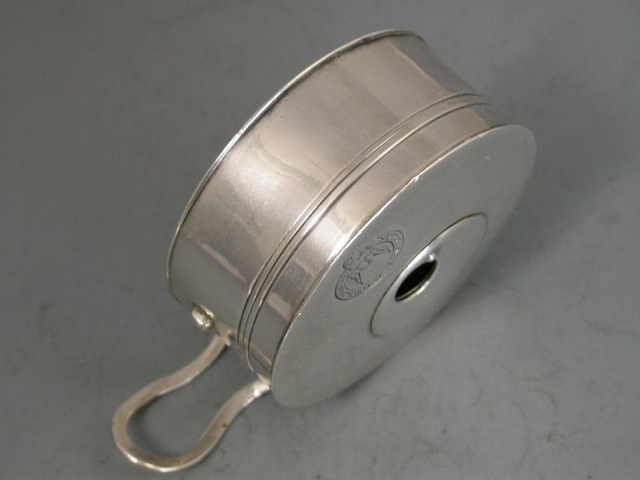 A good George III circular silver Bougie box and Cover with swing out loop handle and reeded rims, the cover engraved with a crest and motto.