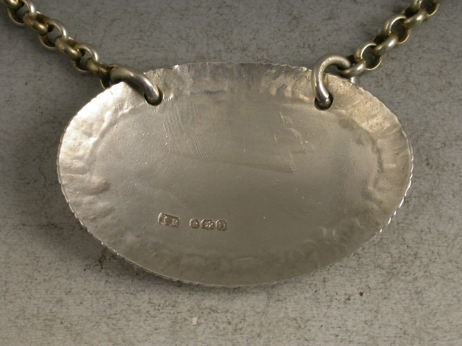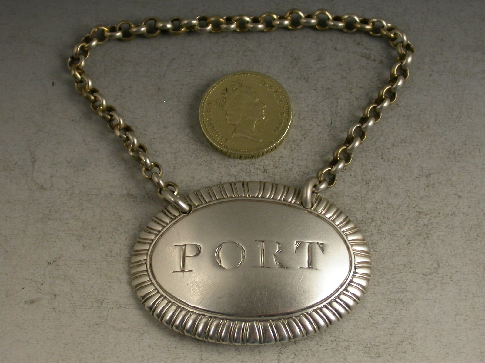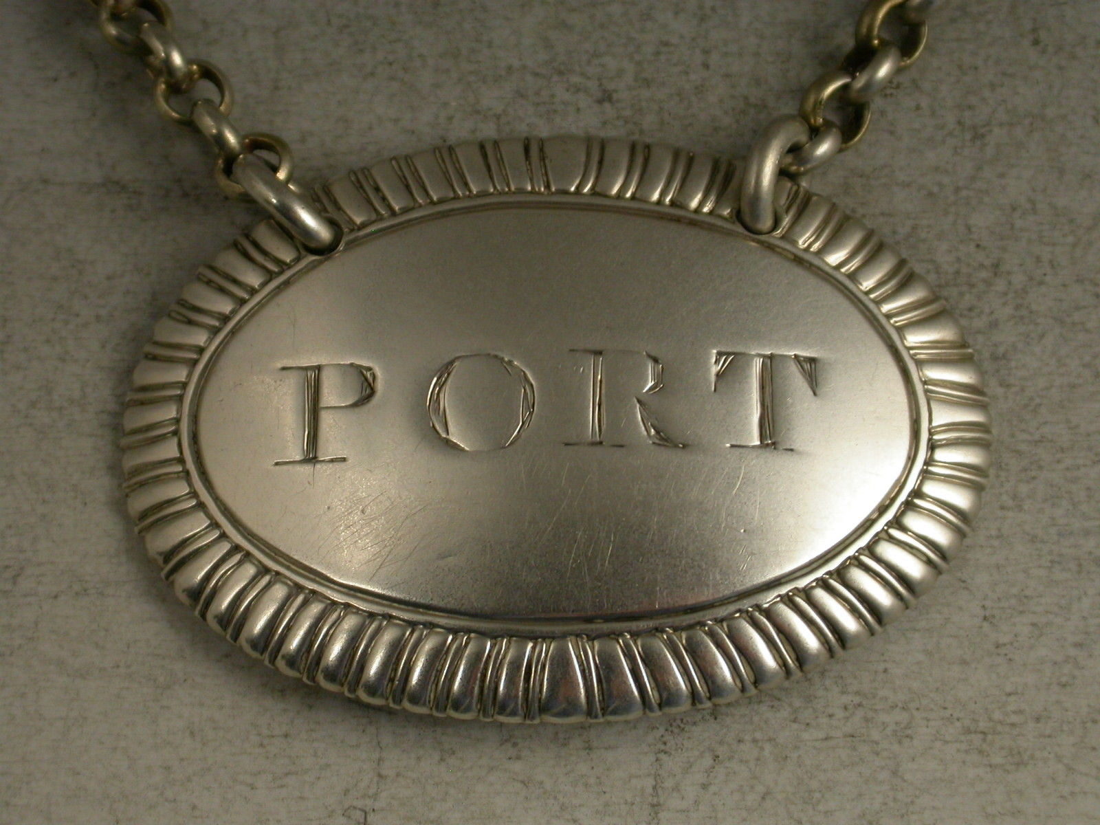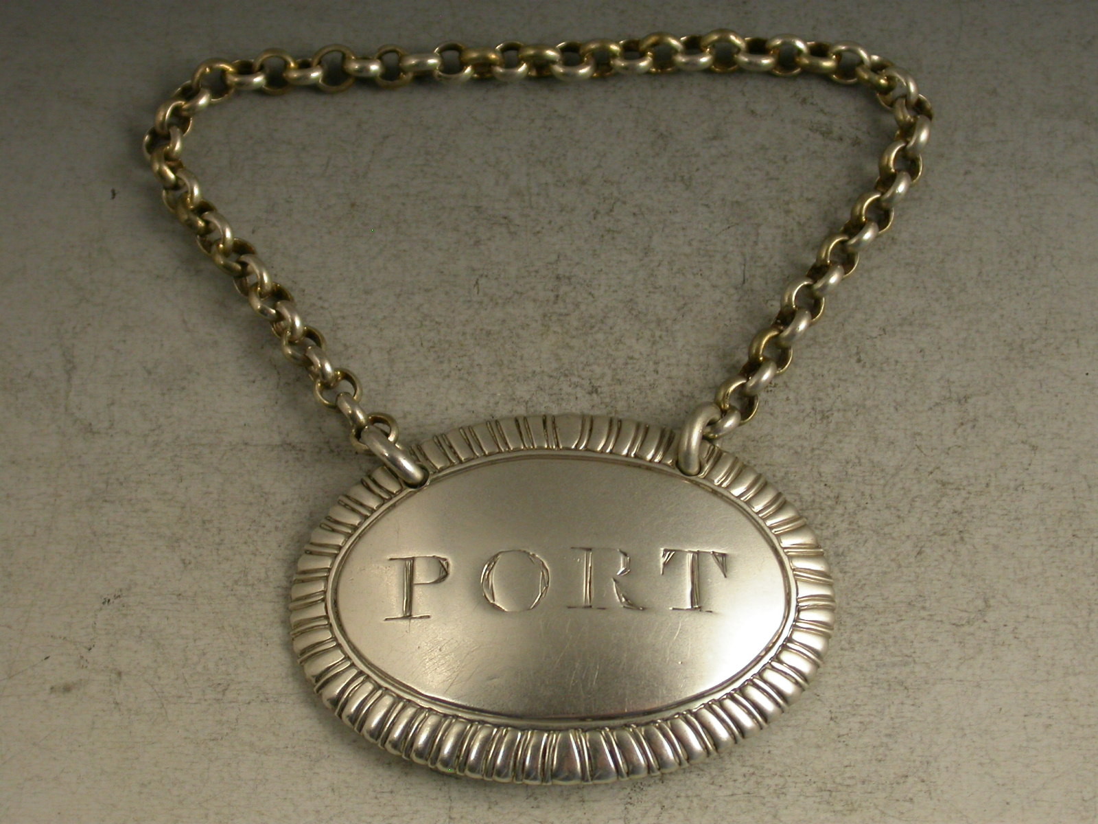A good George III large and heavy cast silver Wine Label of oval form with gardooned border, incised for Port. Heavy suspension chain.