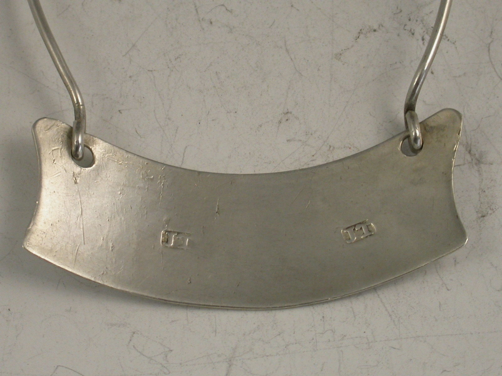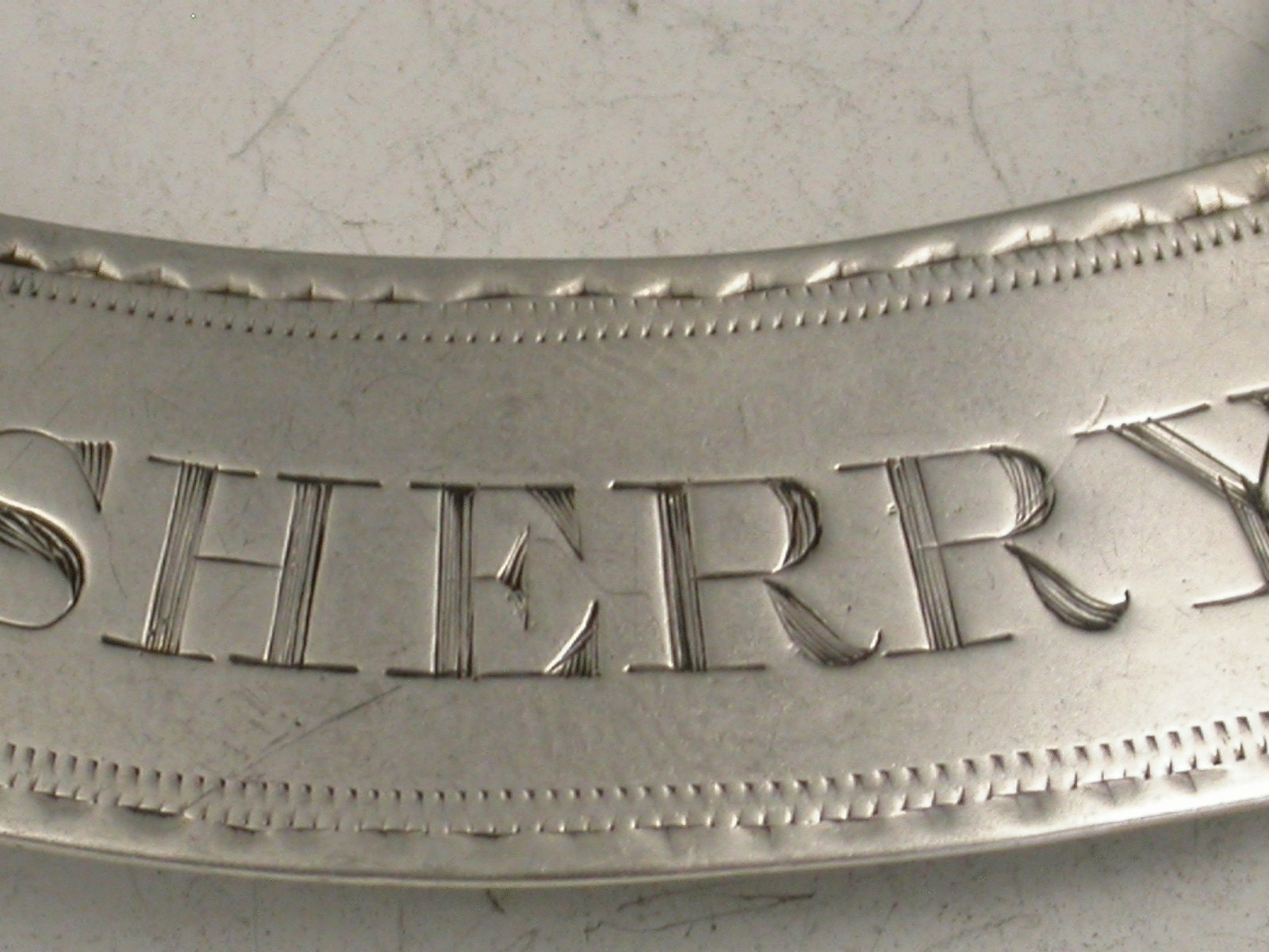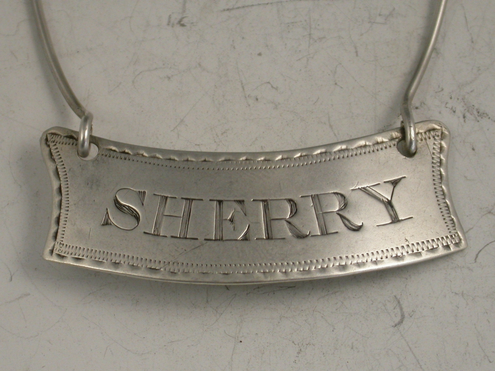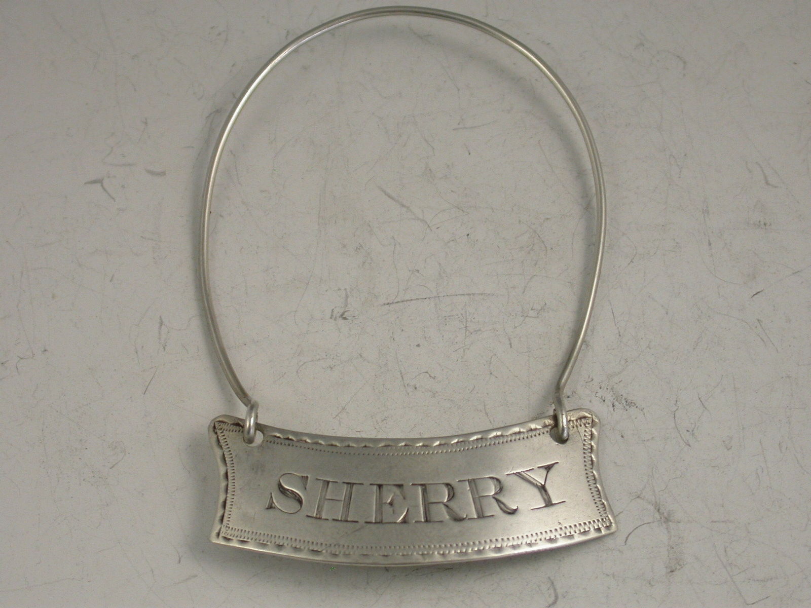 A rare George III Irish silver Wine Label of shallow crescent form with incurved sides and bright cut engraved feather edge border, incised for Sherry. Attached silver wire to form a neck ring support.