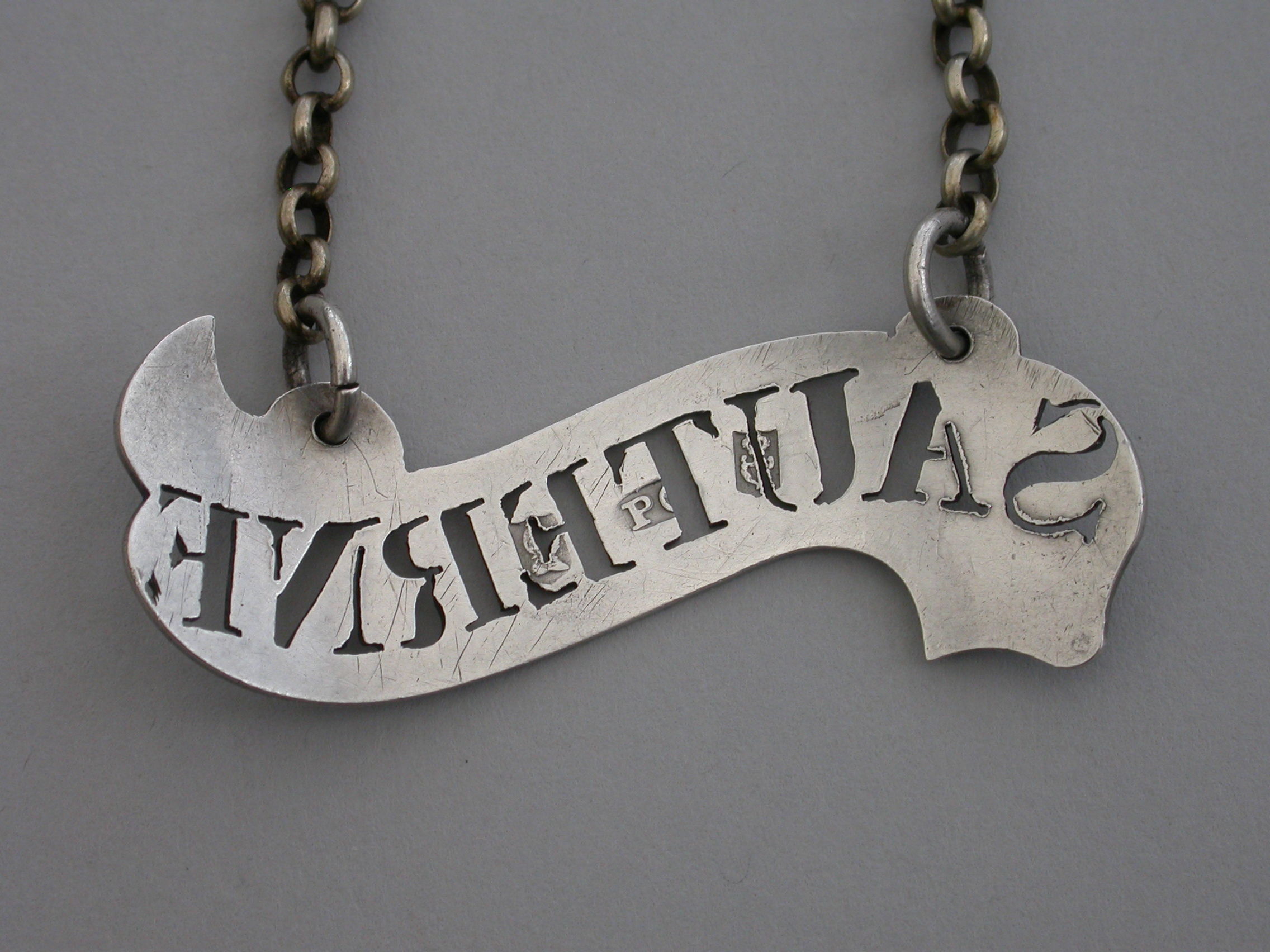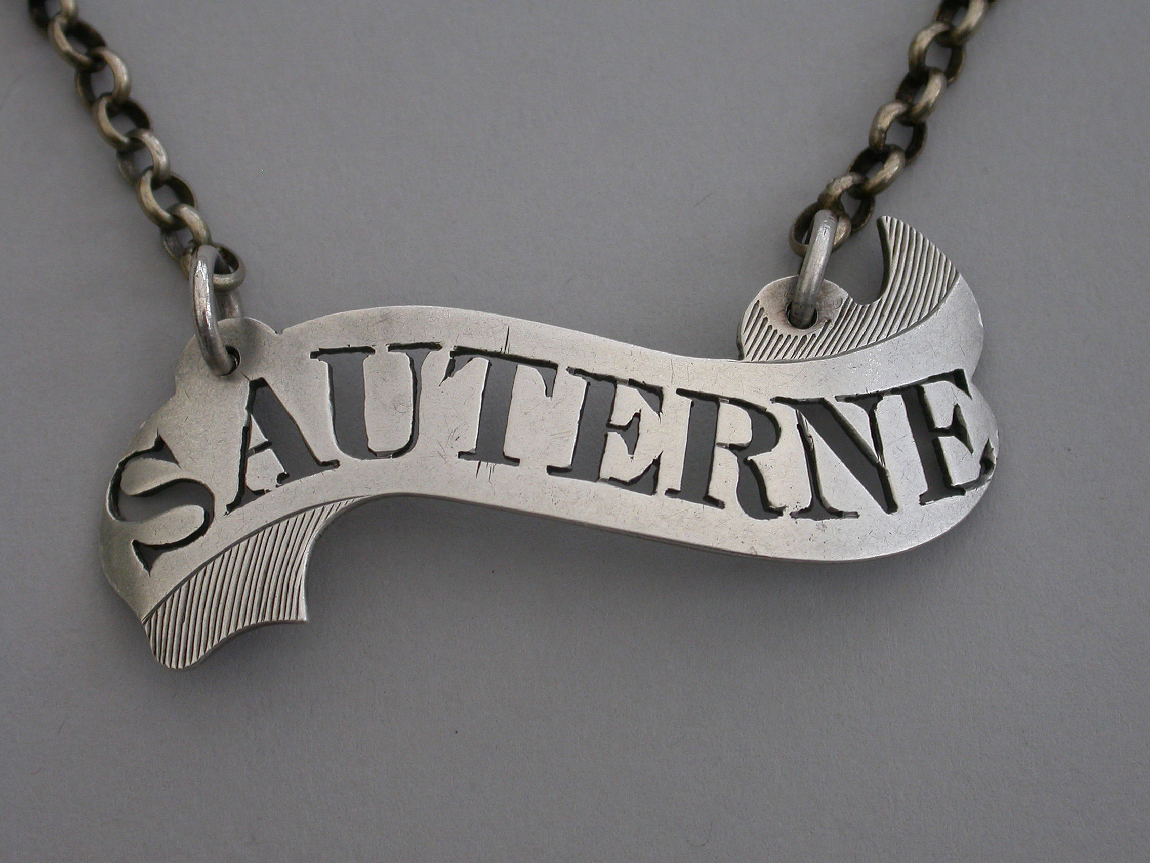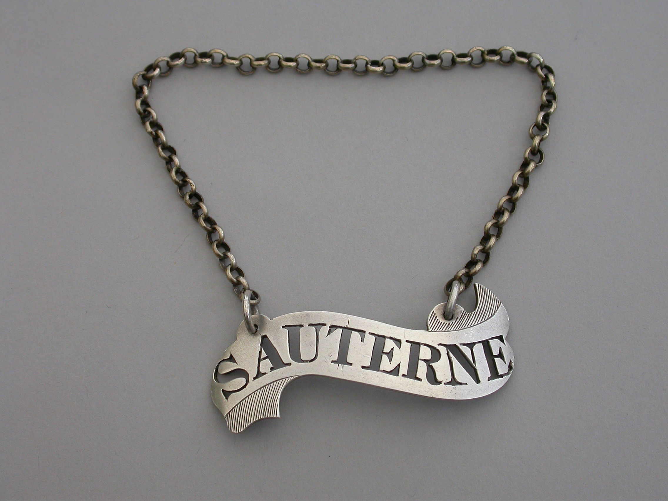 A rare George III Irish Provincial silver Wine Label of ""S"" scroll banner form with engraved hatched ends, pierced for Sauterne.