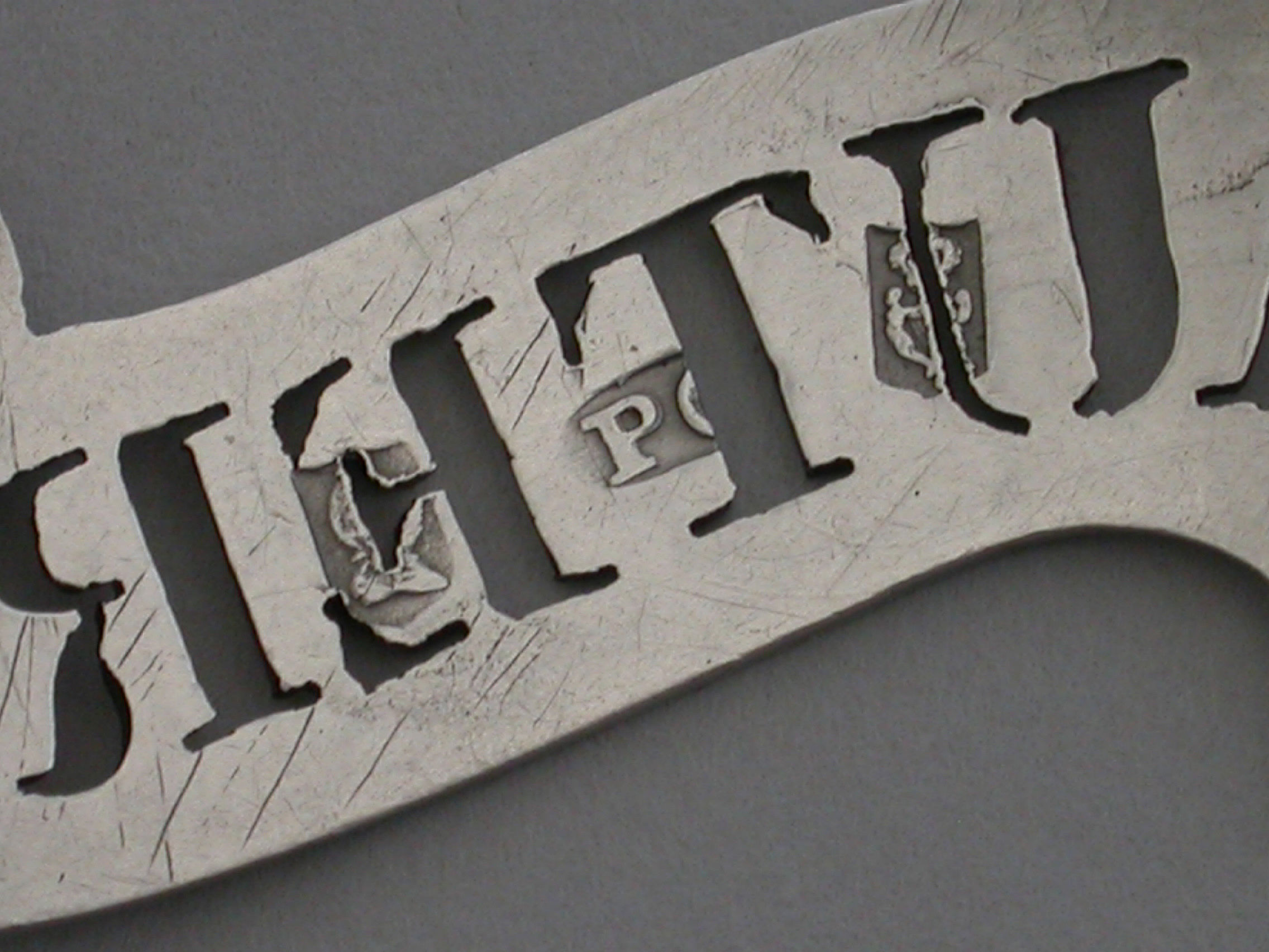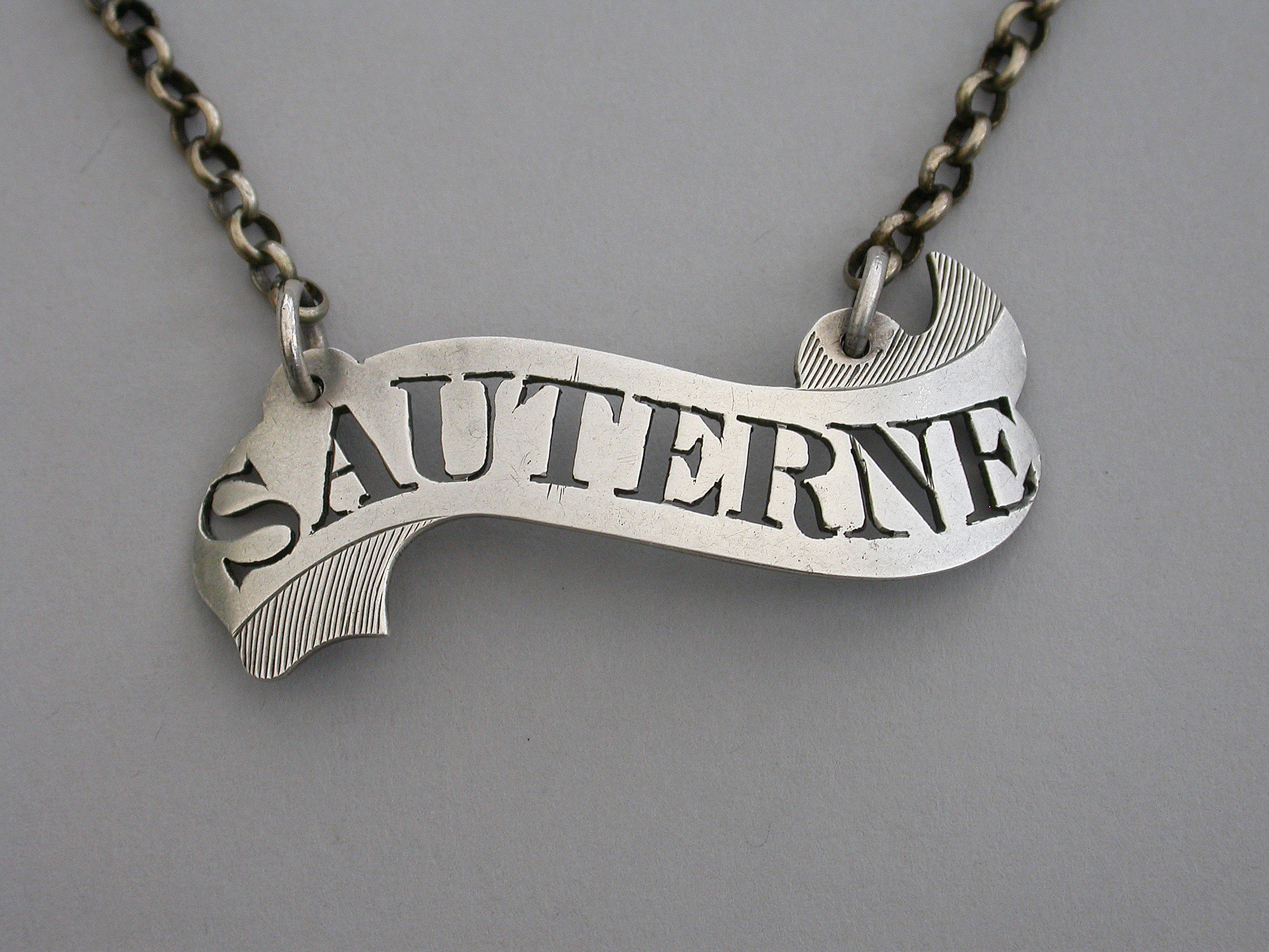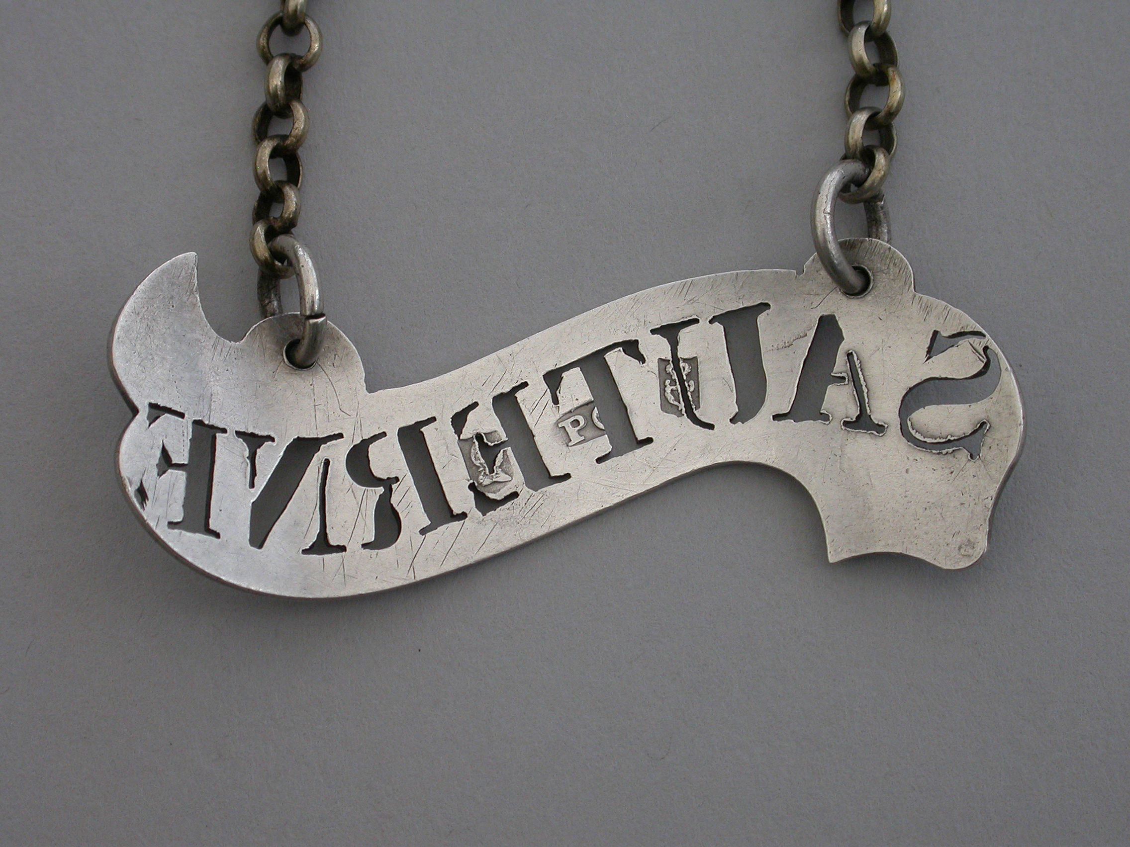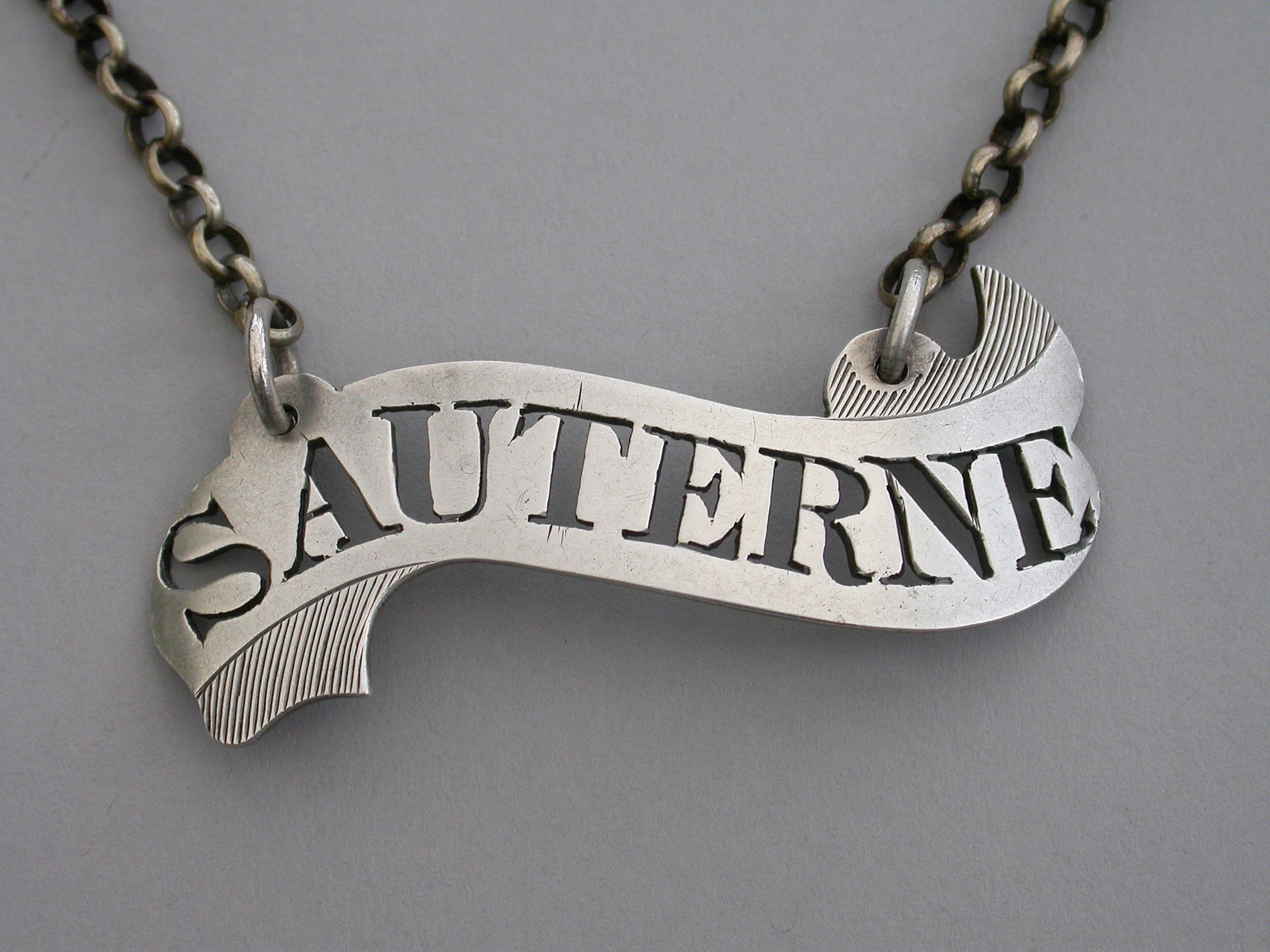 A rare George III Irish Provincial silver Wine Label of ""S"" scroll banner form with engraved hatched ends, pierced for Sauterne.