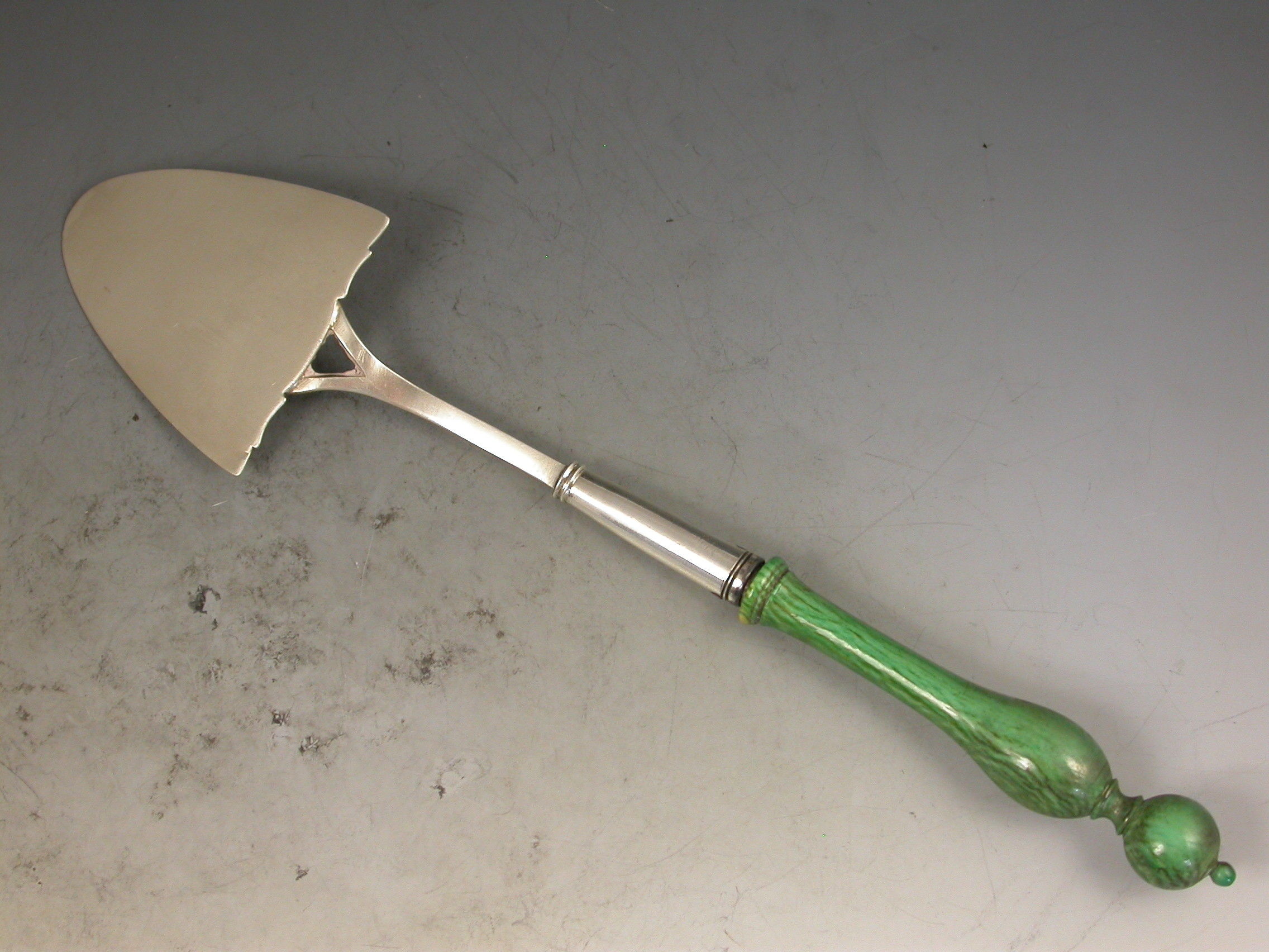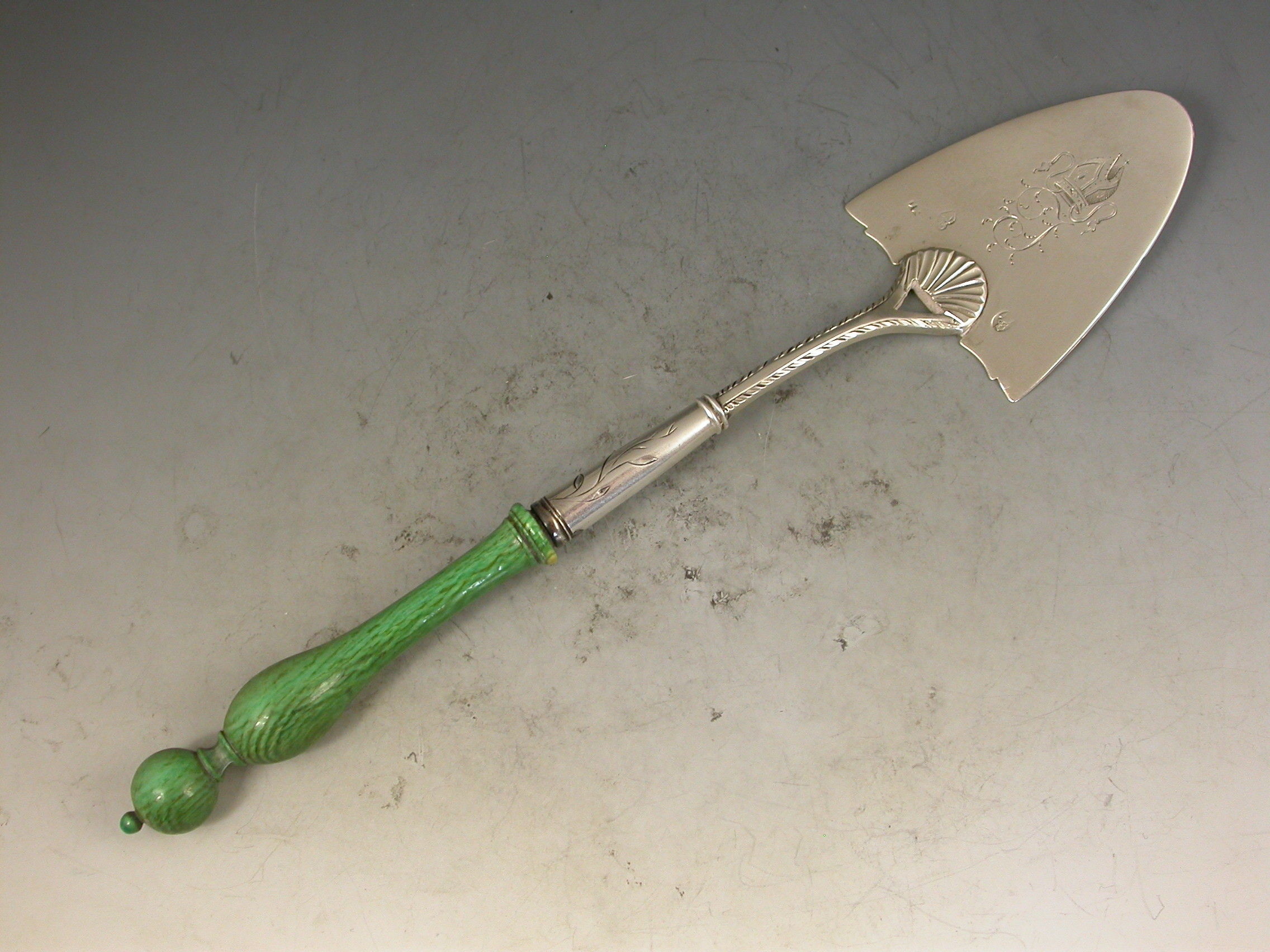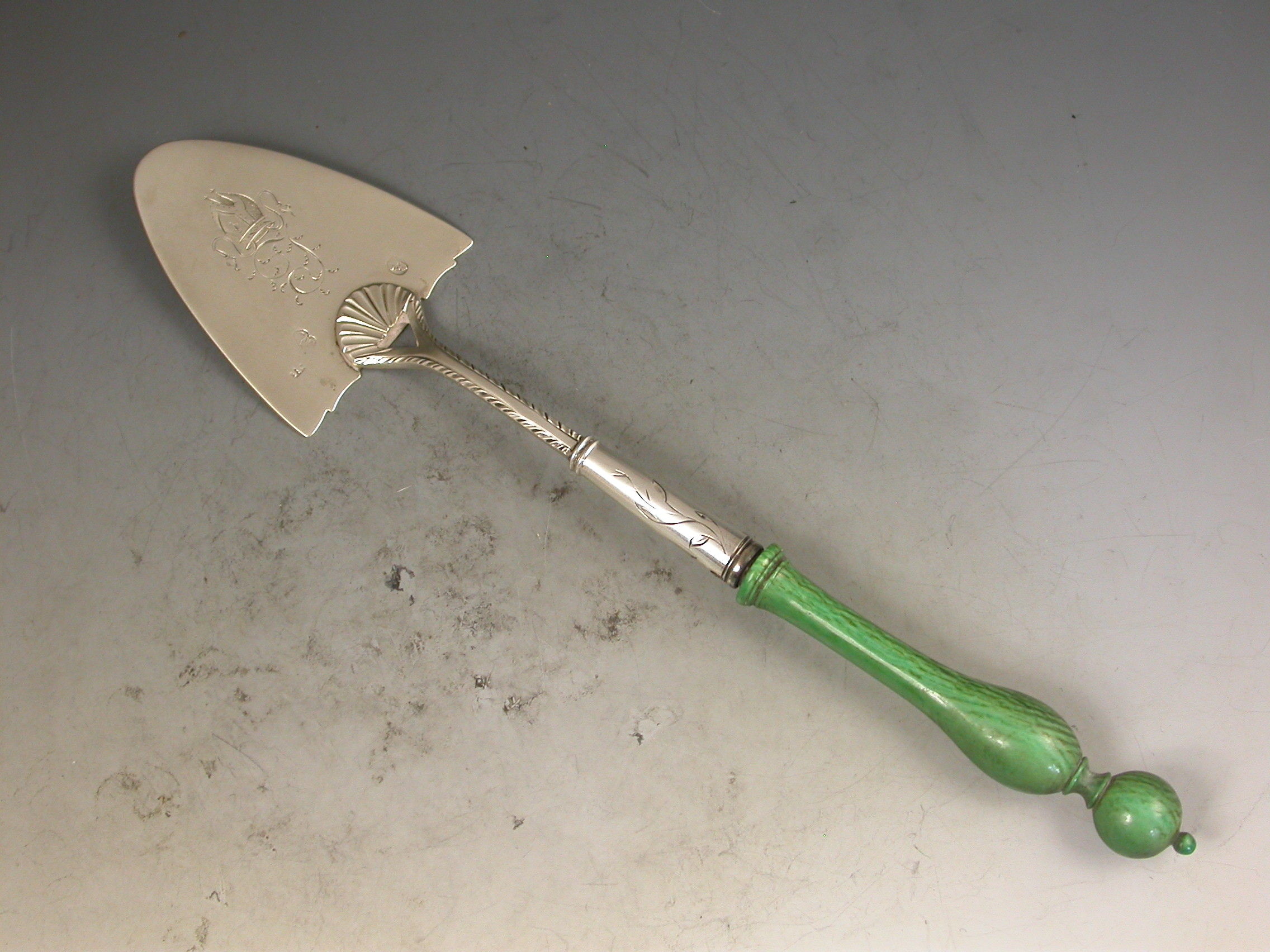 A fine and rare George III Irish silver Butter Spade with shaped triangular blade, the silver stem with feather edge border and shell terminal, a finely turned green stained ivory handle. The blade engraved with a crest of a bishop's mitre and an initial F, possibly for Fawcett of Ireland.