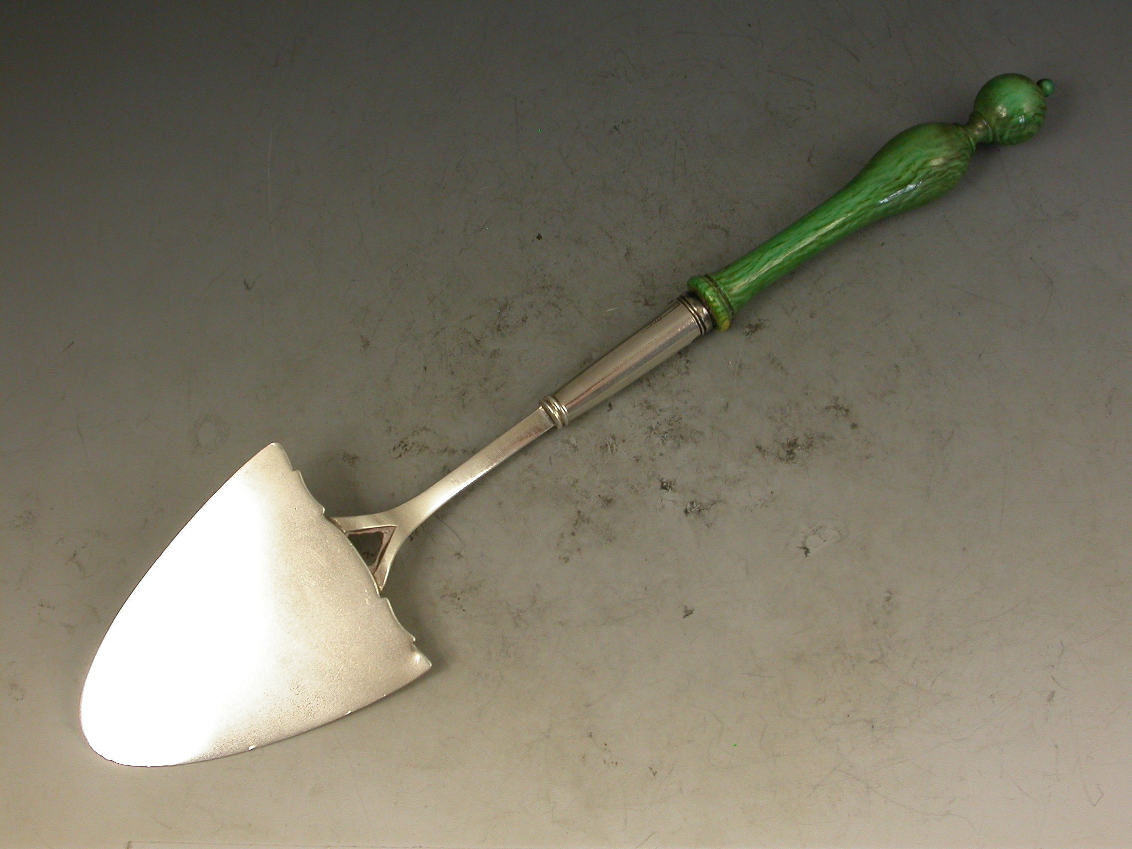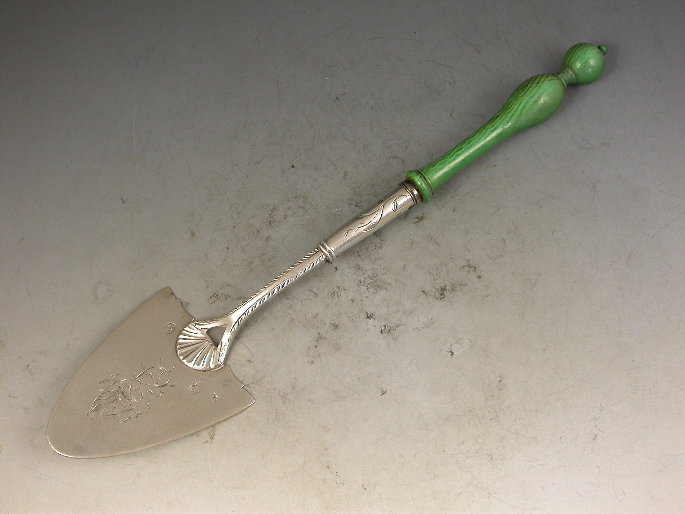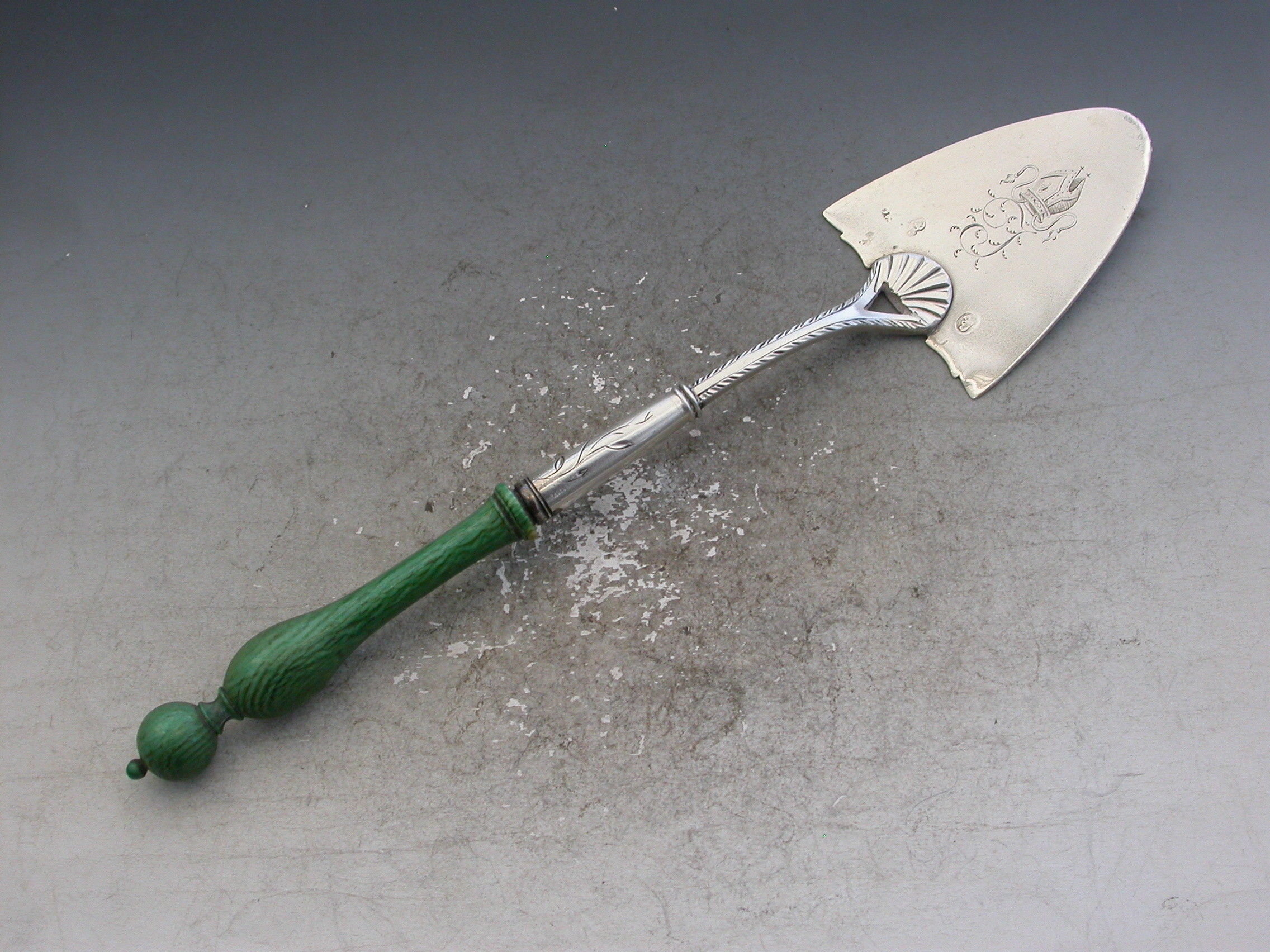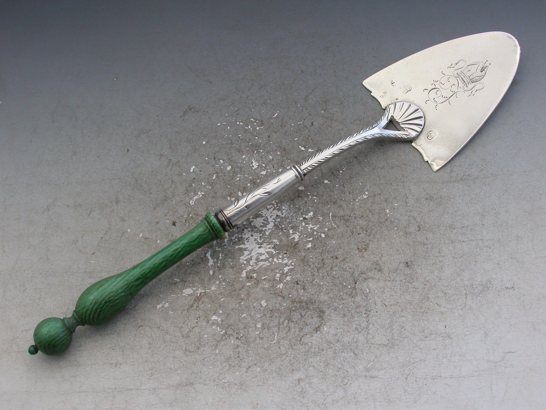 A fine and rare George III Irish silver Butter Spade with shaped triangular blade, the silver stem with feather edge border and shell terminal, a finely turned green stained ivory handle. The blade engraved with a crest of a bishop's mitre and an initial F, possibly for Fawcett of Ireland.