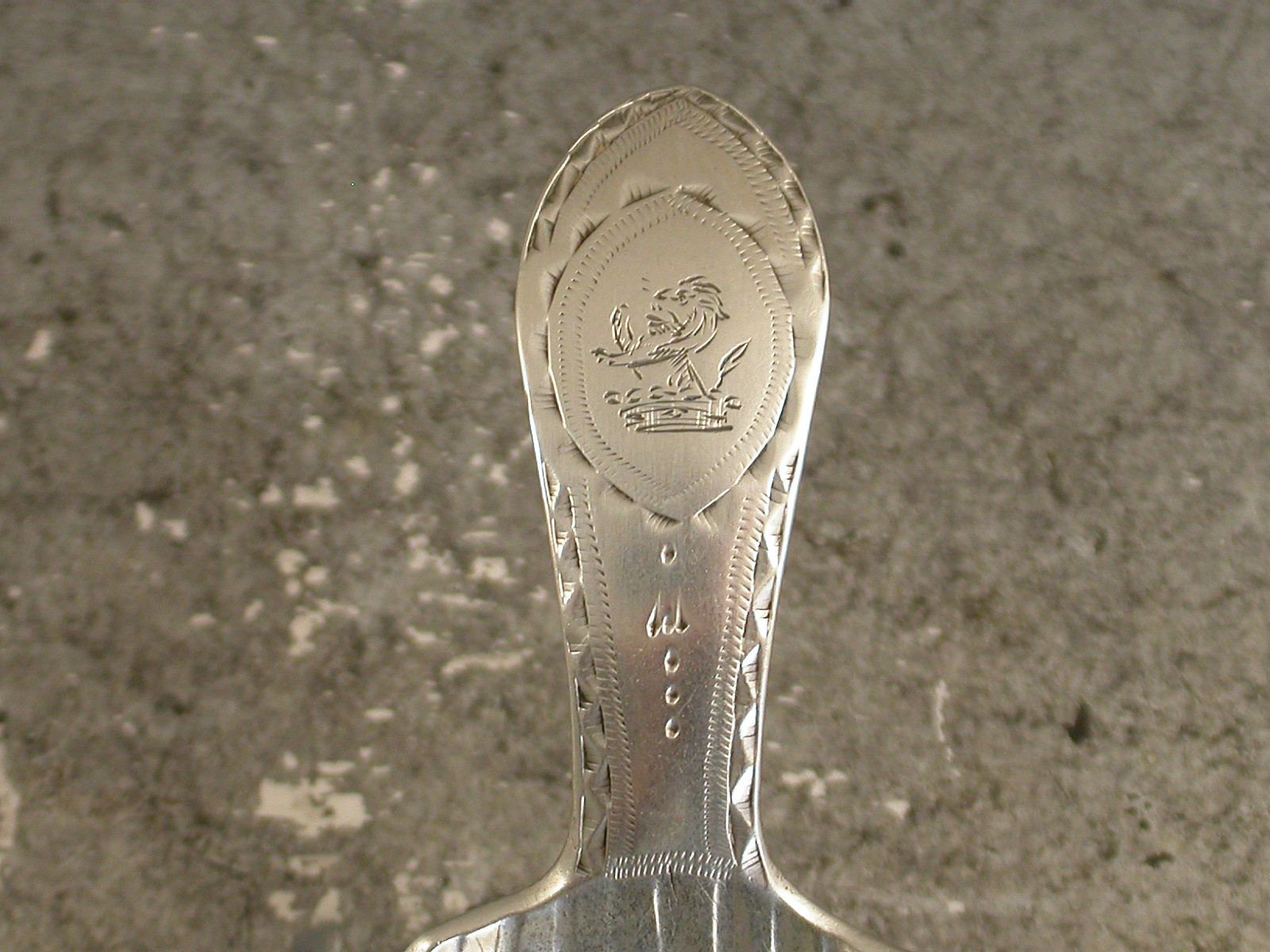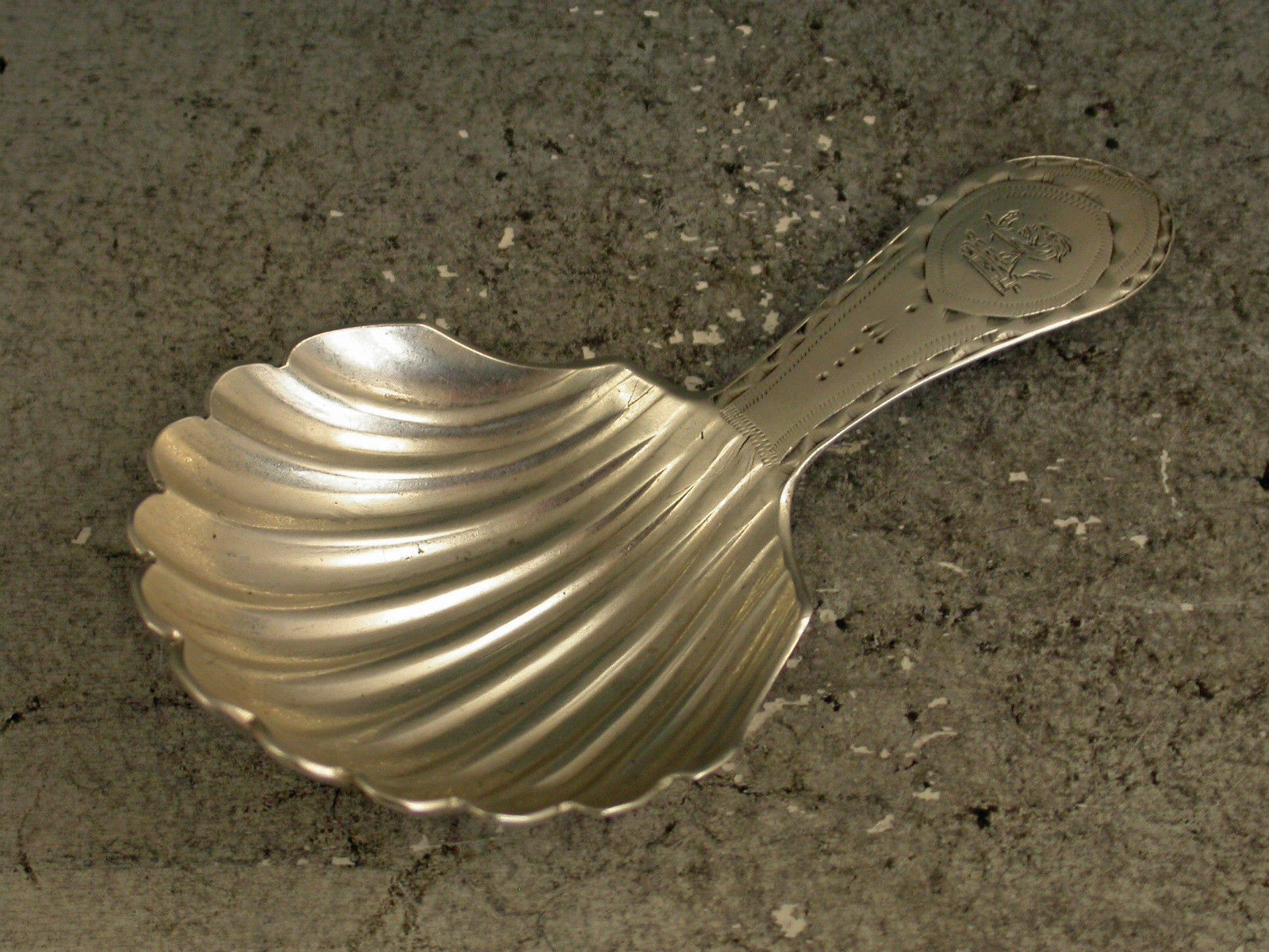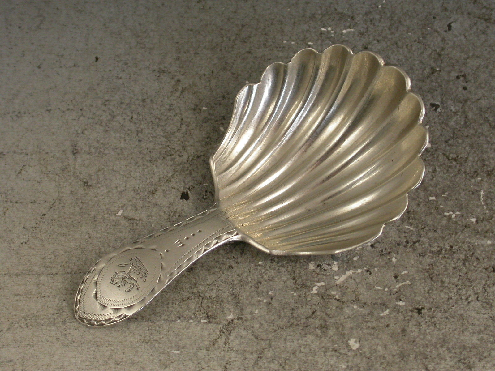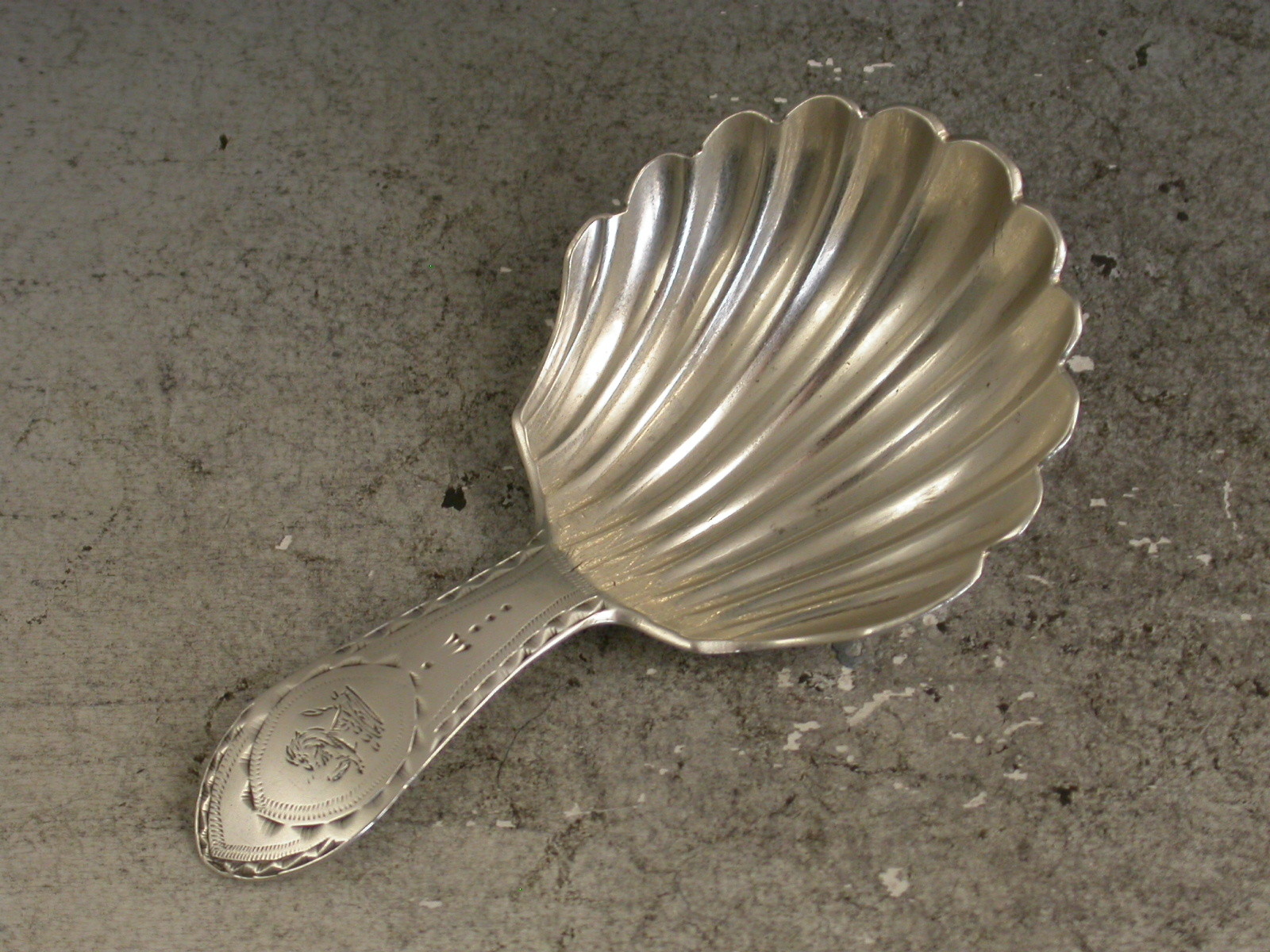 A rare George III Irish silver Caddy Spoon with unusual shell shaped bowl and bright-cut engraved Celtic point handle, the cartouche engraved with a crest of a demi lion rampant issuing out of a coronet.