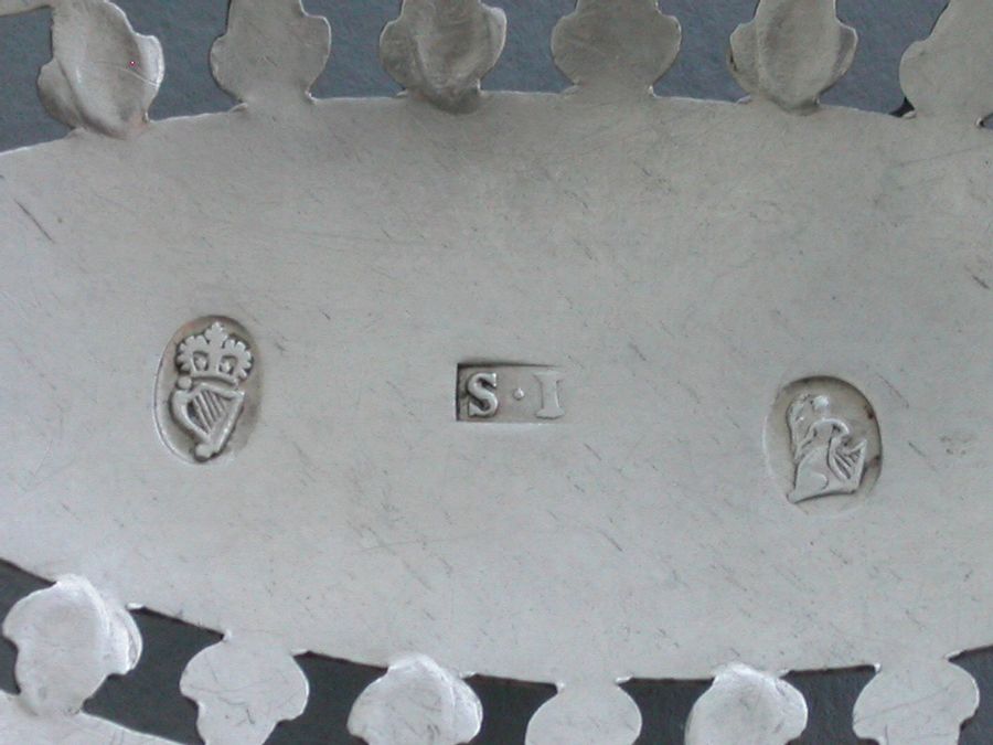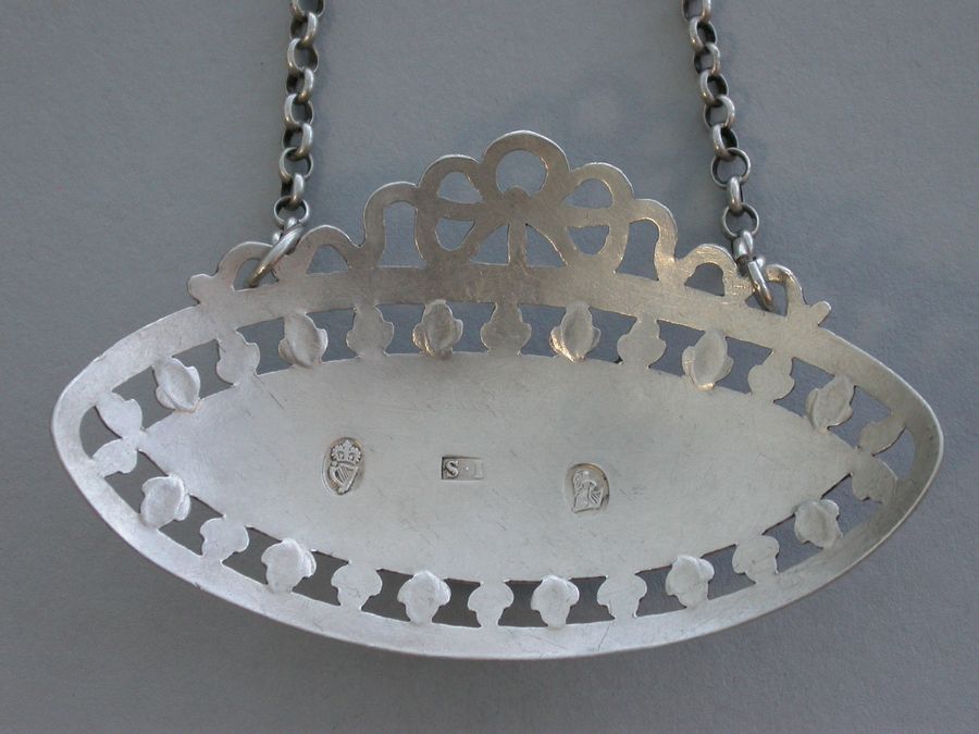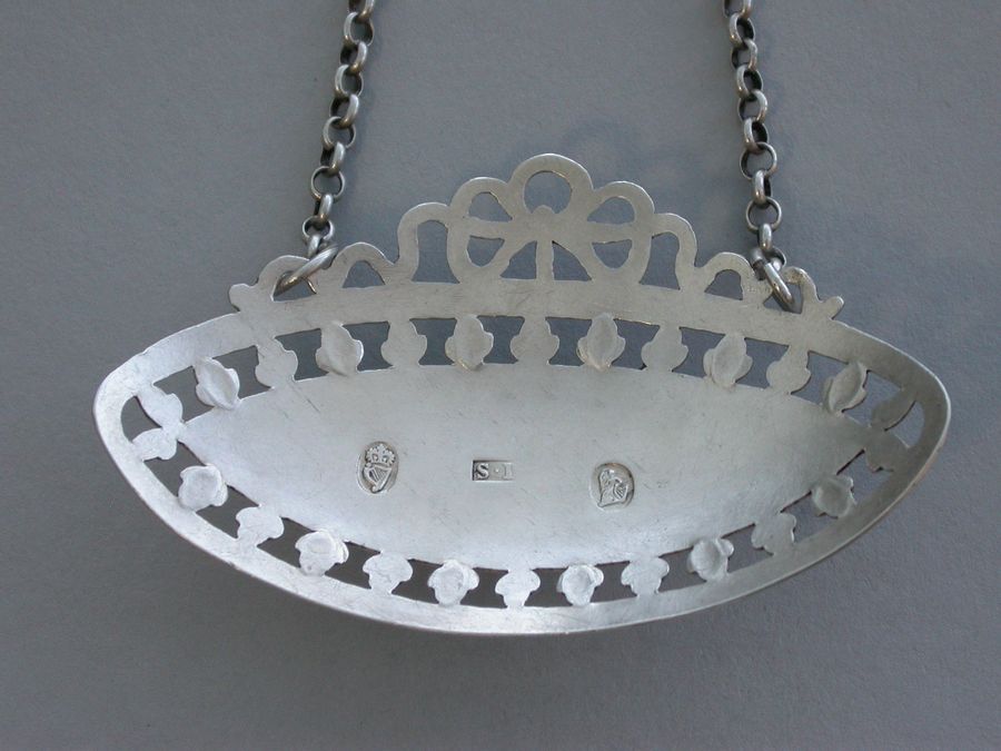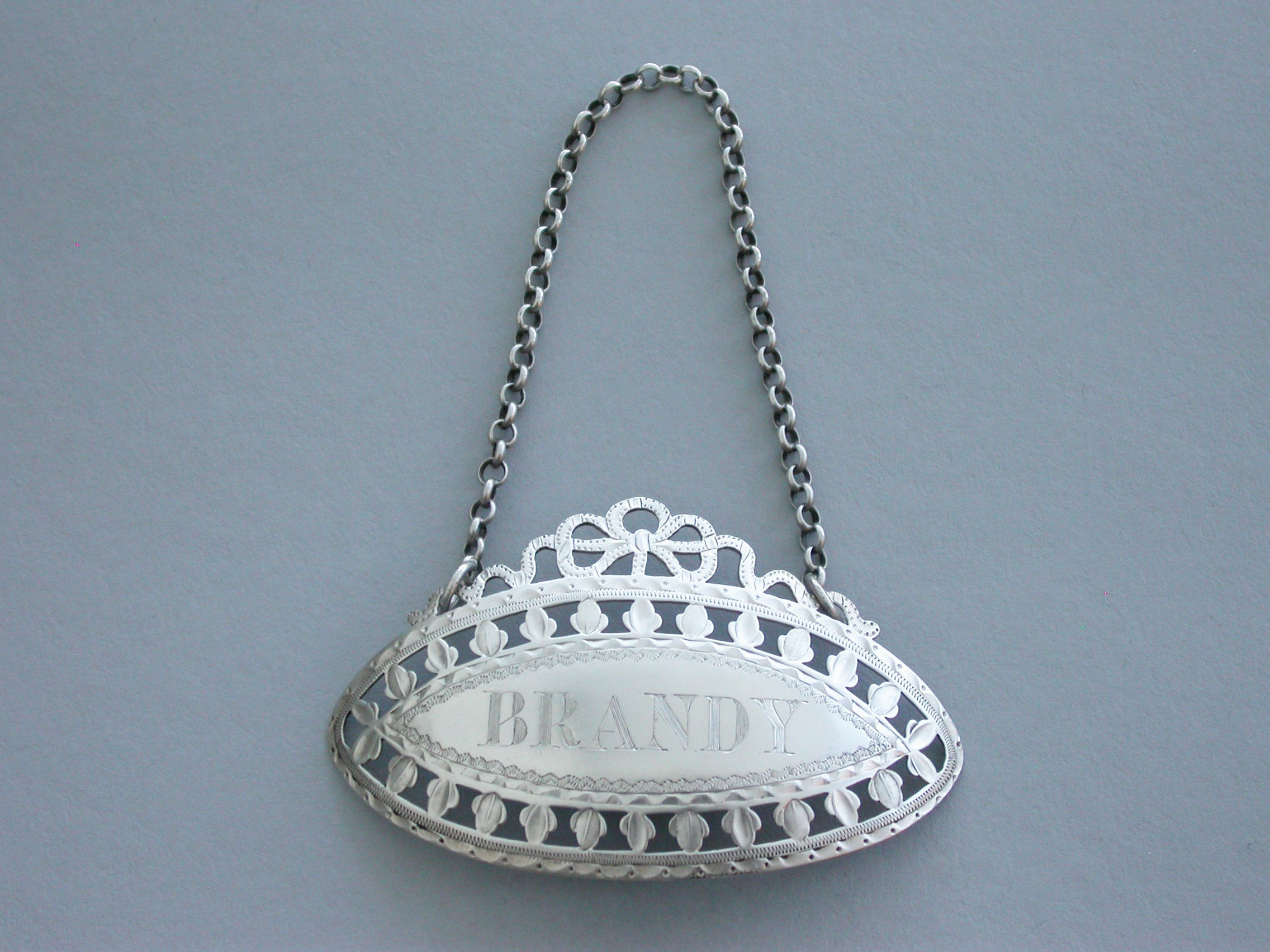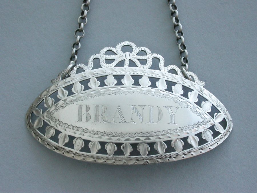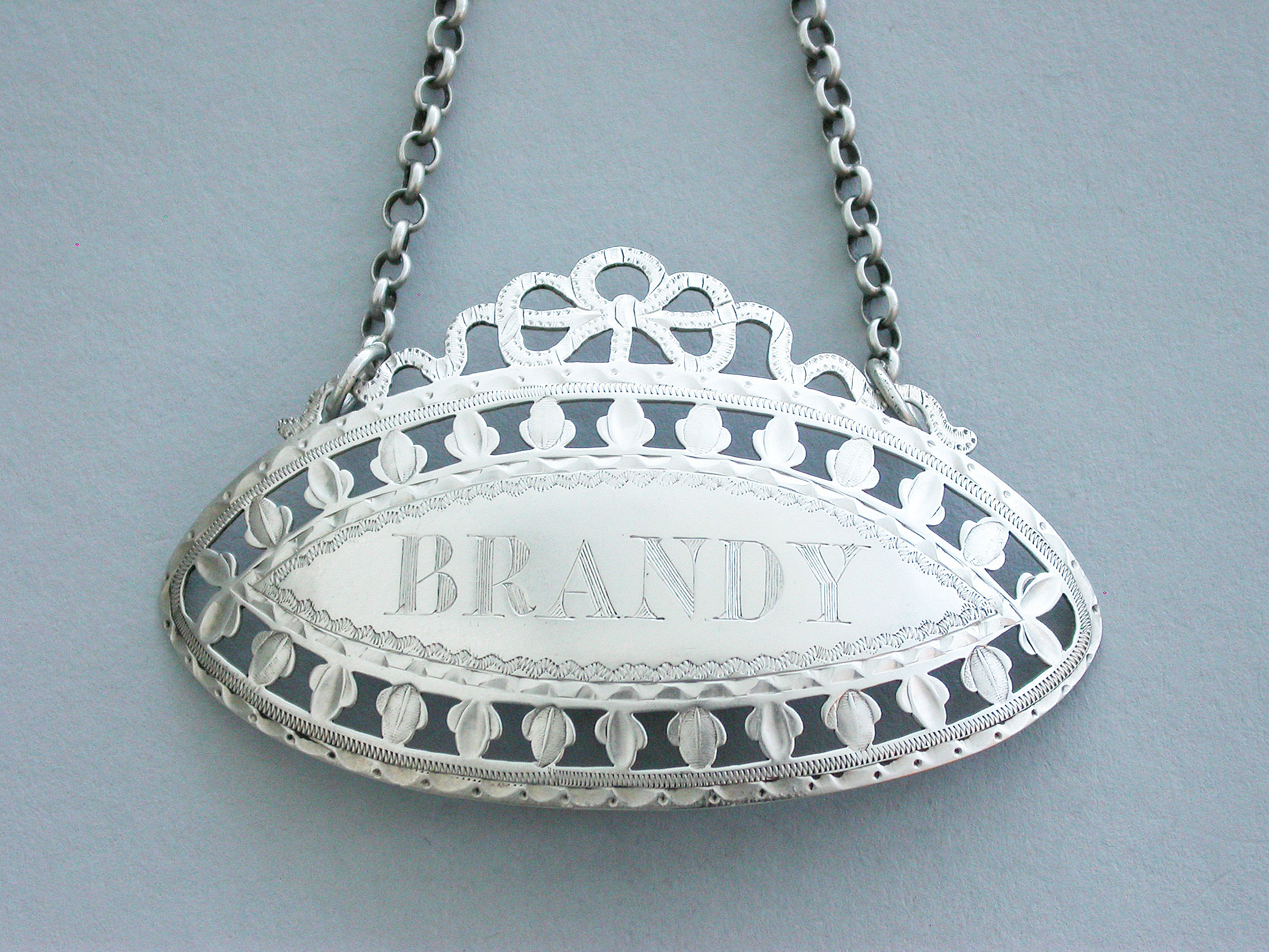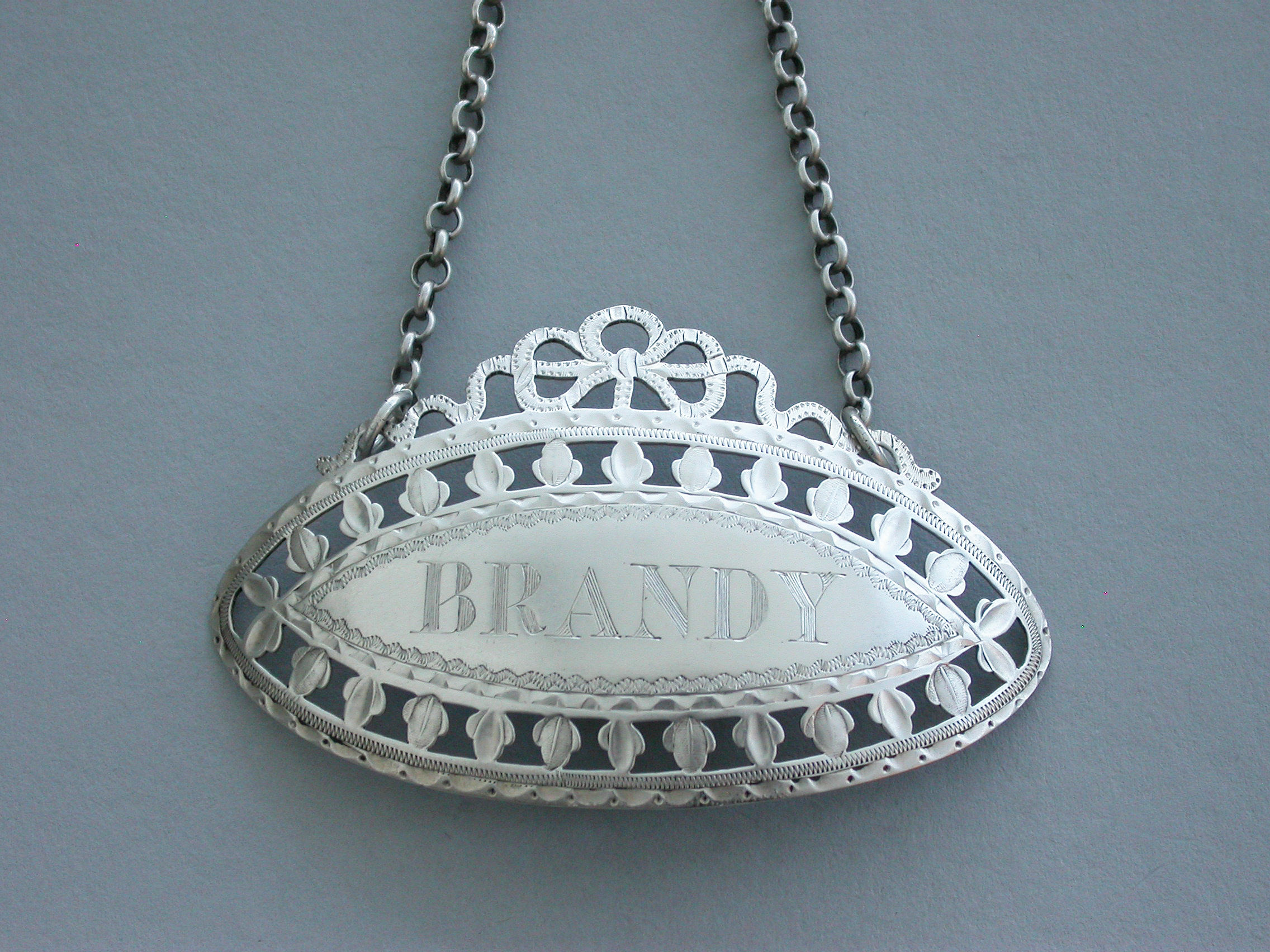 A very fine quality large George III Irish silver Wine Label made in the neo-classical style, of oval form with pierced and bright-cut engraved border of trefoils and a pierced tied ribbon surmount, incised for Brandy