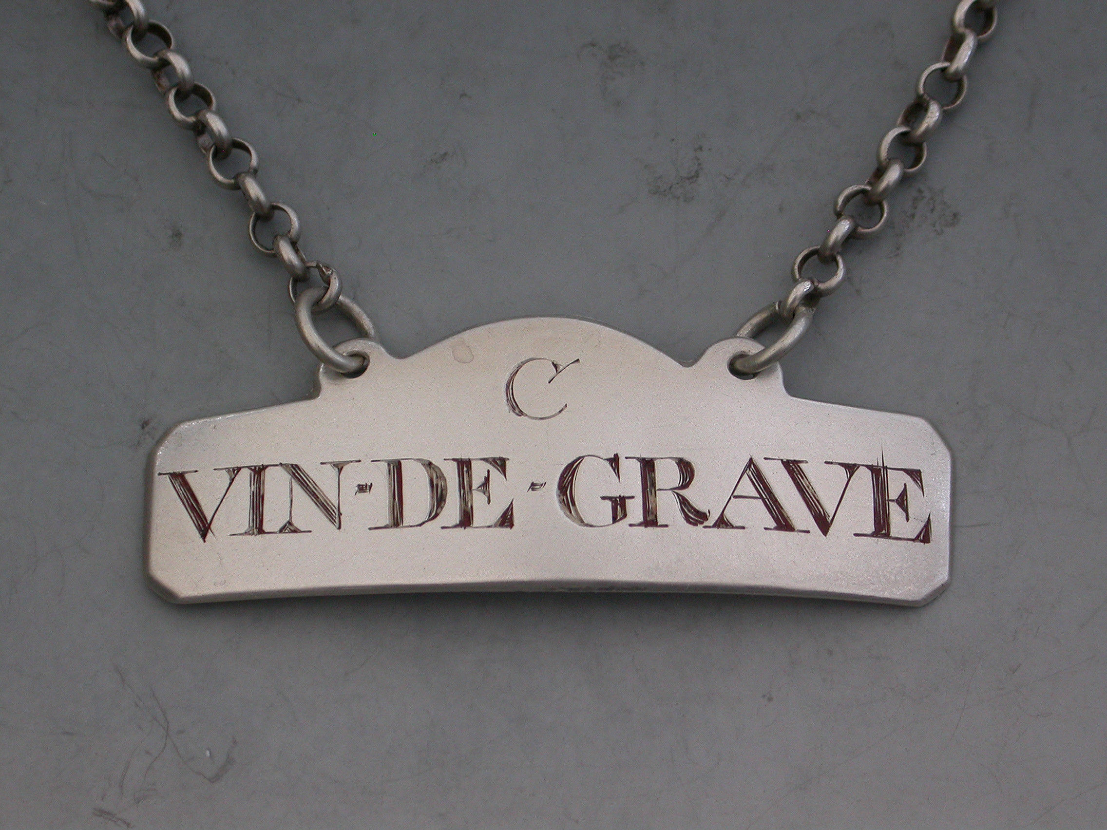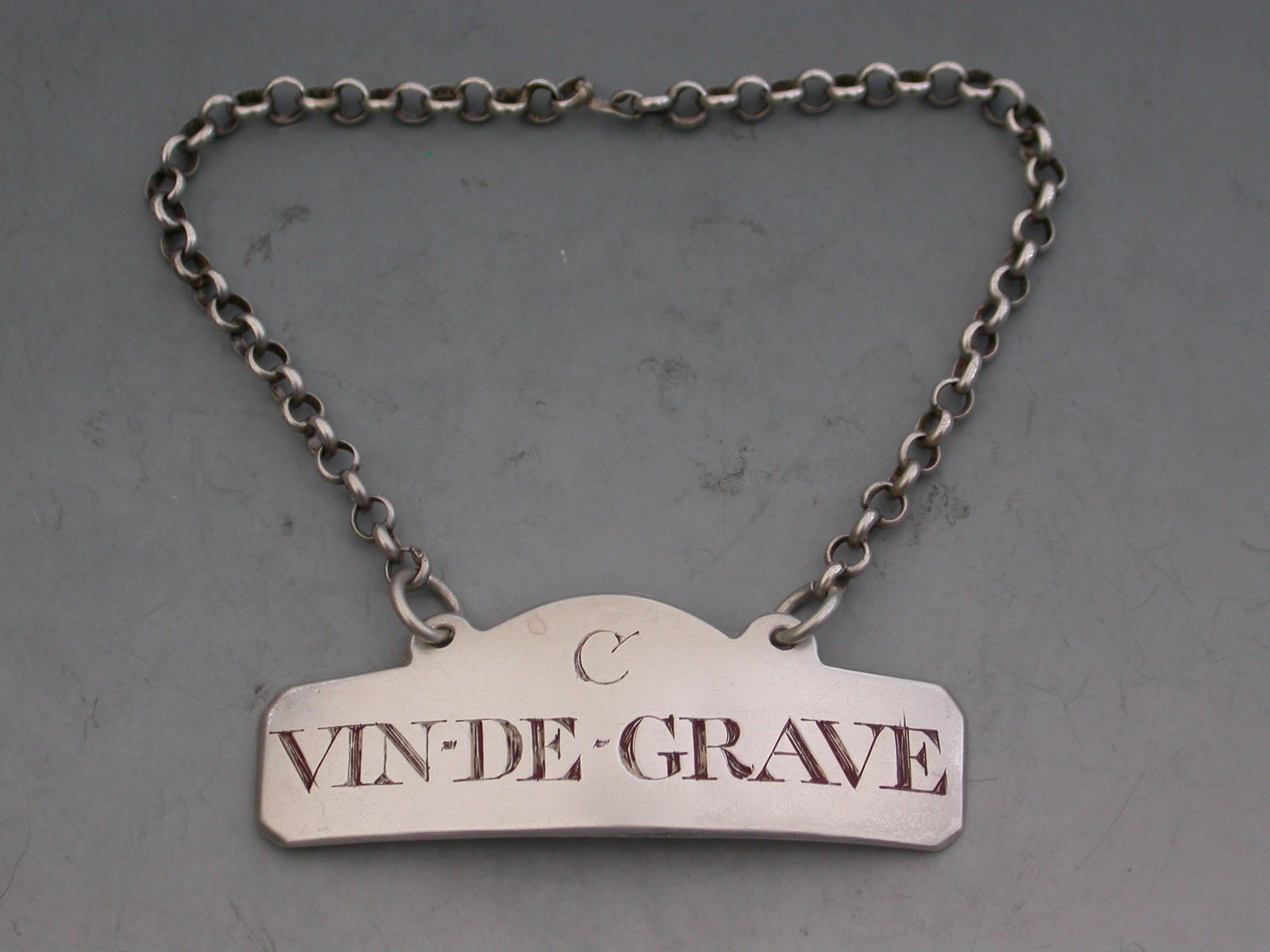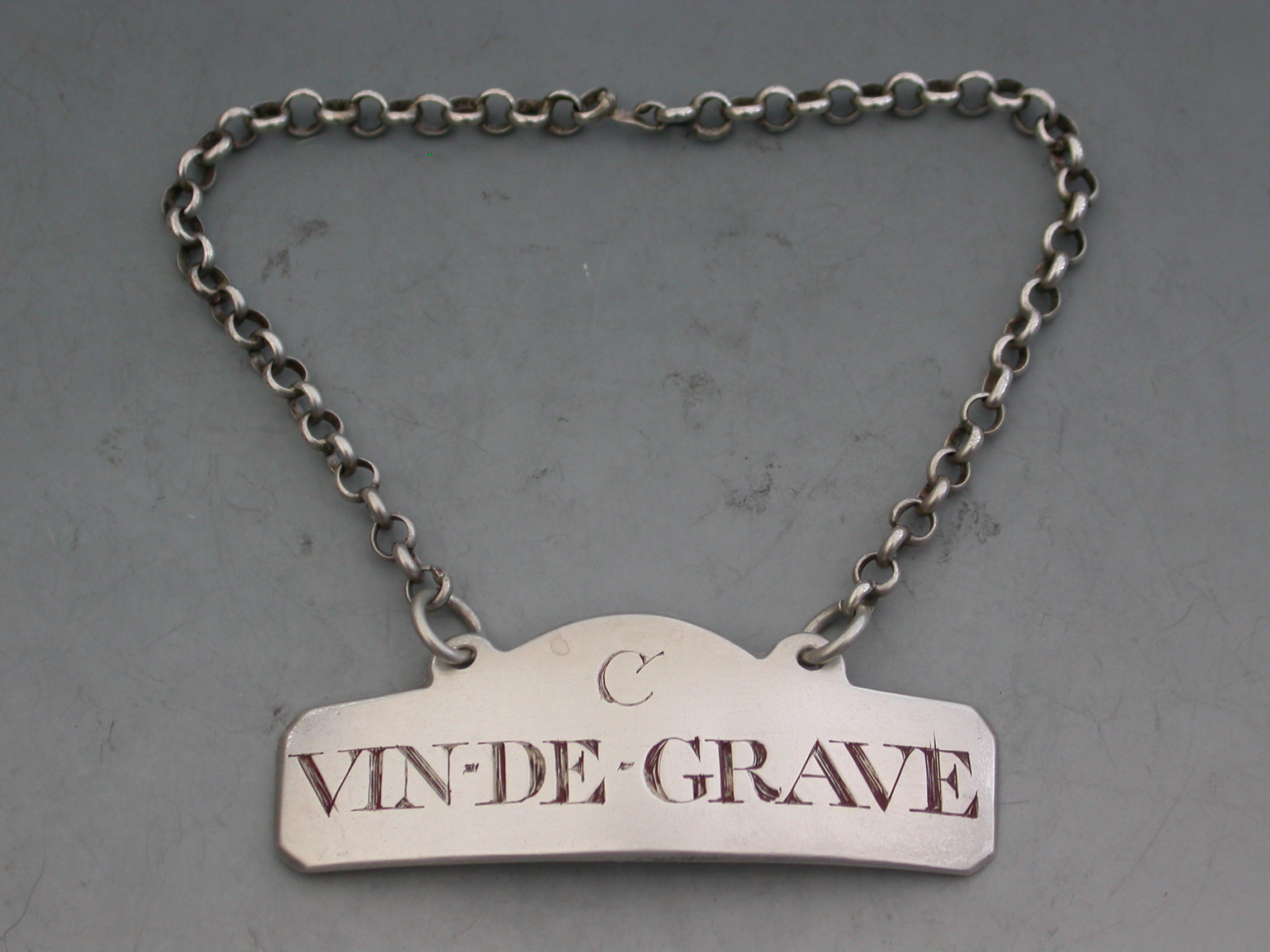 A good George III Irish silver Wine Label of plain domed rectangular form with cut-corners and raised eyelets, incised for Vin-De-Grave with a capital letter 'C' engraved above (the C possibly to indicate Claret).