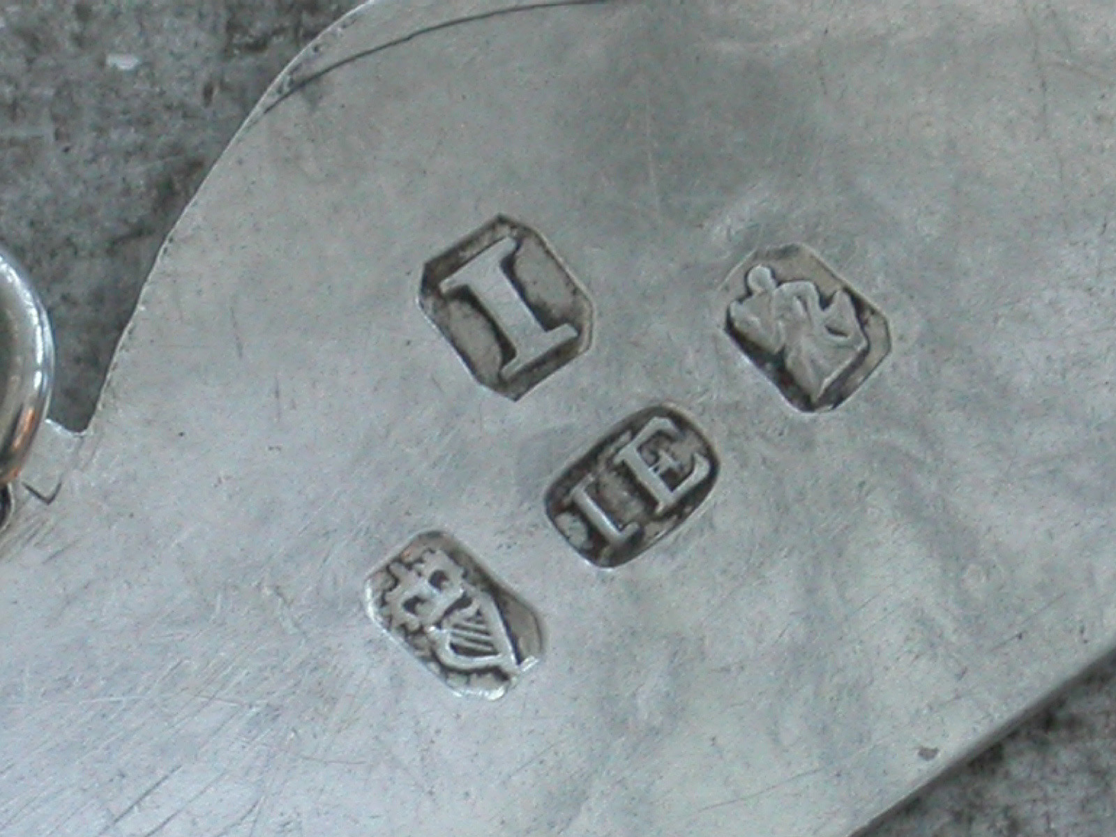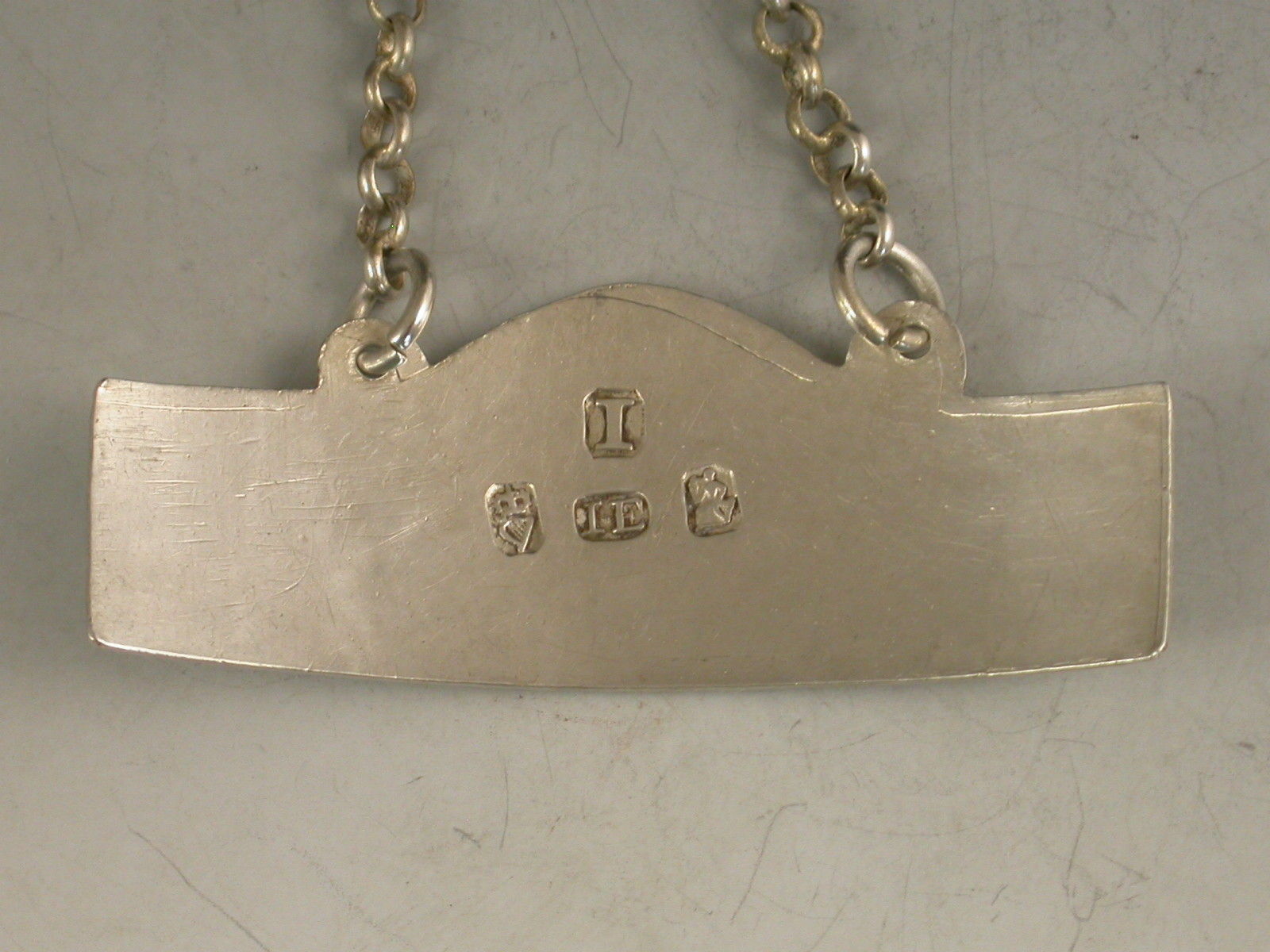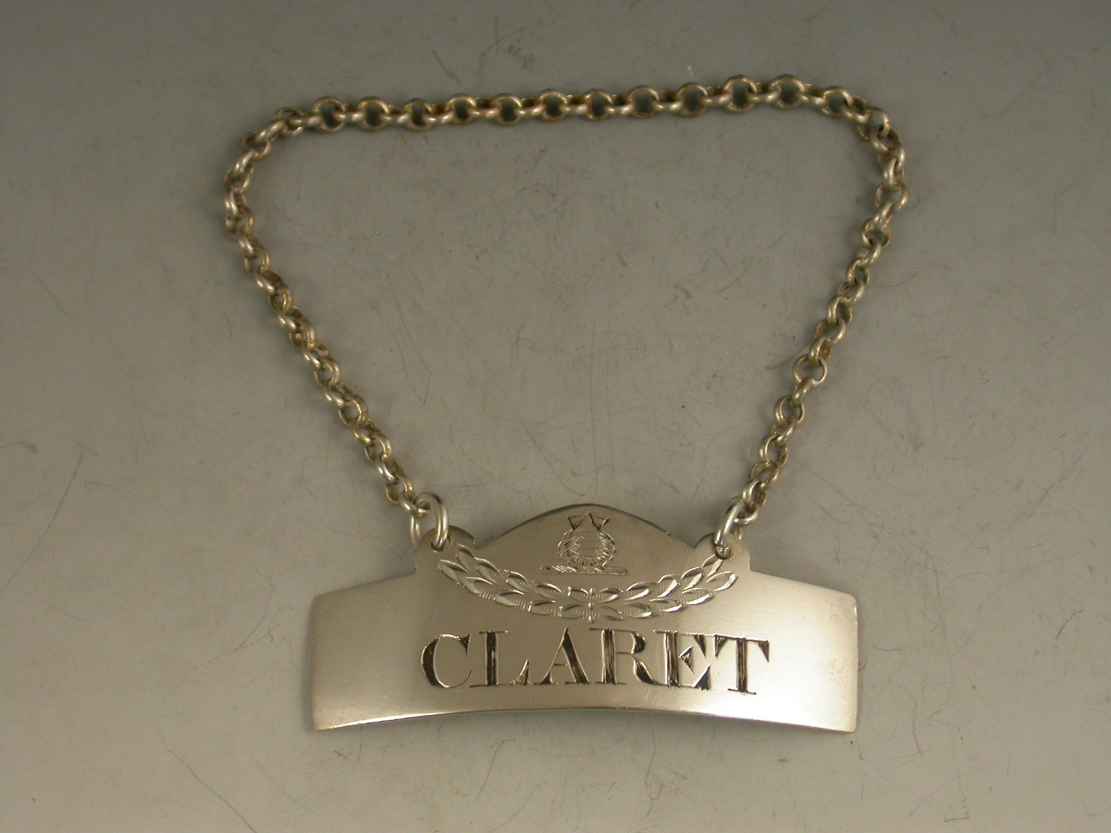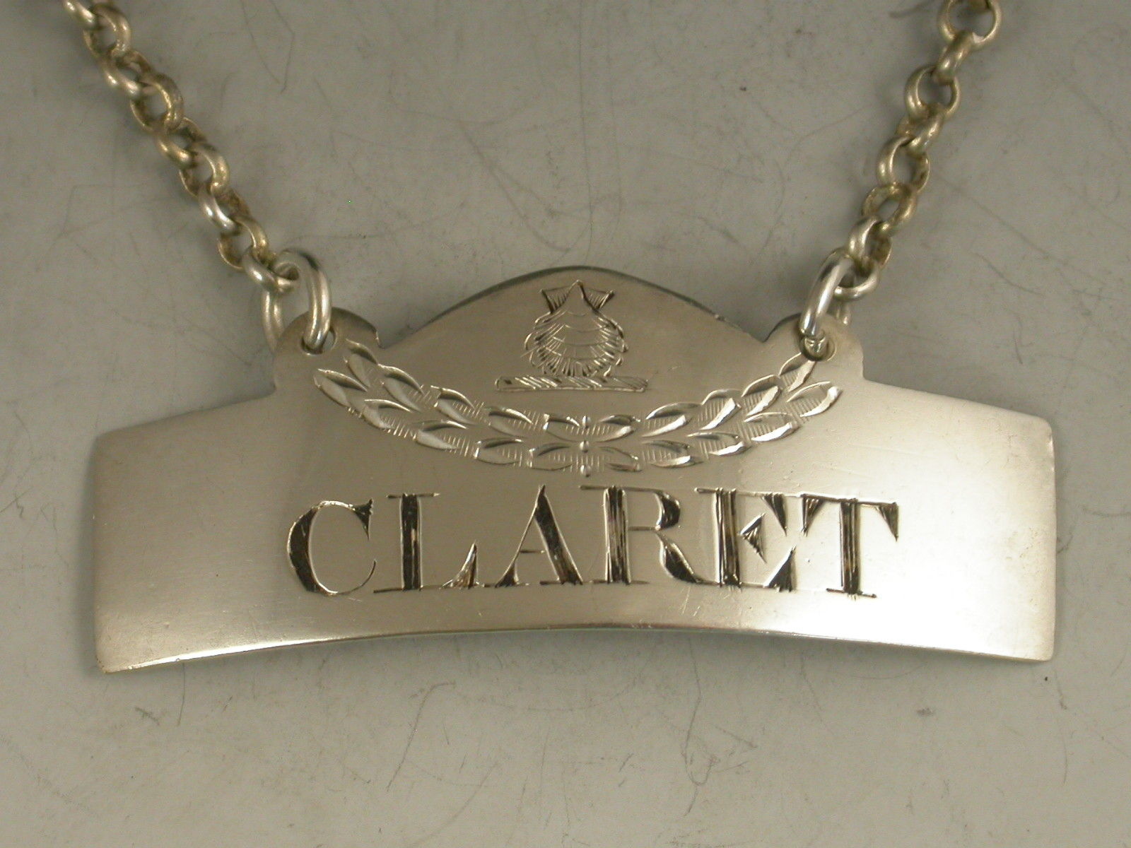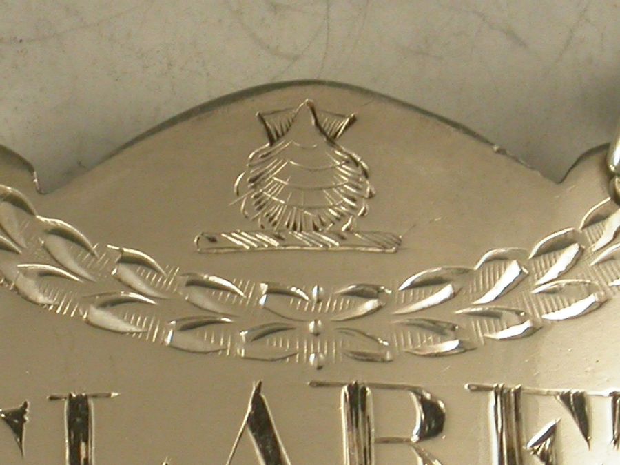 A good George III Irish silver Wine Label of typical plain narrow rectangular form with domed surmount and raised eyelets, incised for Claret and engraved with a crest of an Escallop (scallop shell) above a festoon.