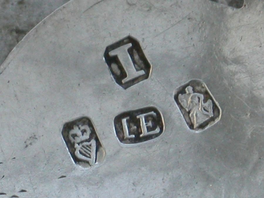 A good George III Irish silver Wine Label of typical plain narrow rectangular form with domed surmount and raised eyelets, incised for Madeira and engraved with a crest of an Escallop (scallop shell) above a festoon.