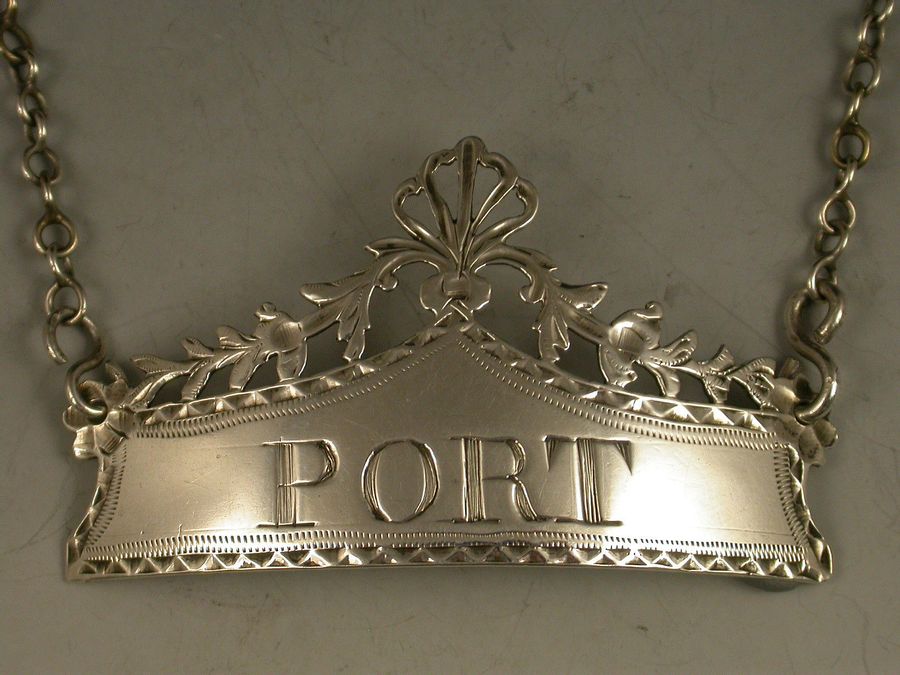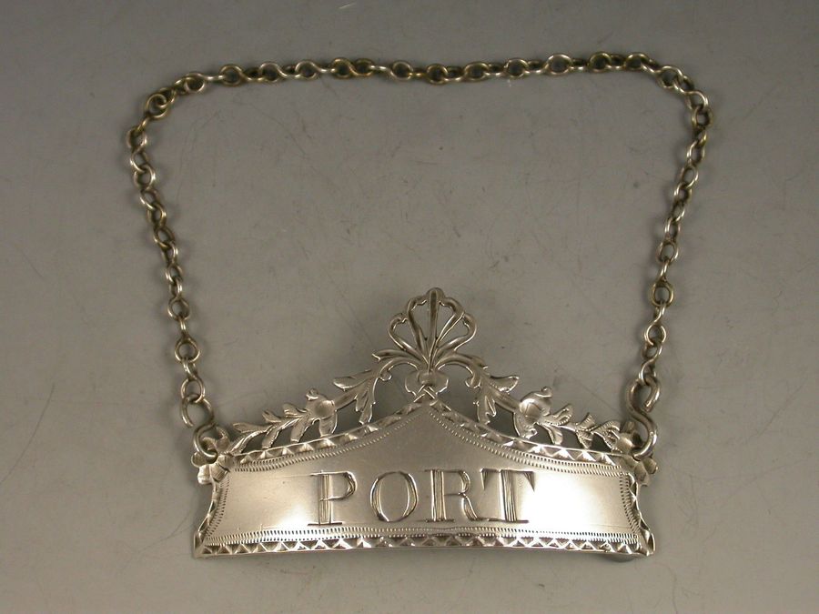 A fine quality George III Irish silver Wine Label, of banner form with bright cut engraved border and foliate pierced surmount capped by a pierced anthemion motif, incised for Port.