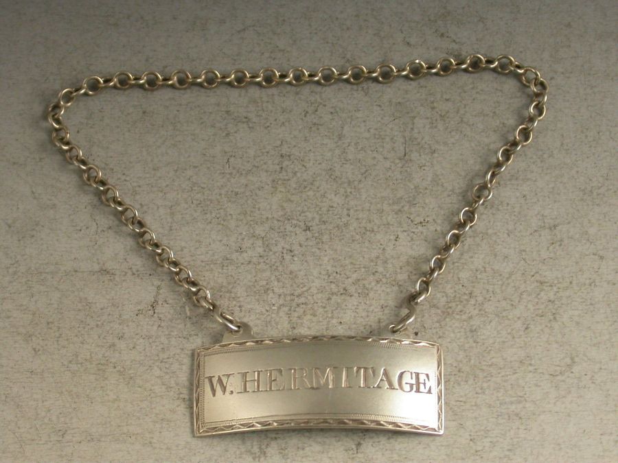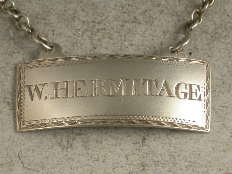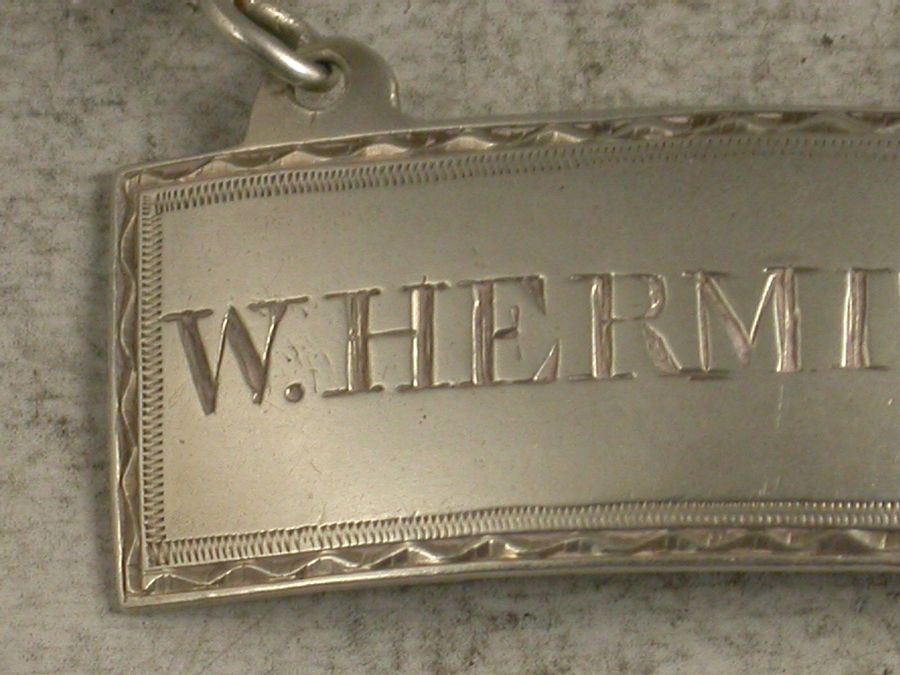 A rare George III Irish silver Wine Label of rectangular form with raised eyelets, bright-cut engraved and wriggle work border, incised for W.Hermitage.