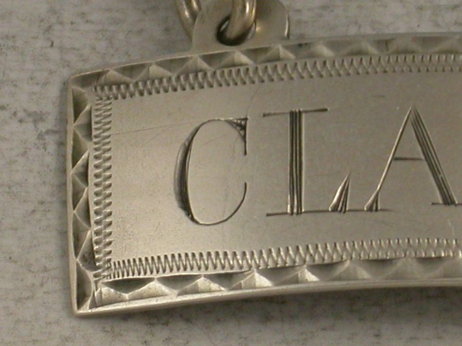 A good George III Irish silver Wine Label of curved rectangular form with raised eyelets and bright cut feather edge border, incised for Claret.