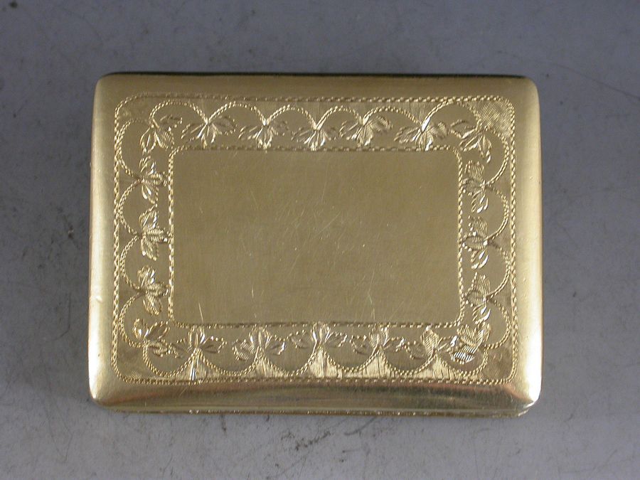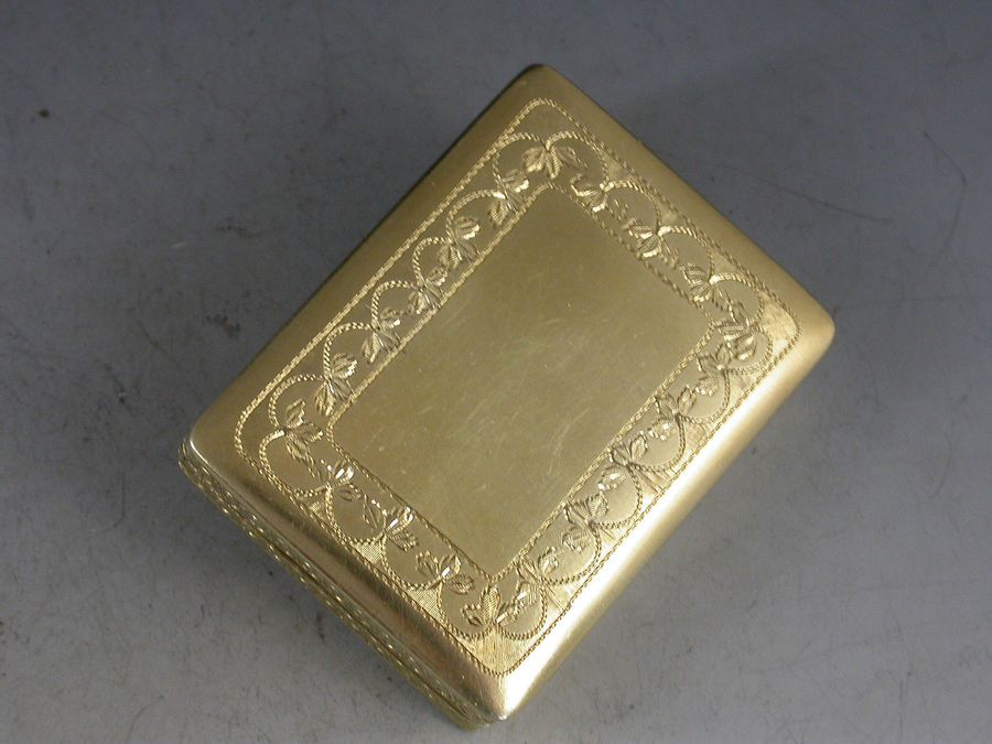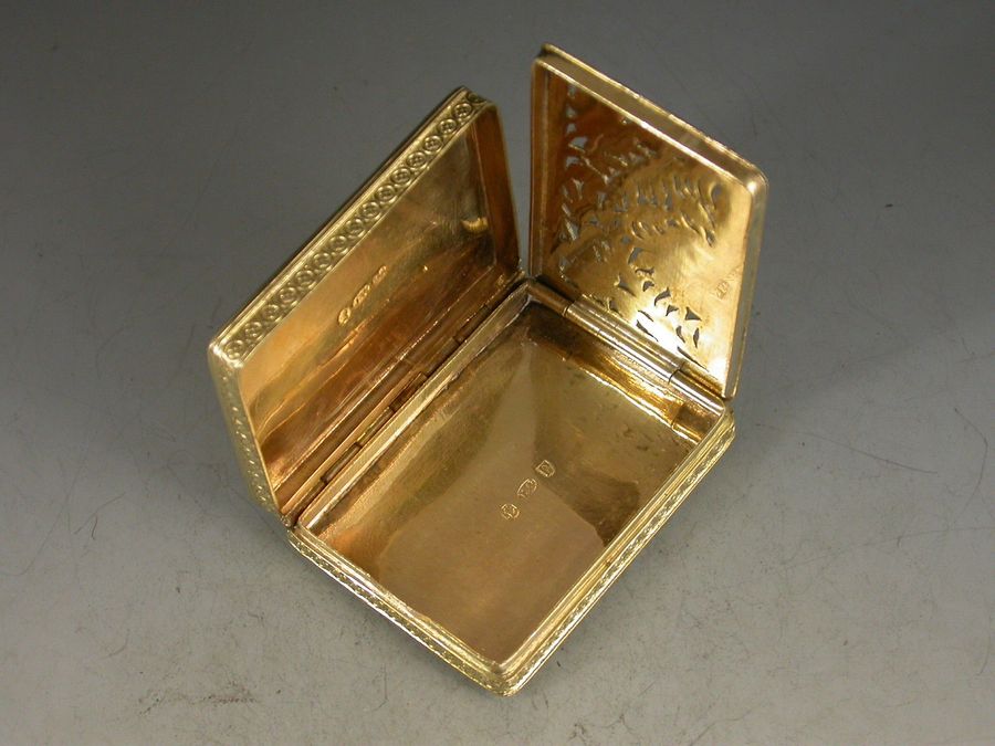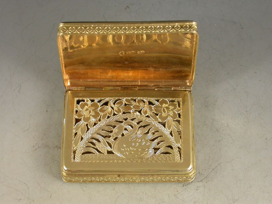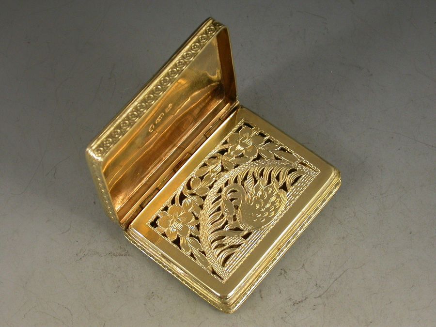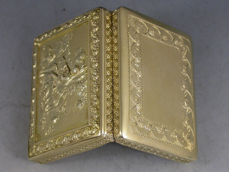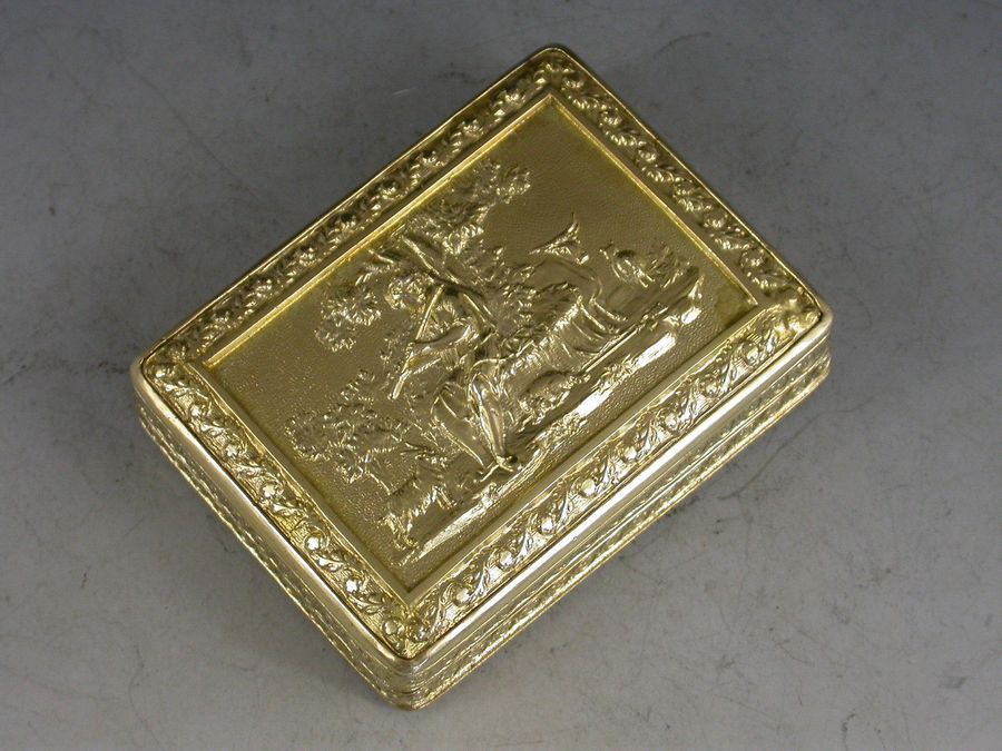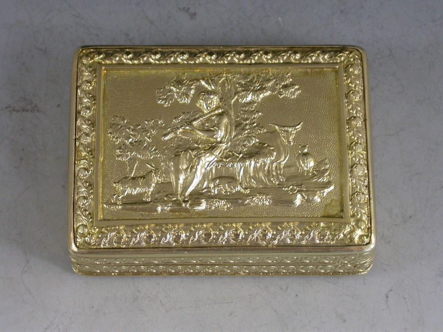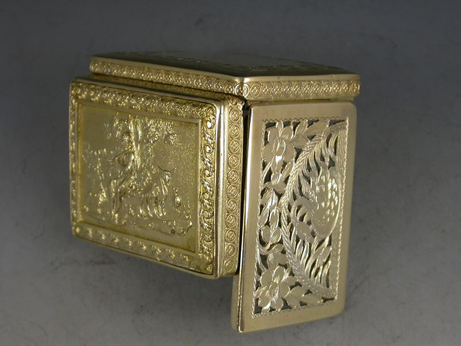 An exceptional George III silver gilt Vinaigrette of very large size and rectangular form with raised foliate borders, the plain base with engraved foliate border, the lid with a raised chased scene on a matt background depicting a Shepherd Boy playing a flute surrounded by farm animals. The interior with superbly pierced grille depicting a swan swimming beneath an arch with flowers above.