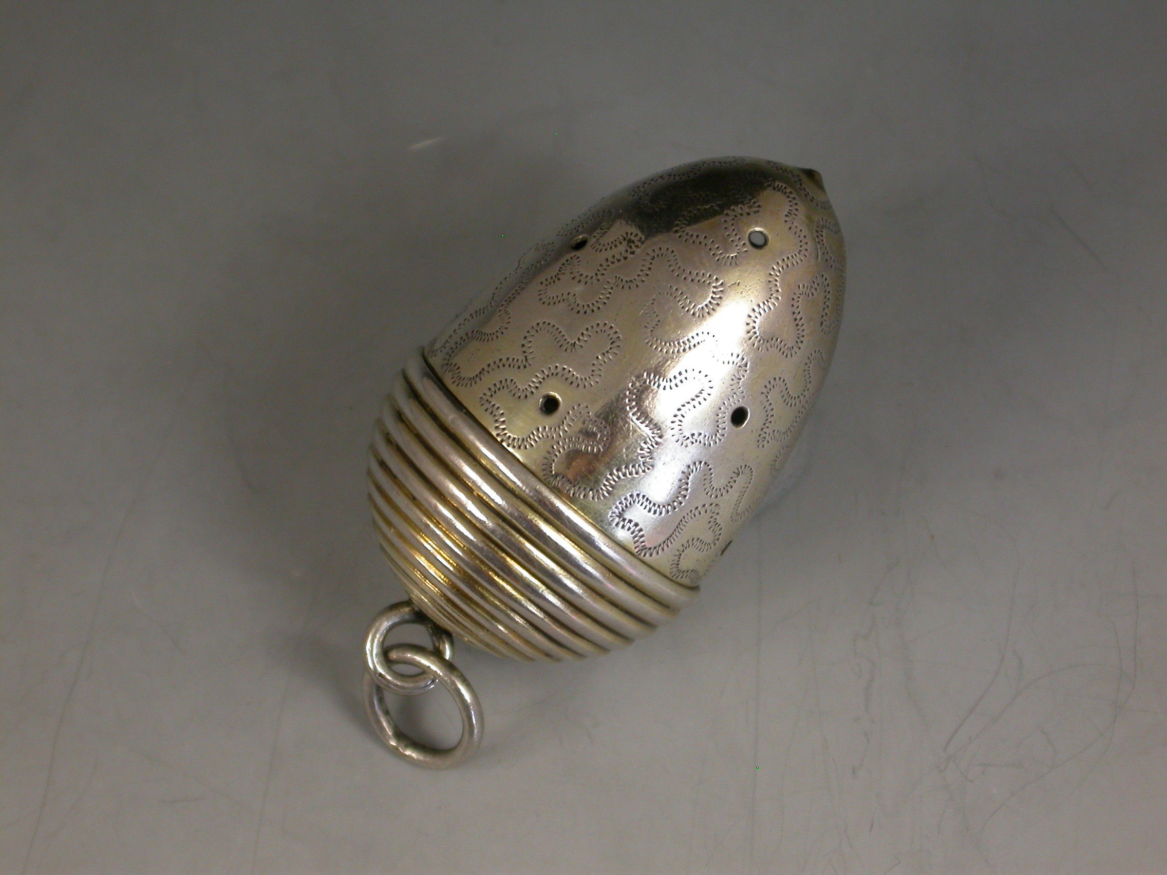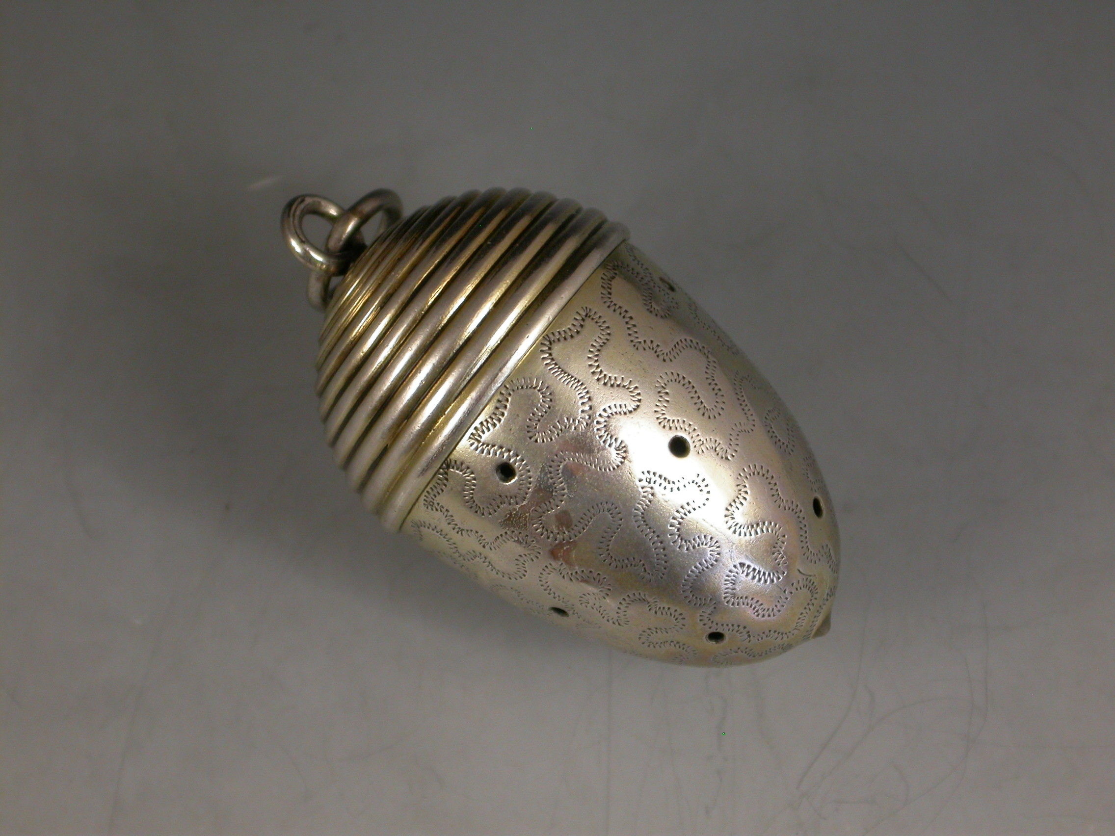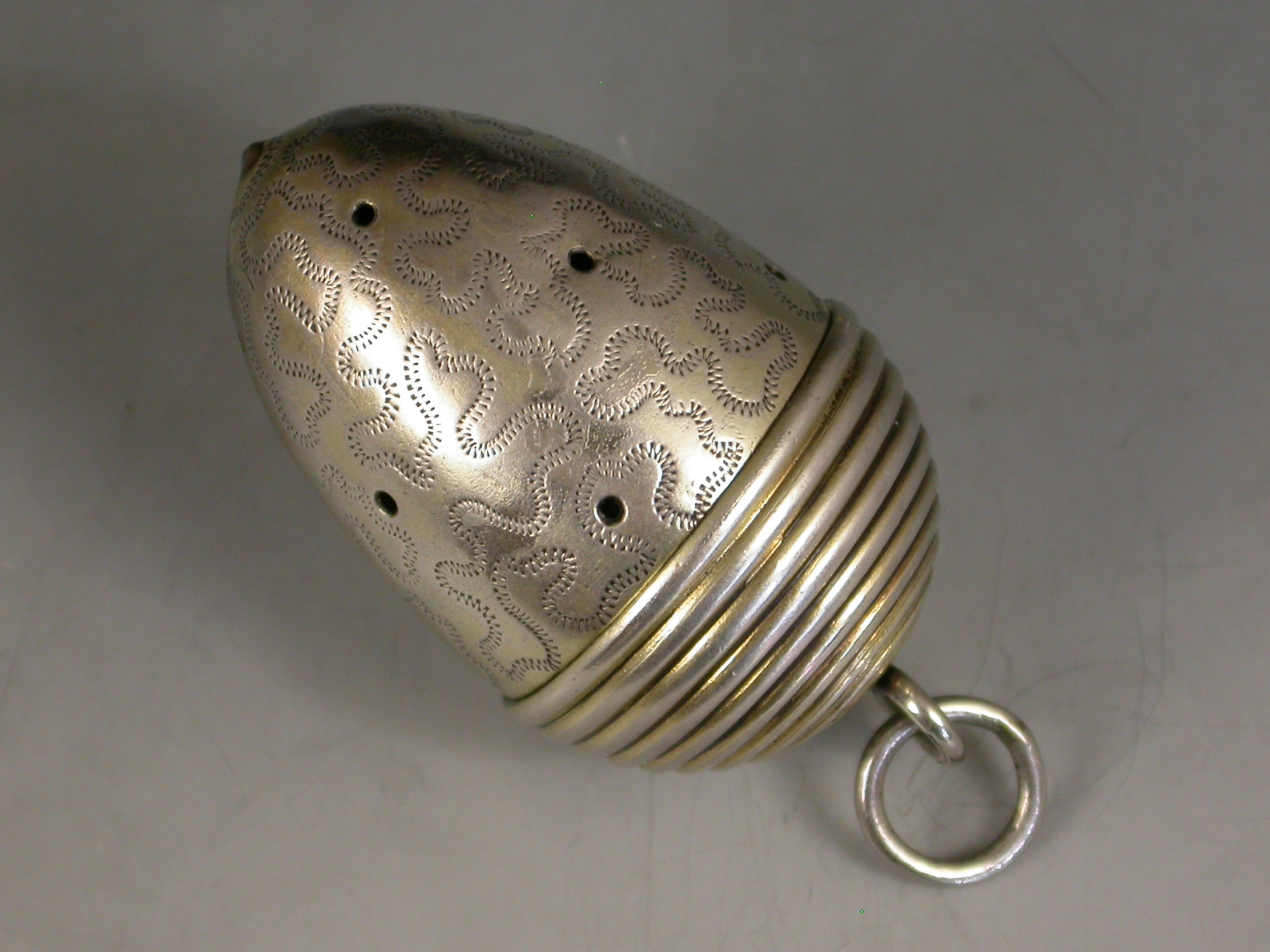 An extremely fine and rare George III novelty silver gilt Vinaigrette, made in the form of an Acorn with attached suspension ring, the pierced body engraved with wriggle work decoration, the ribbed screw off cover opening to reveal a finely pierced and bright-cut engraved silver gilt grille.