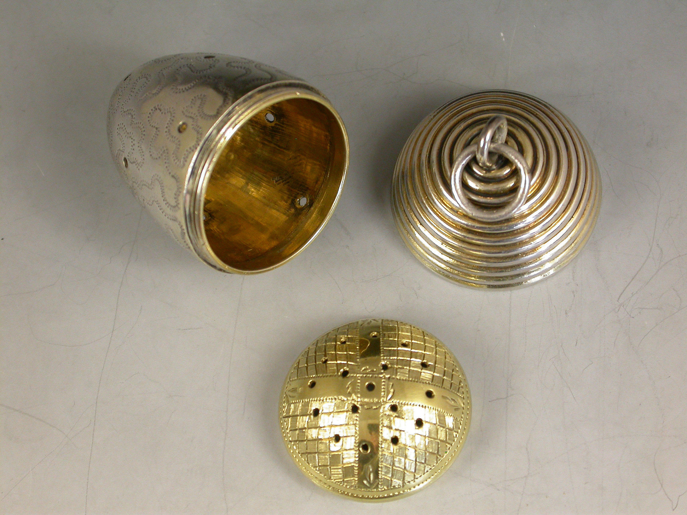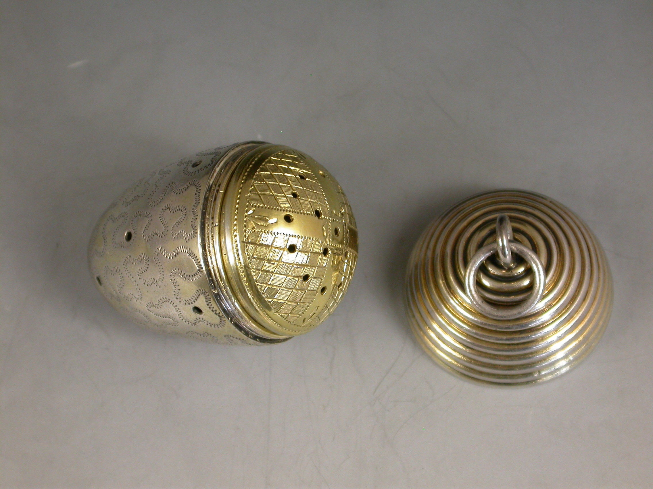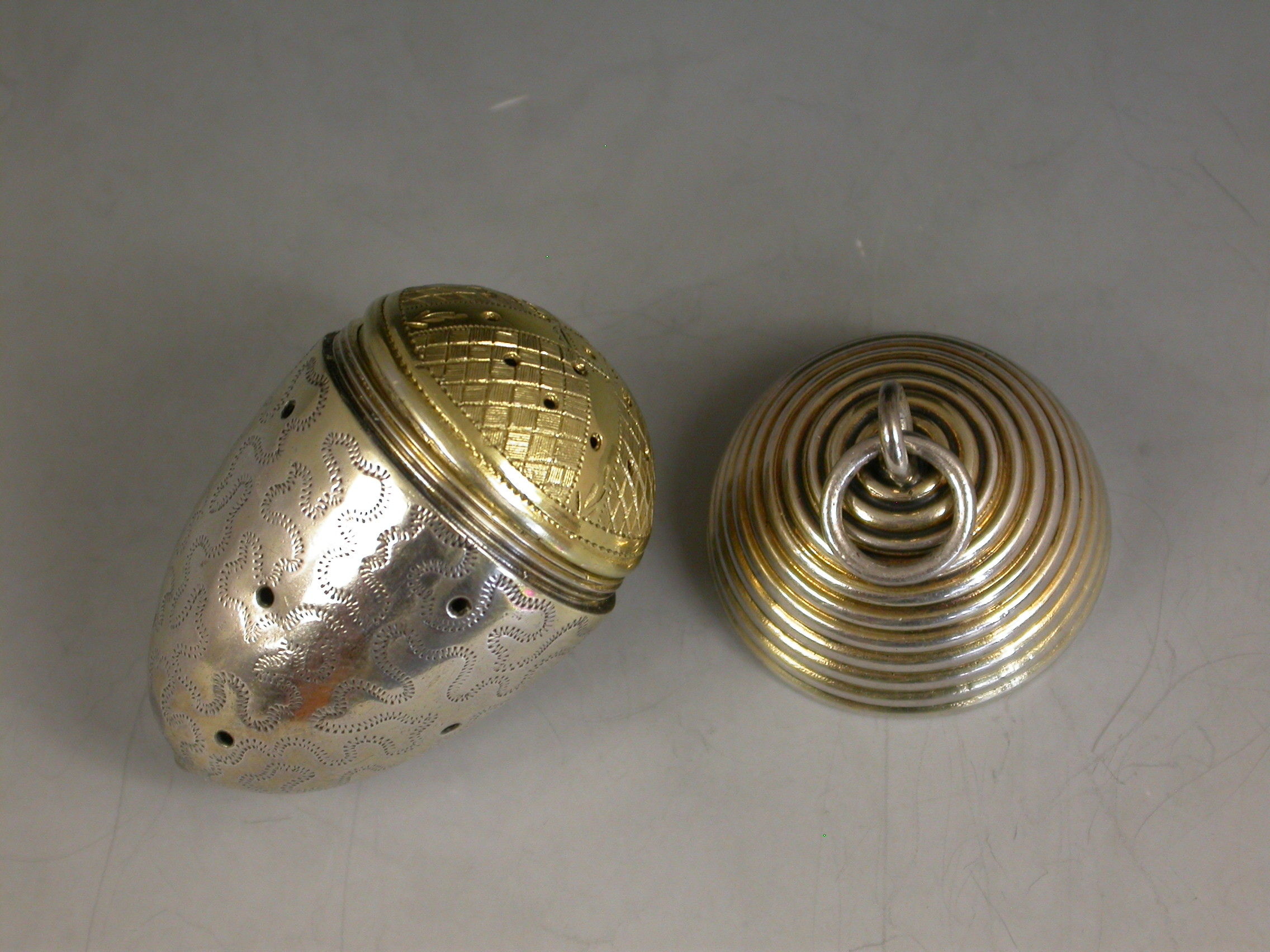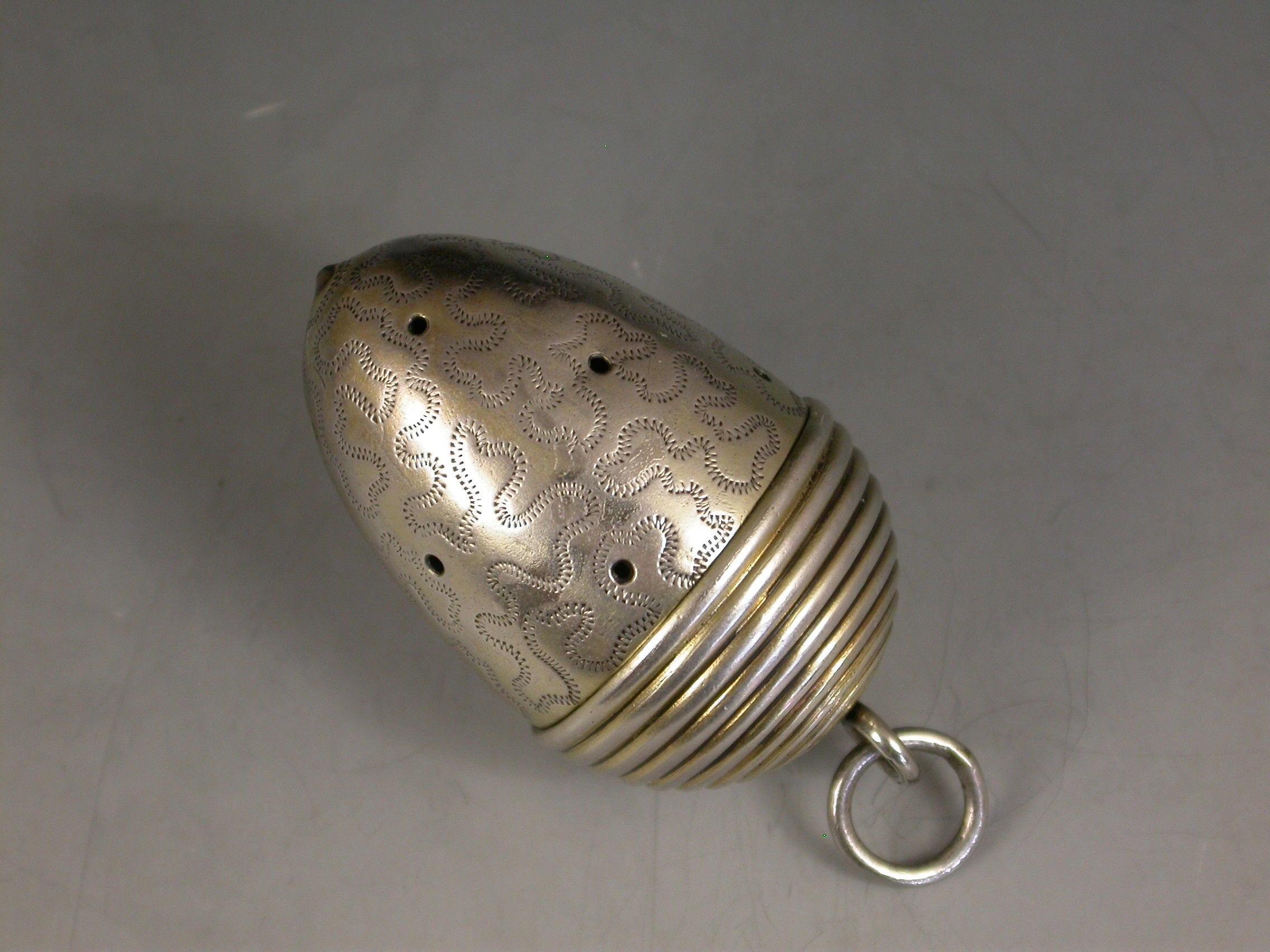 An extremely fine and rare George III novelty silver gilt Vinaigrette, made in the form of an Acorn with attached suspension ring, the pierced body engraved with wriggle work decoration, the ribbed screw off cover opening to reveal a finely pierced and bright-cut engraved silver gilt grille.