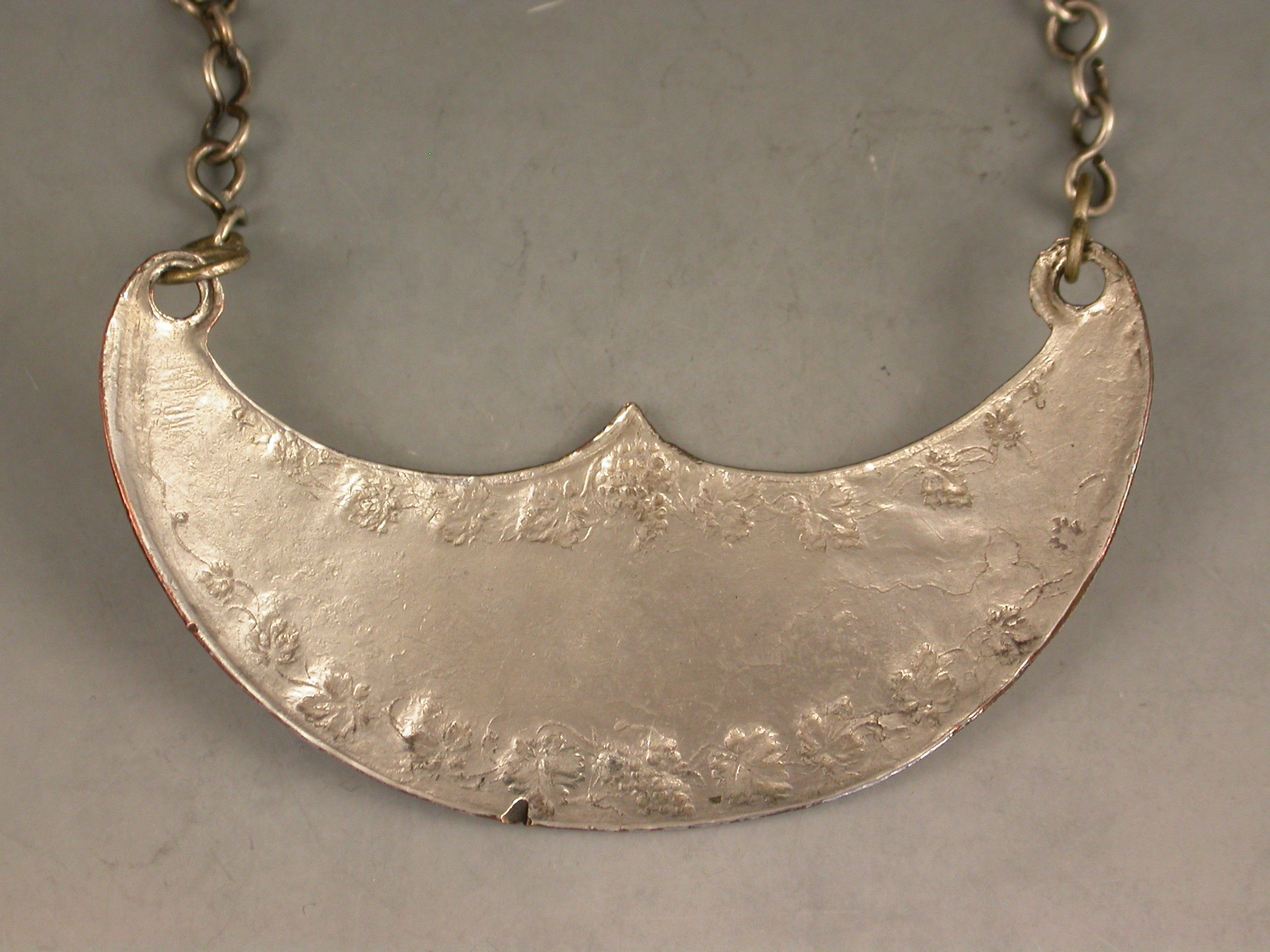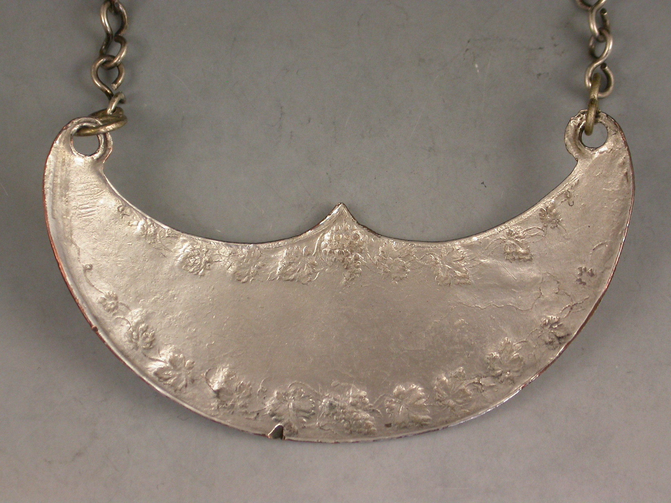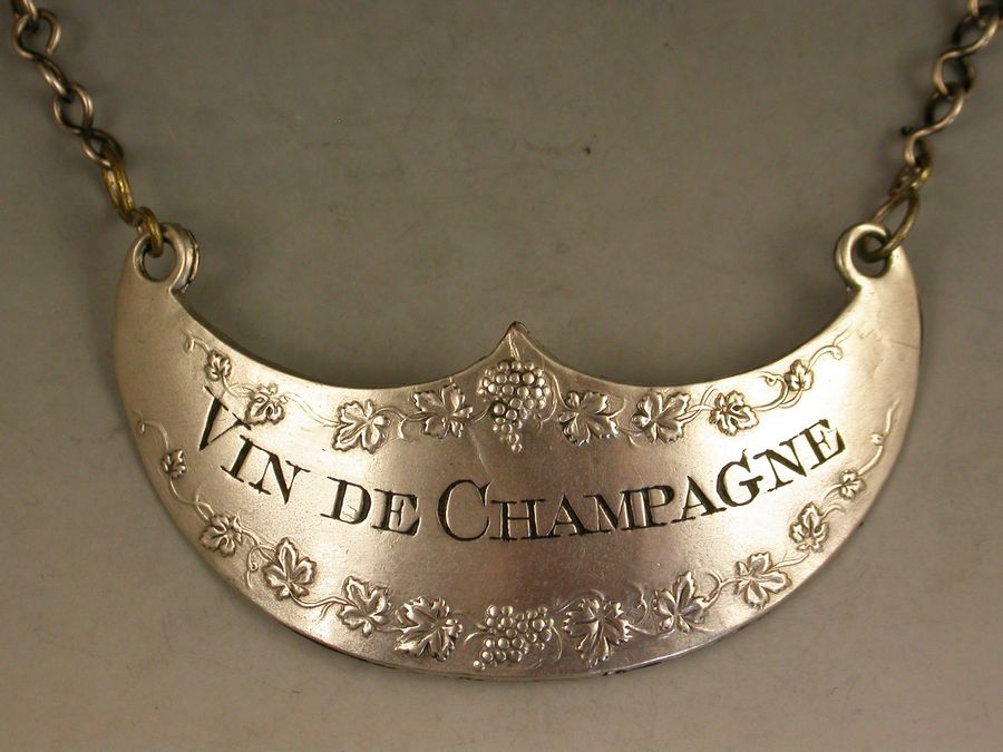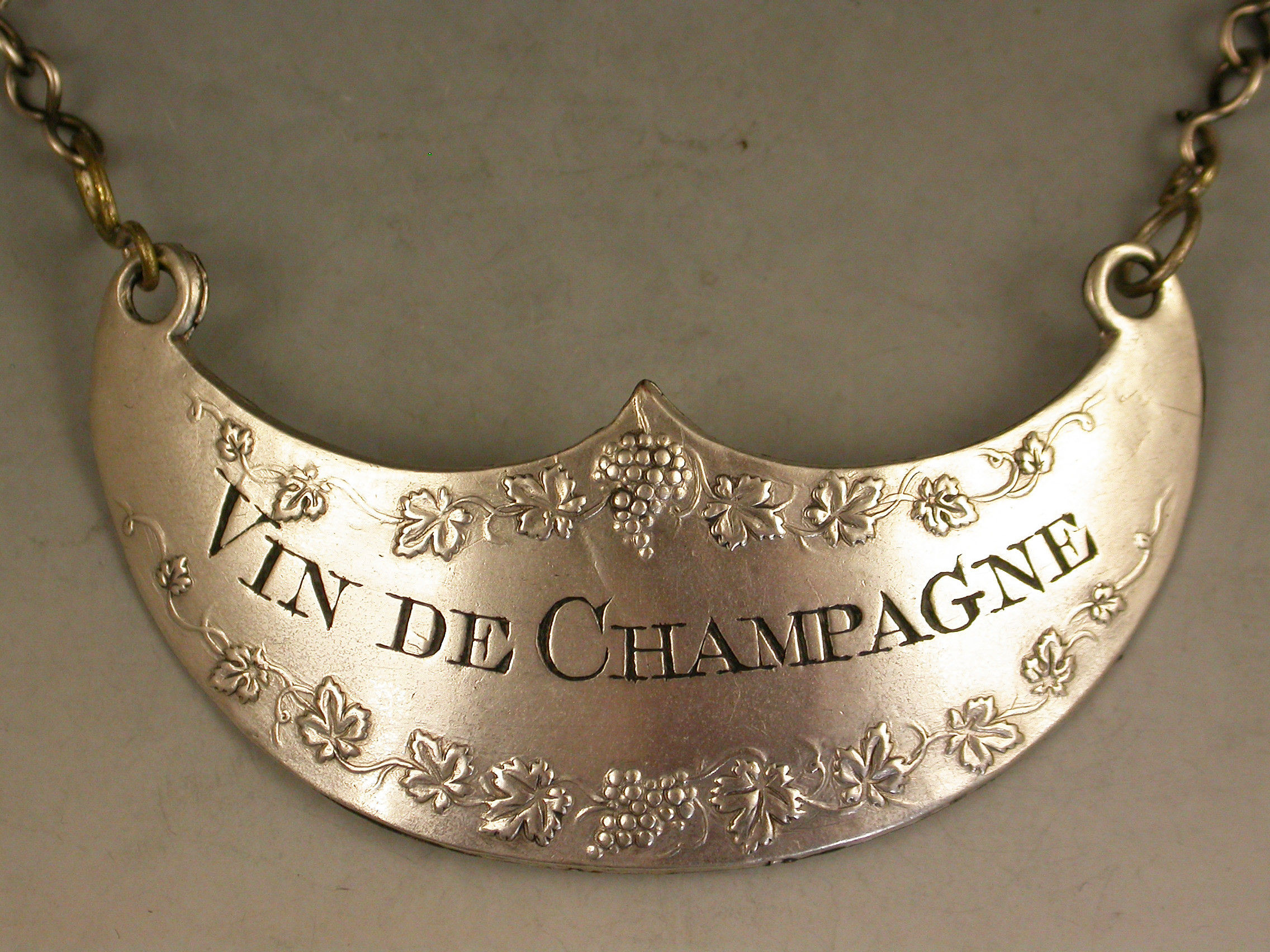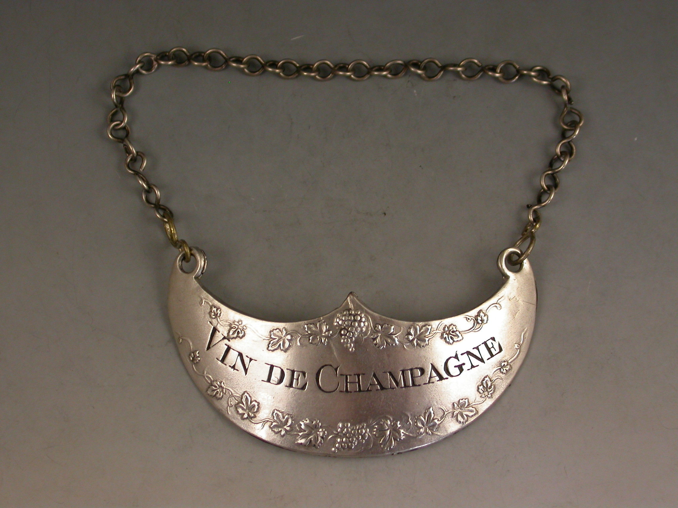 A rare late 18th century Old Sheffield Plate on copper Wine Label of large peaked crescent form with vine leaf and grape decoration, incised and niello filled for Vin De Champagne.