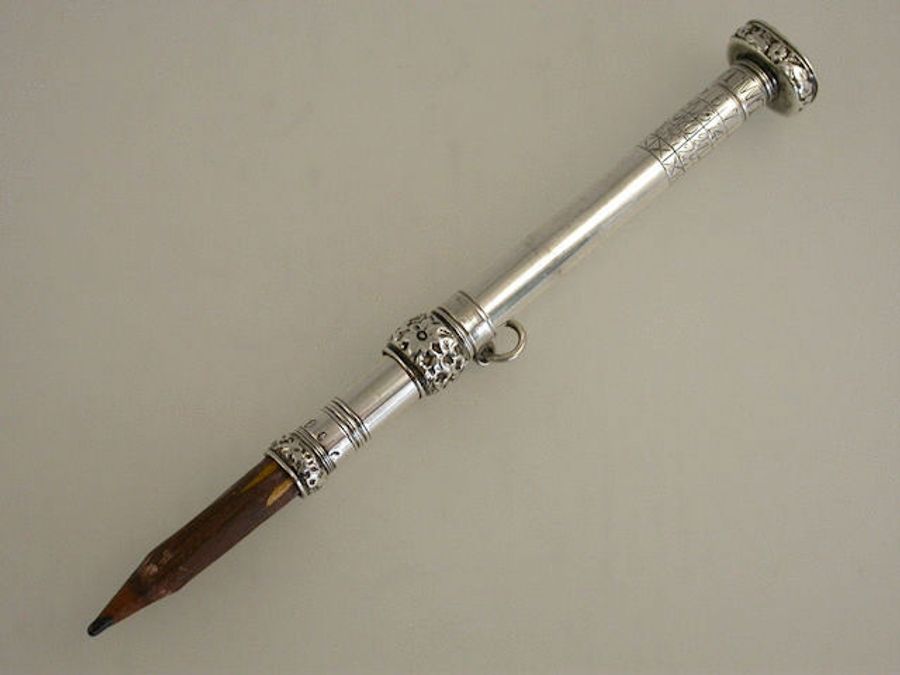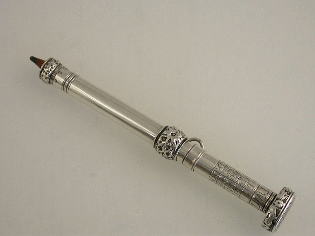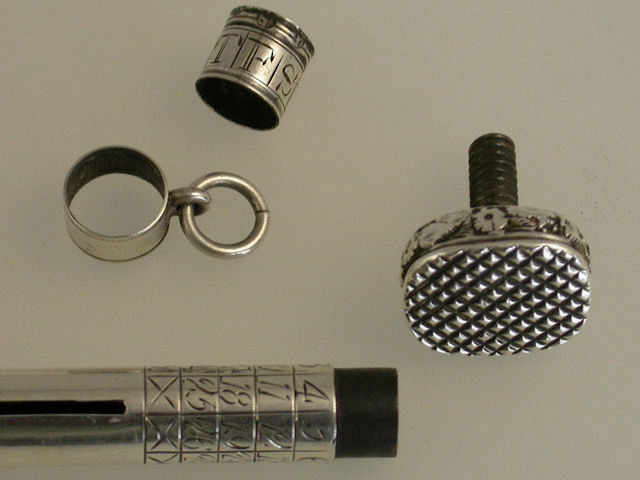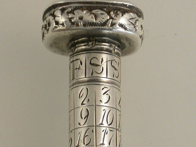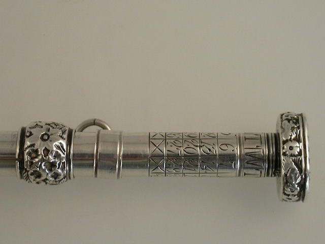 An extremely rare and early George III silver Porte Crayon combined with Perpetual Calendar and Seal, of cylindrical form with raised bands of foliate decoration, the diamond cut seal top unscrewing and securing the adjustable collar for the perpetual calendar.