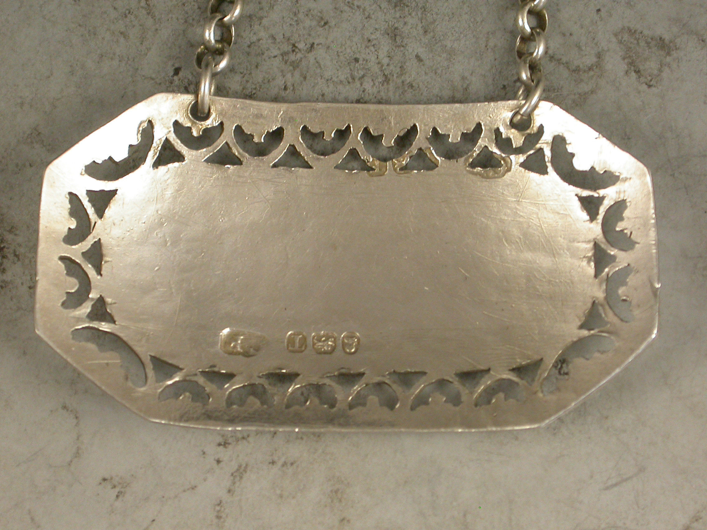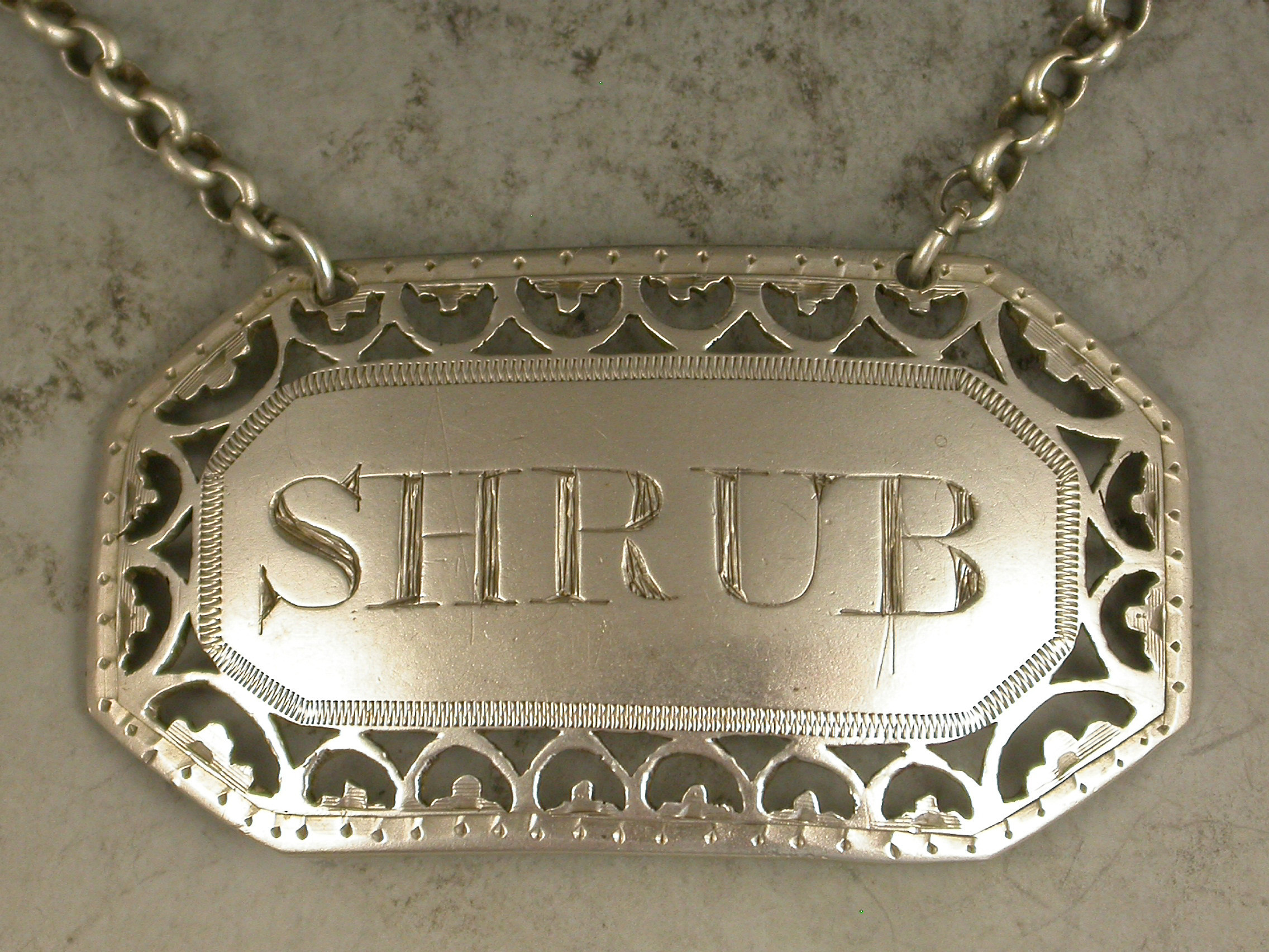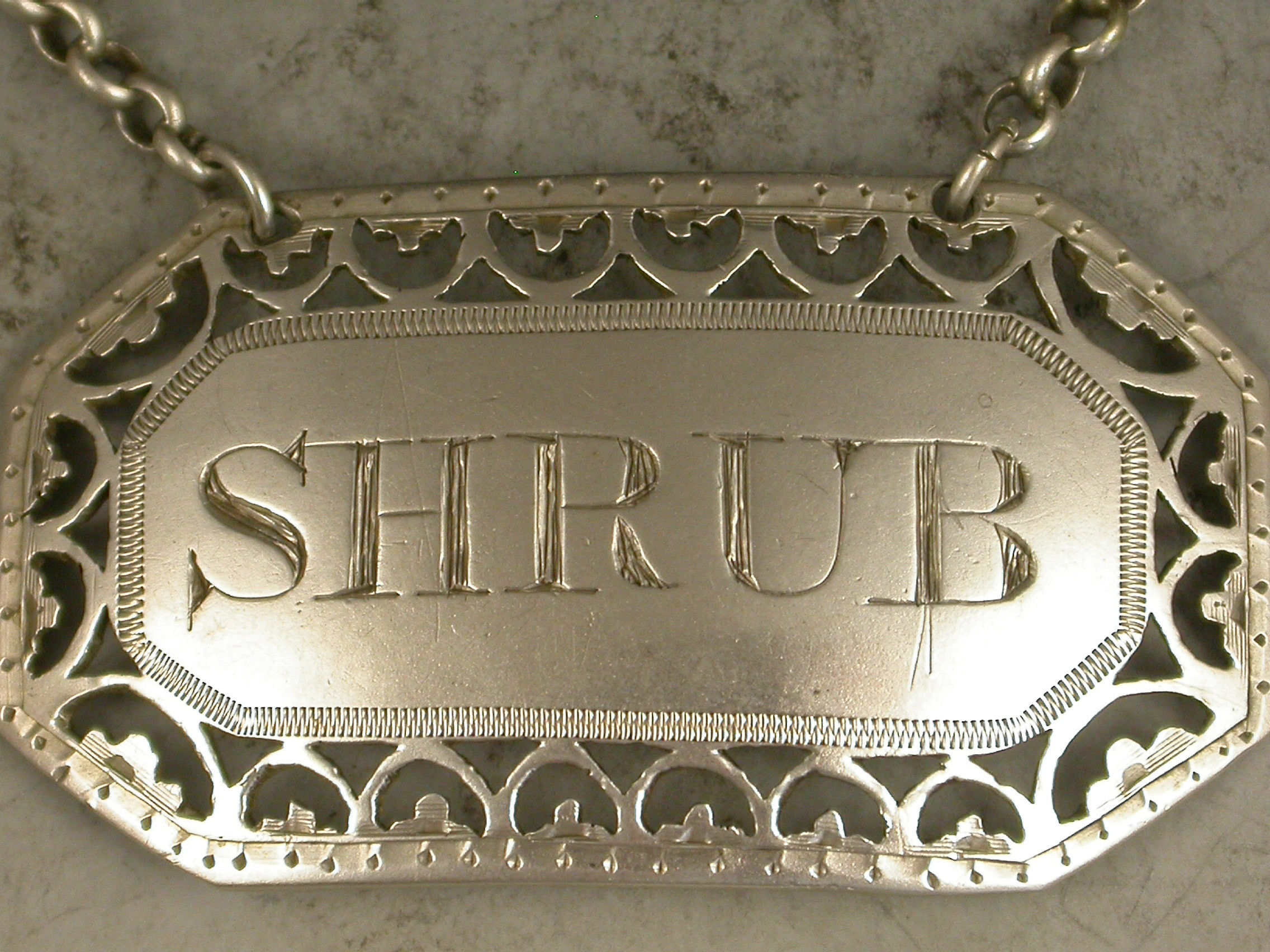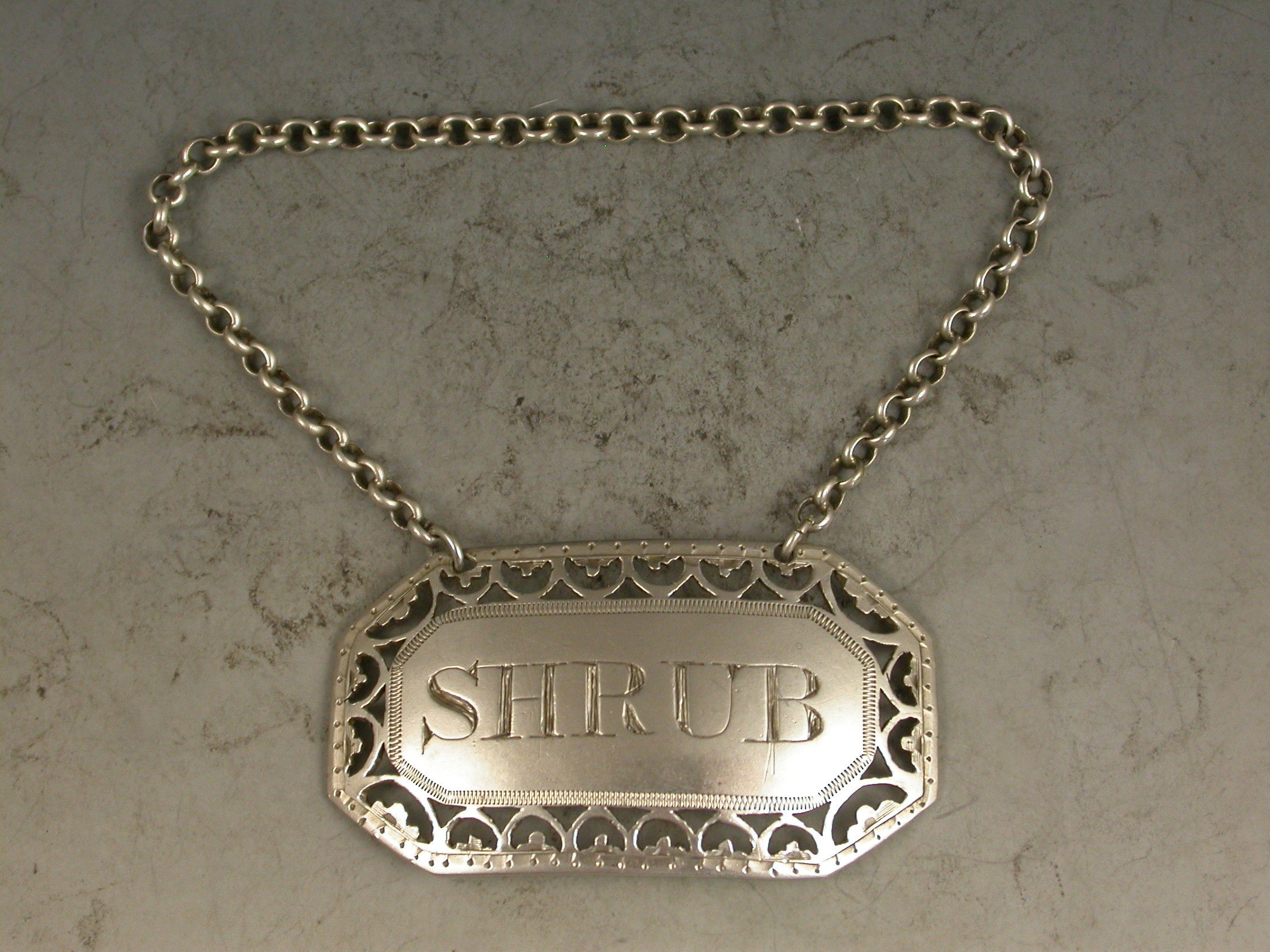 A fine George III silver Wine Label of rectangular form with cut-corners, the border finely pierced with hoops and trefoils, the name plate incised for Shrub.