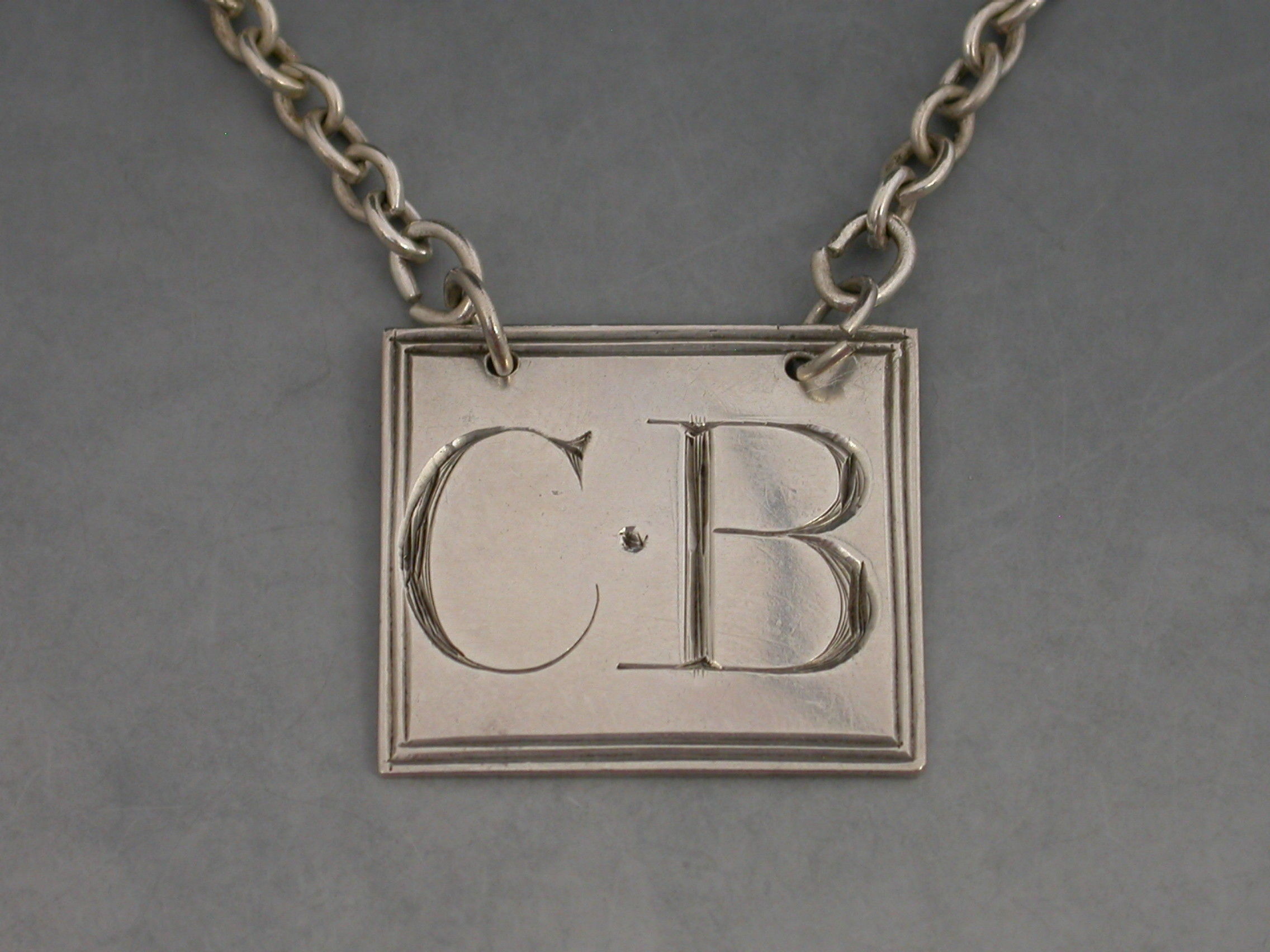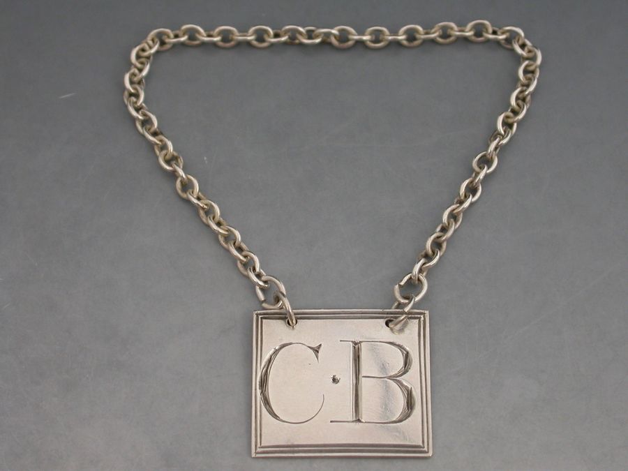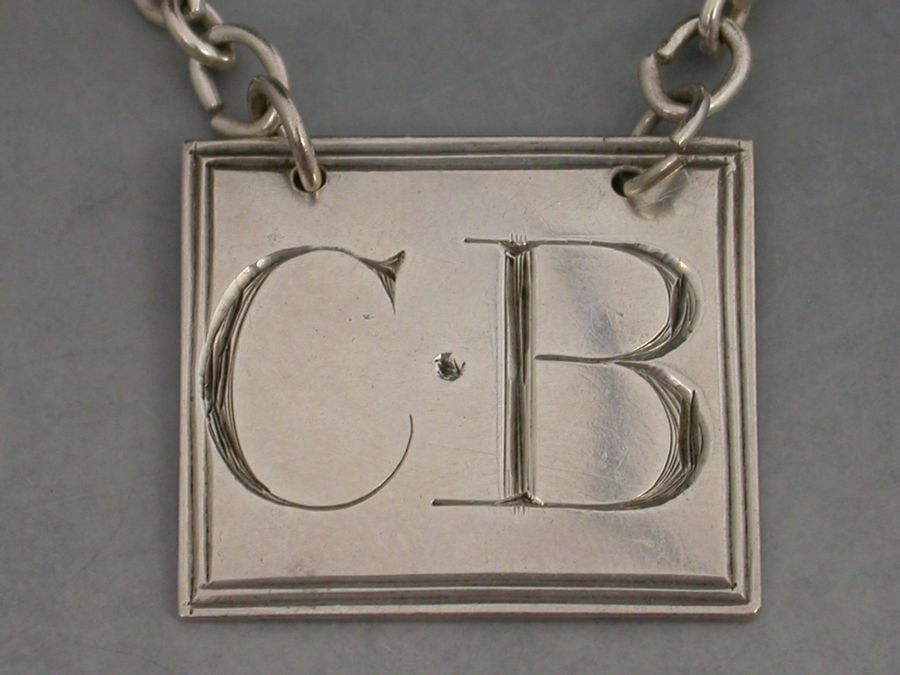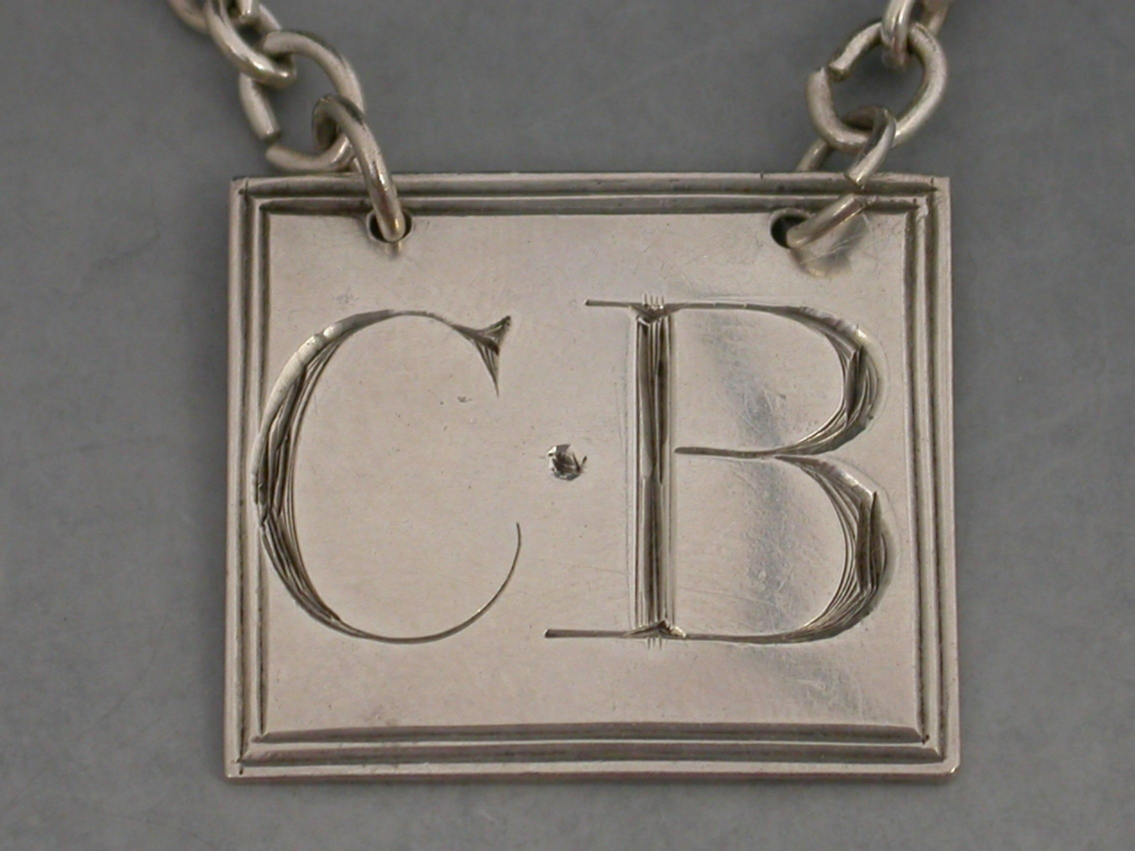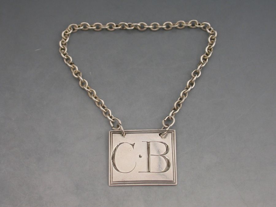 A rare George III silver Wine Label of rectangular ""postage stamp"" form, with double reeded border, incised for 'C.B' (Cherry Brandy).