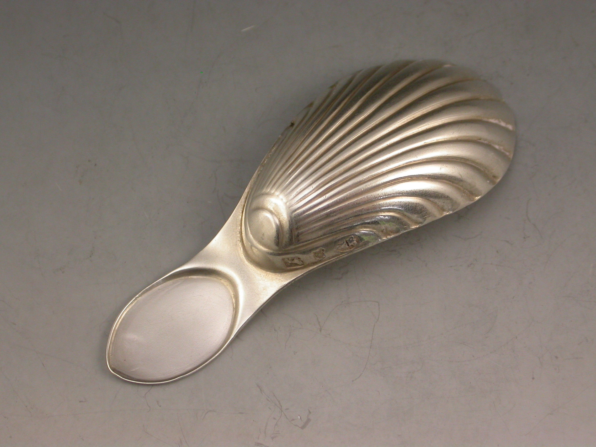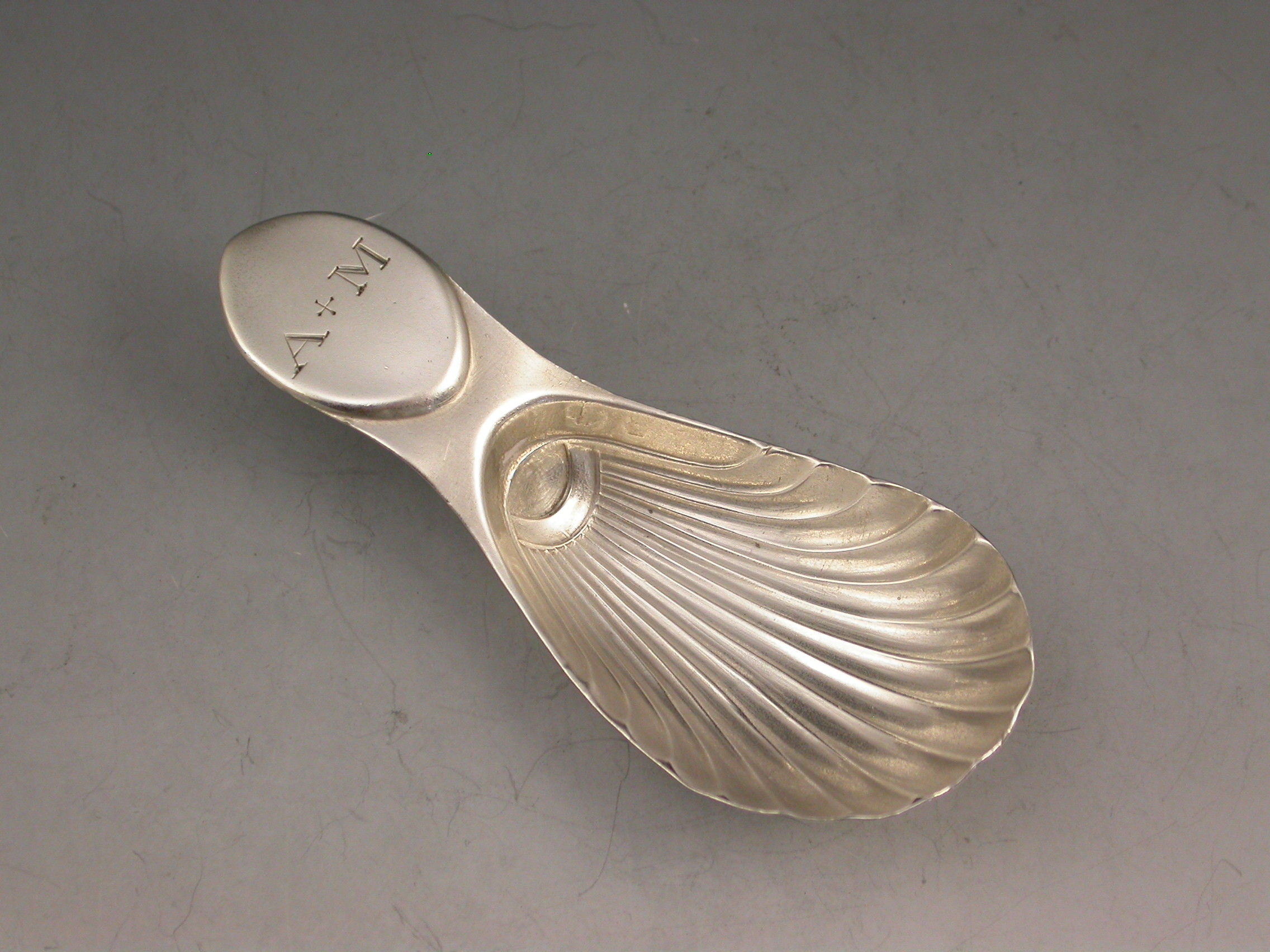 A good George III Provincial silver Caddy Spoon of typical Sheffield form with elongated fluted shell bowl and oval ""button handle"" engraved with contemporary initials.