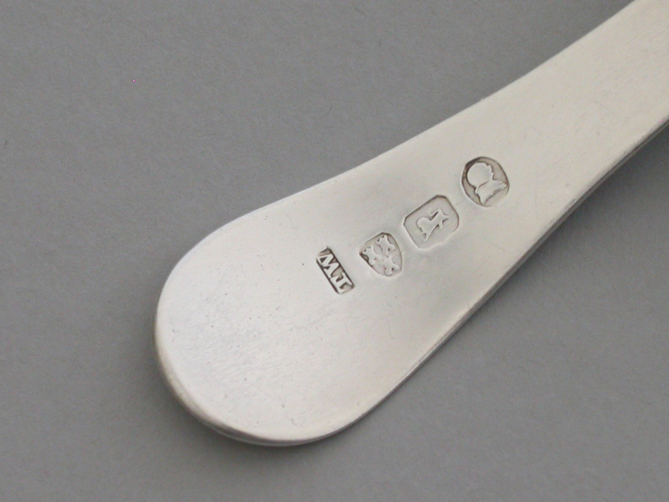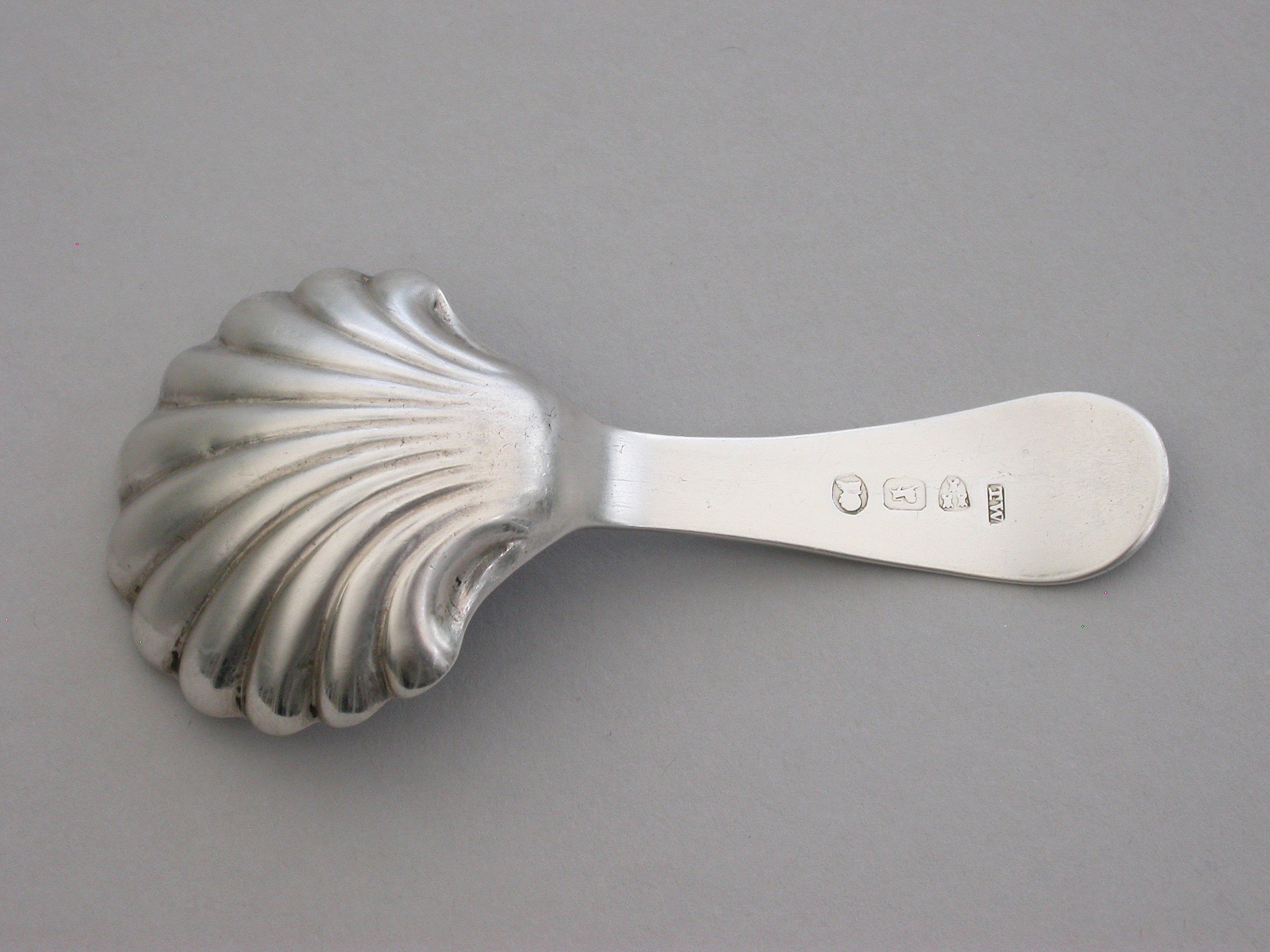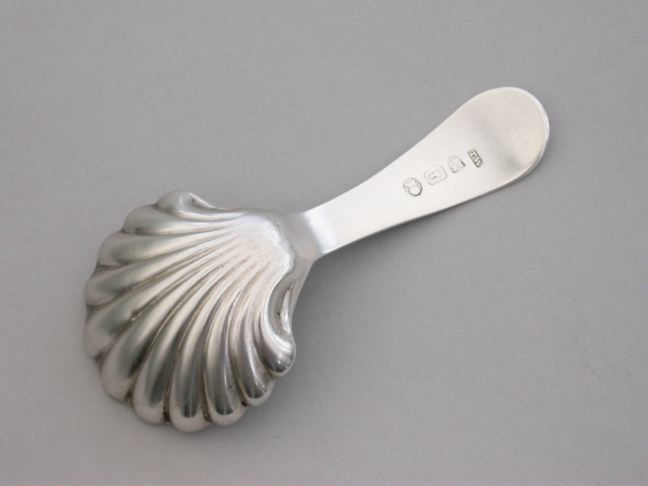 A rare George III Provincial silver Caddy Spoon with shell bowl, the wide Old English handle engraved with contemporary script initials.