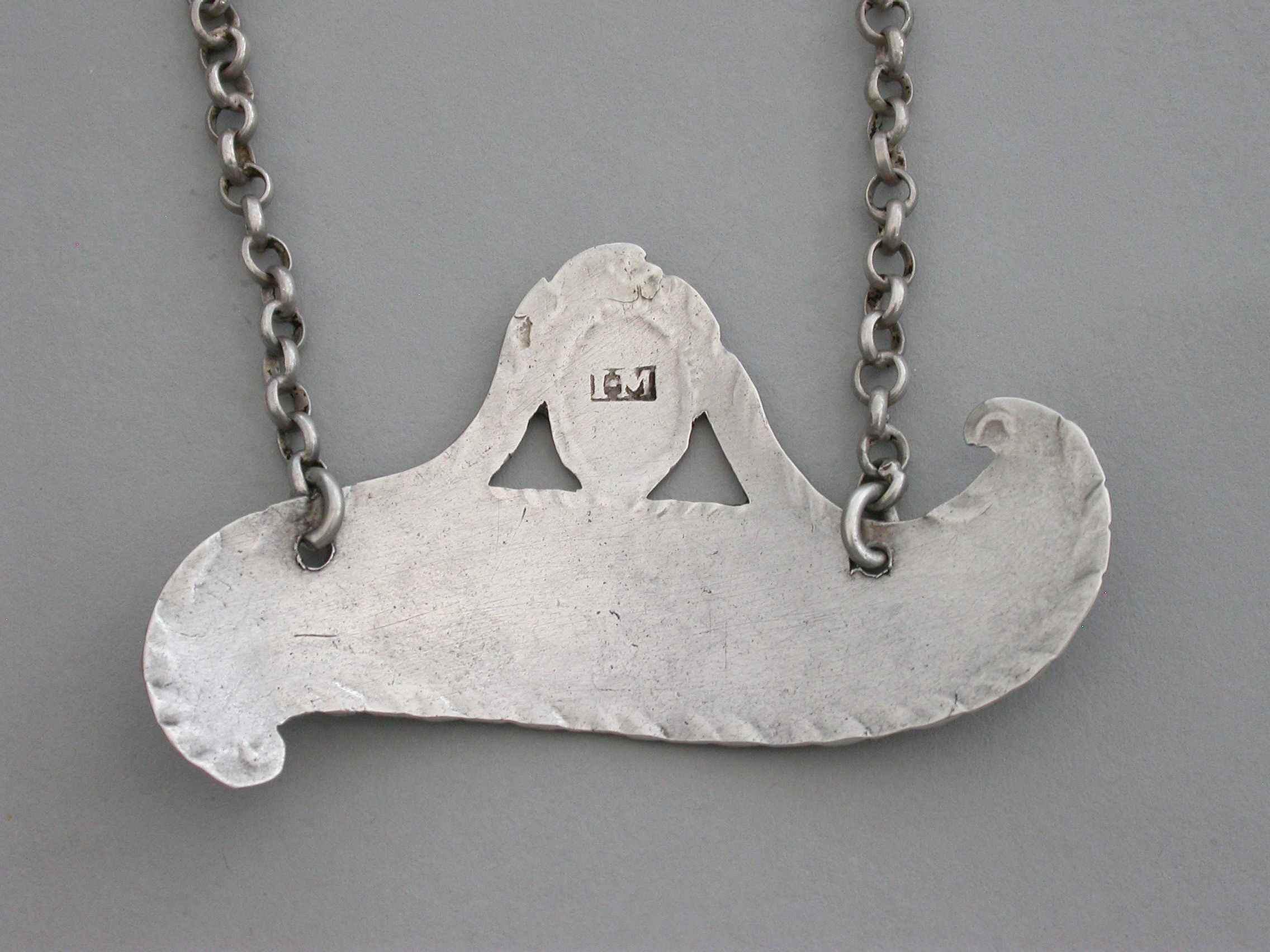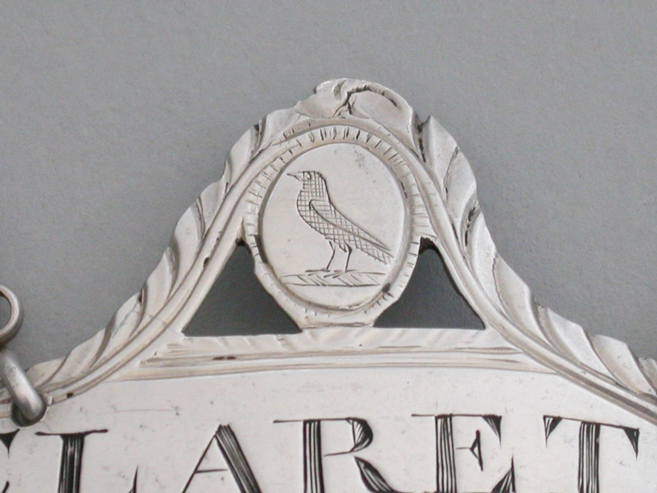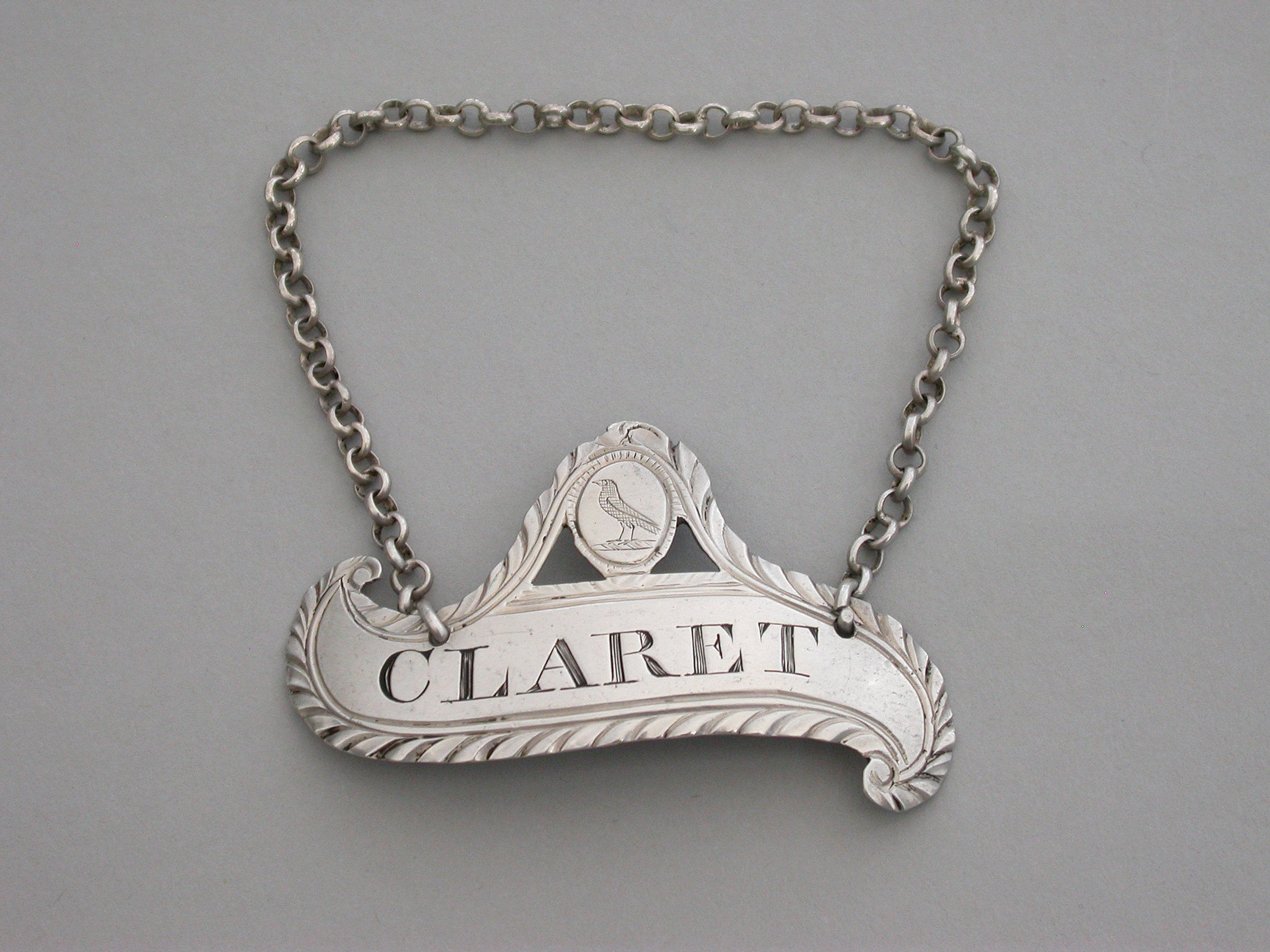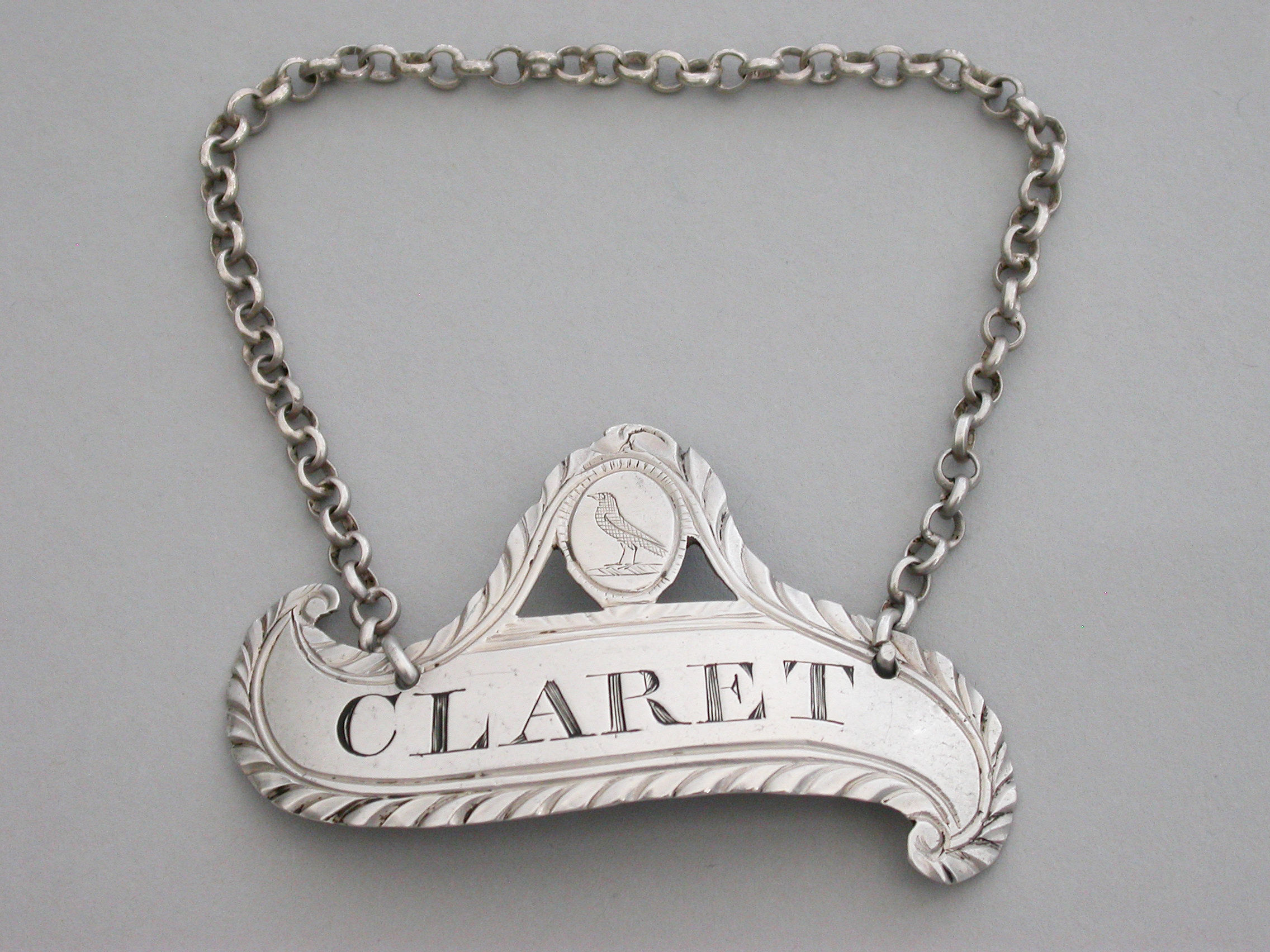 An extremely rare 18th century Provincial silver Wine Label of scroll form with oval cartouche surmount engraved with a crest, feather edge border, incised for CLARET. The crest of a Raven or Chough is that of many families.