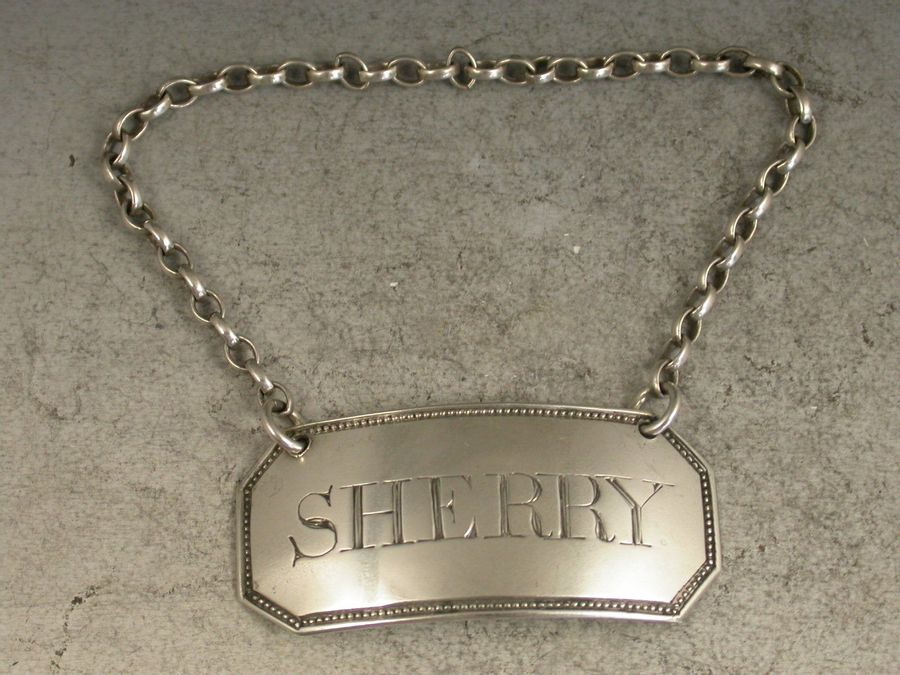 An unusual English Provincial or Scottish silver Wine Label of cut-cornered rectangular form with beaded border, incised for Sherry c1800.