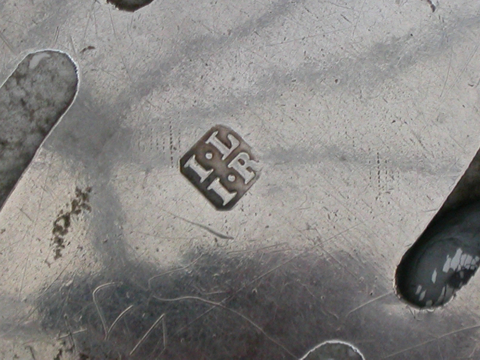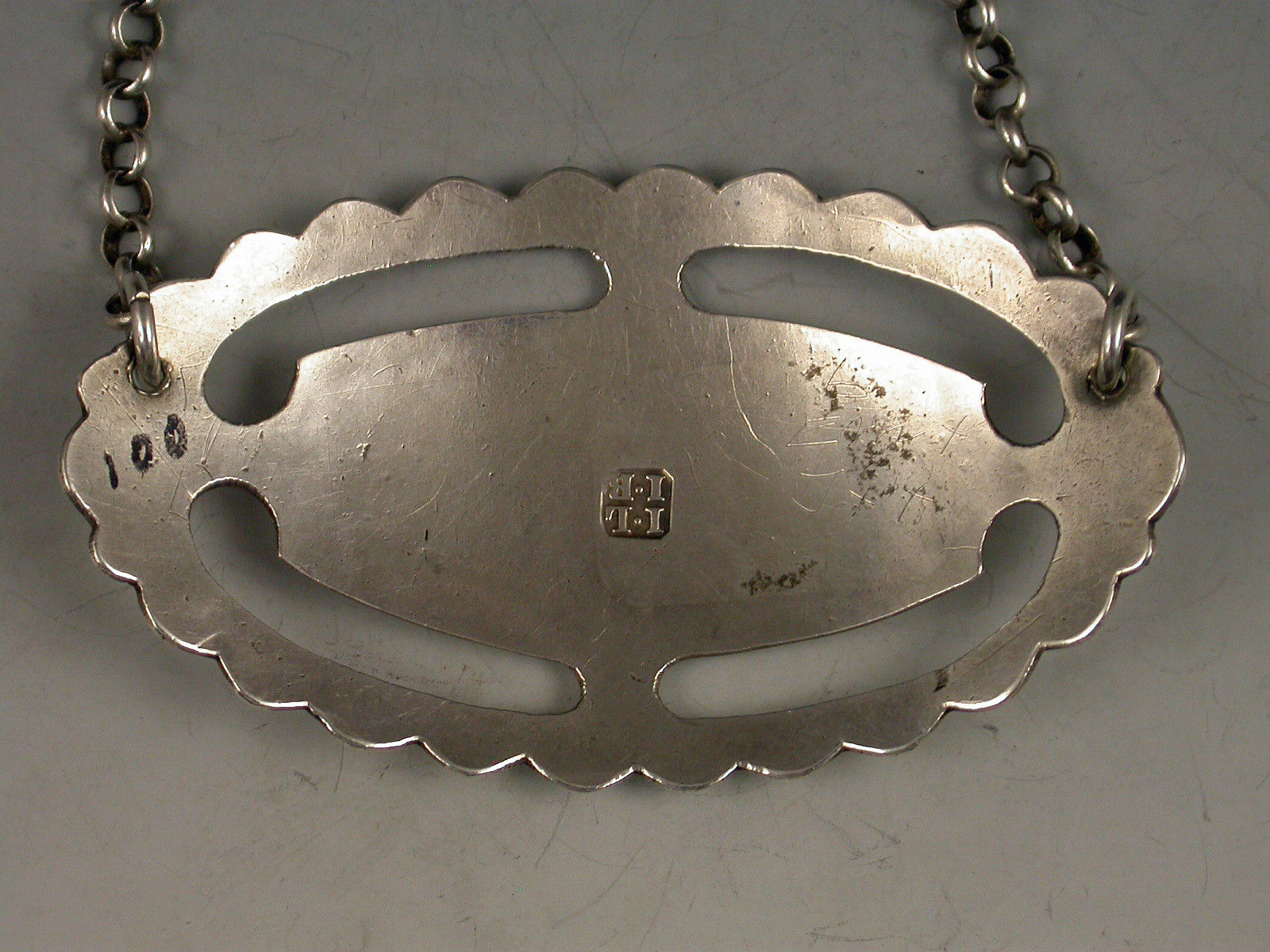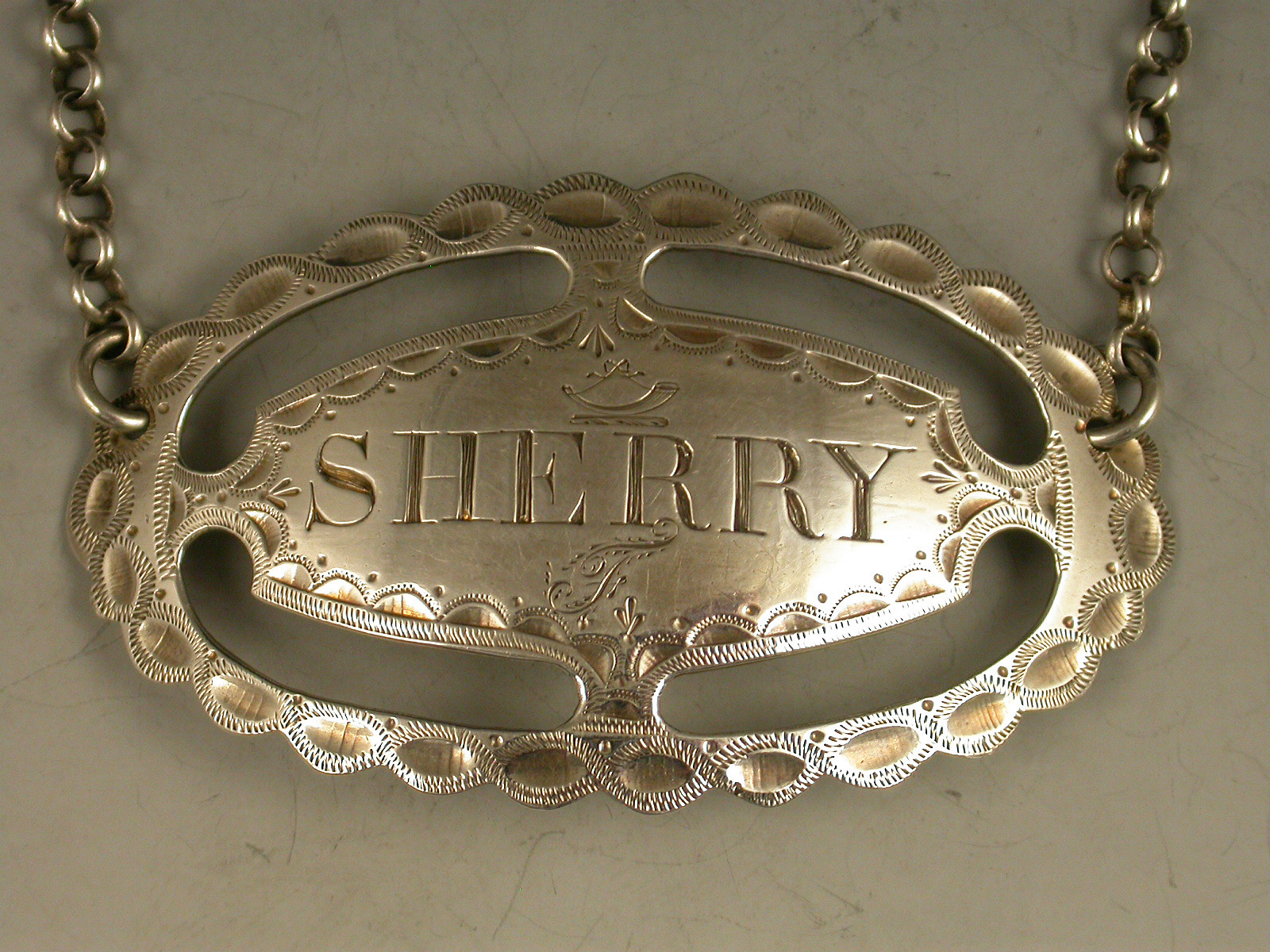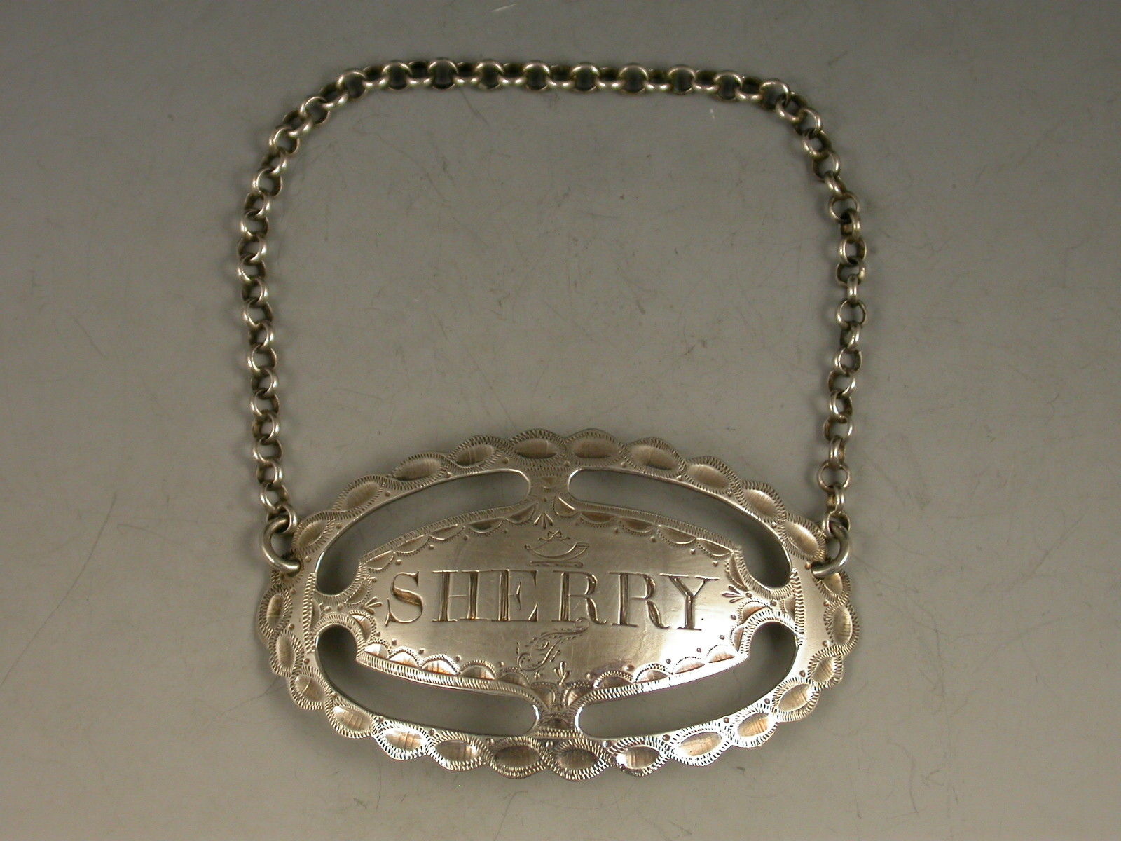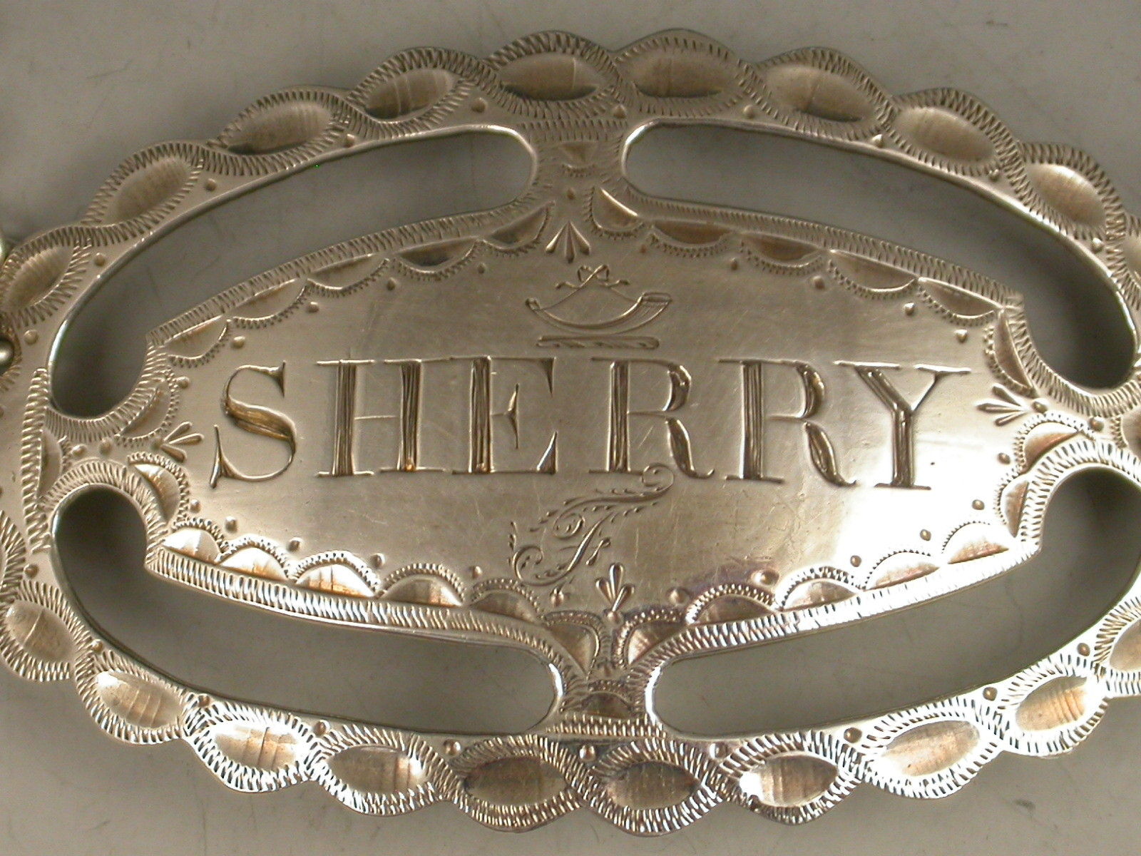A rare George III Provincial silver Wine Label of pierced oval form with bright cut engraved decoration, incised for Sherry between a crest depicting a Bugle and a contemporary initial 'F'.