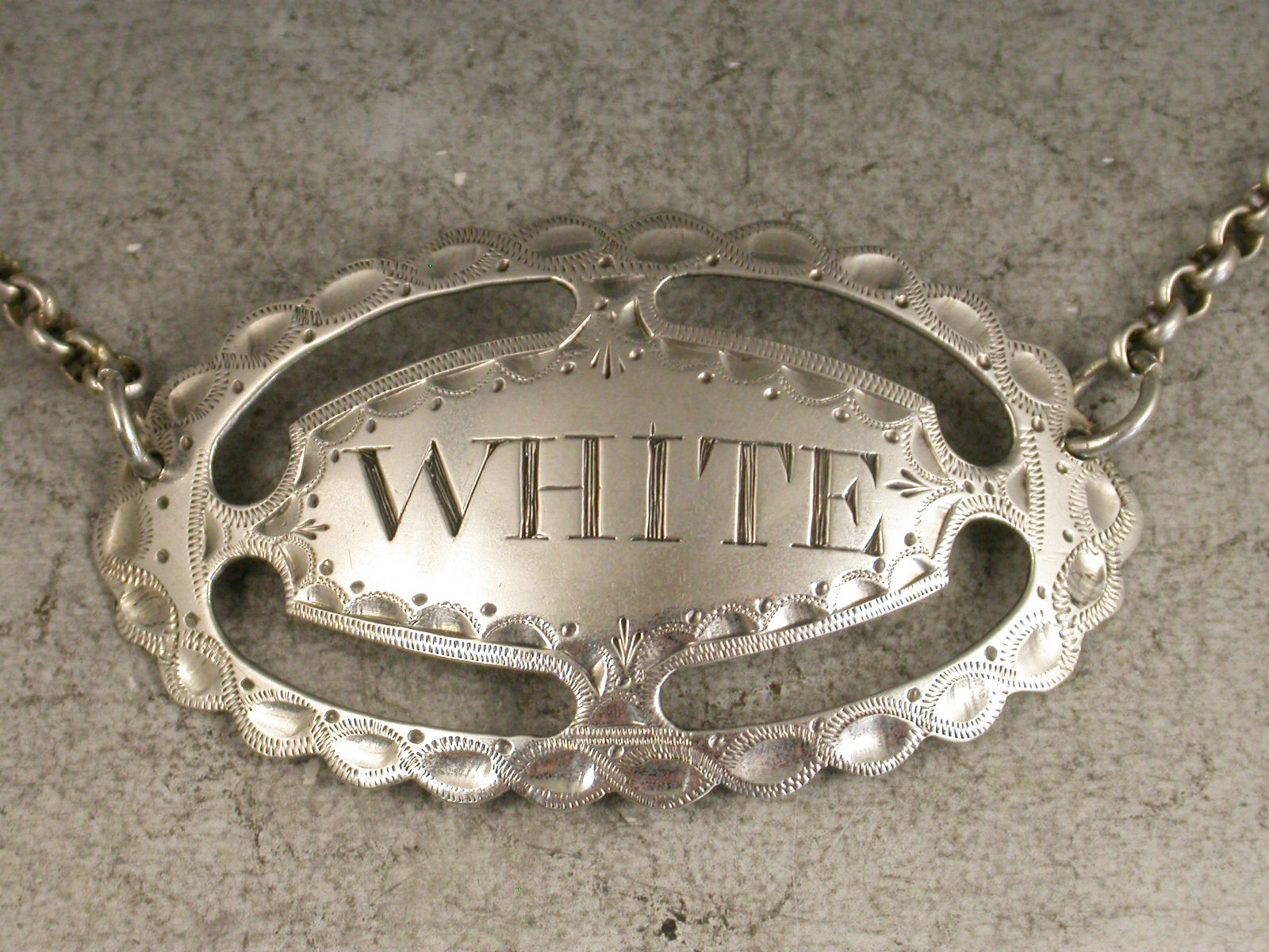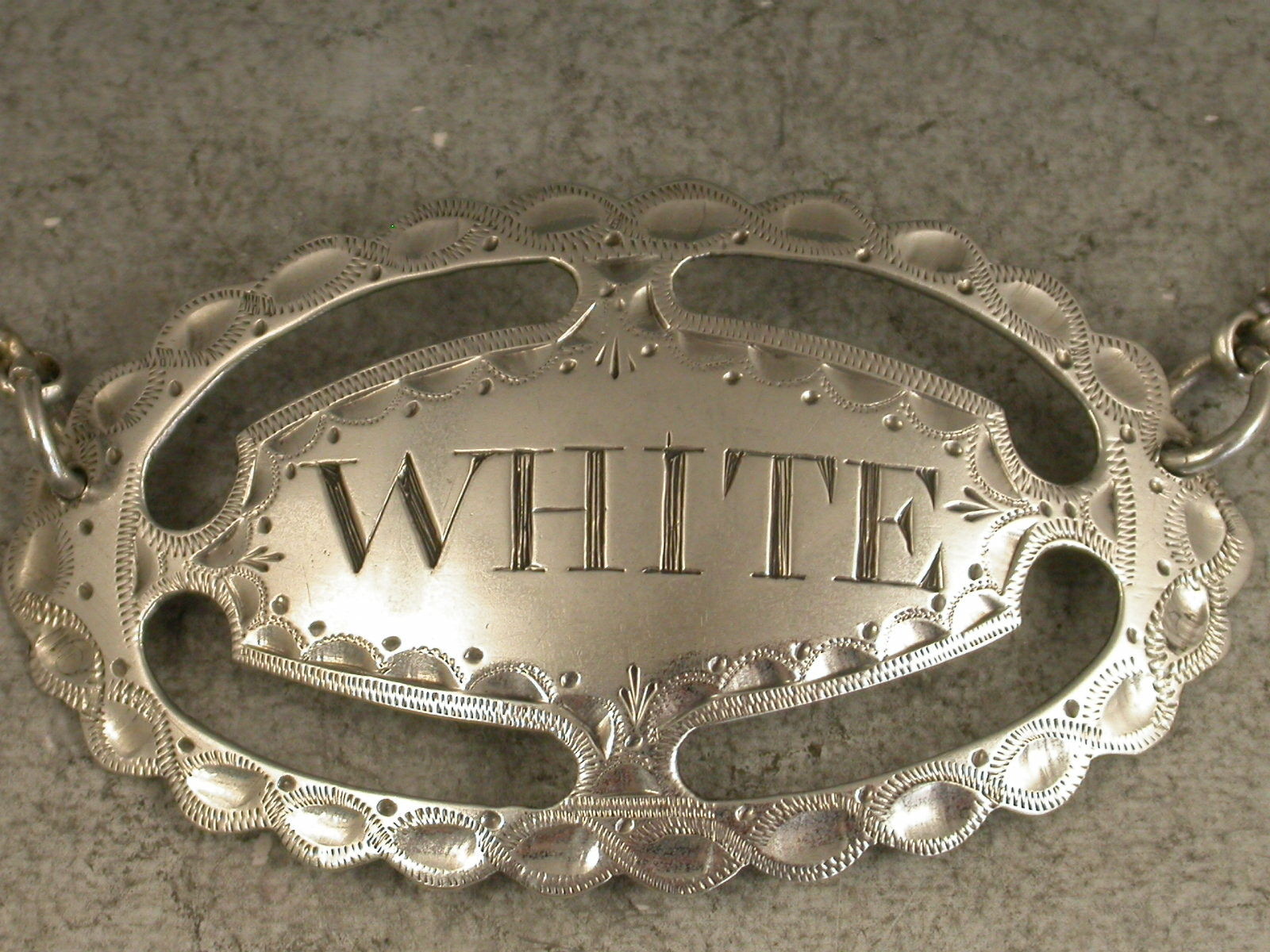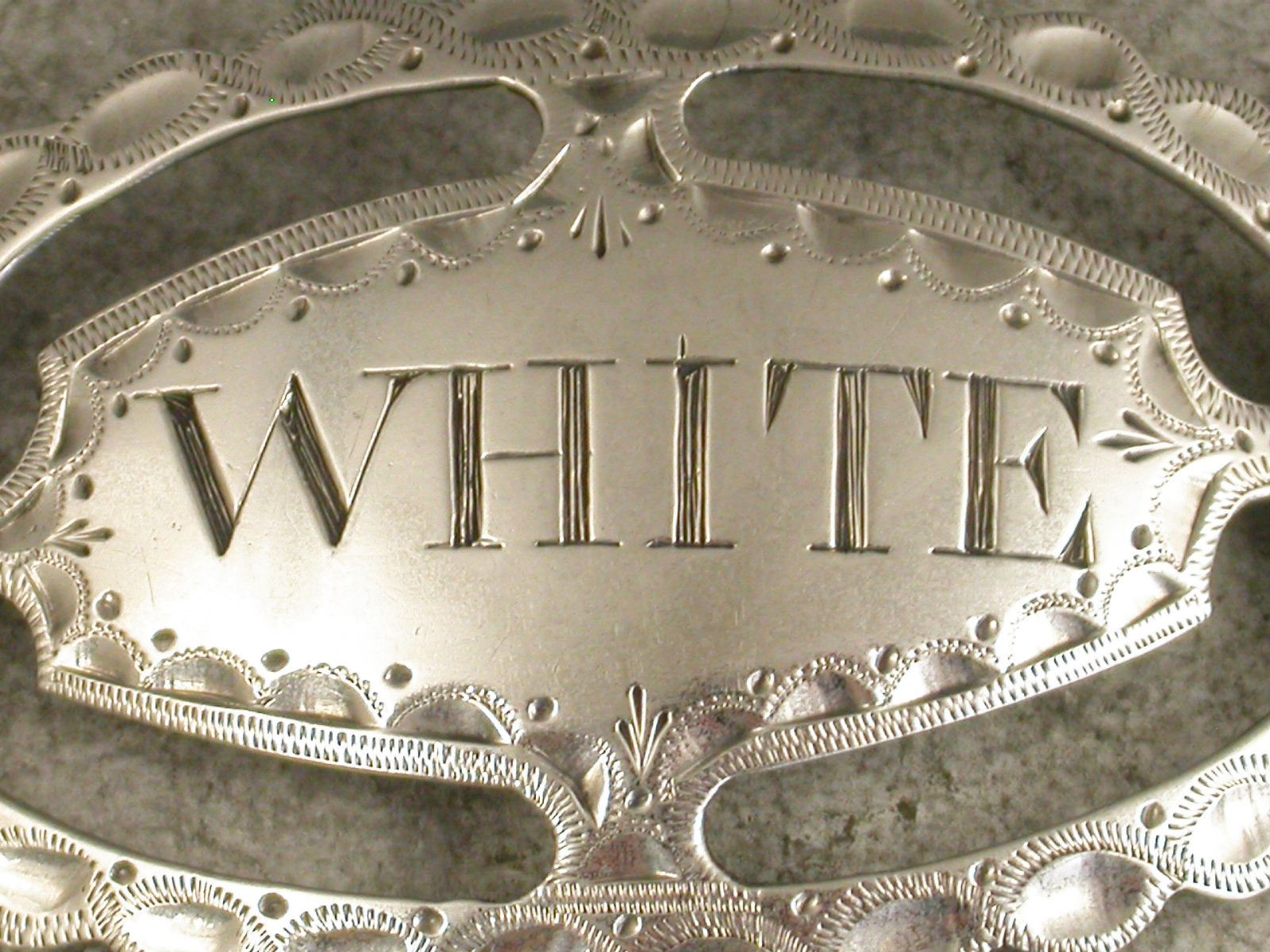 An extremely fine and rare George III Provincial silver Wine Label of pierced oval form with bright-cut and prick dot engraved decoration to the borders, incised for White.