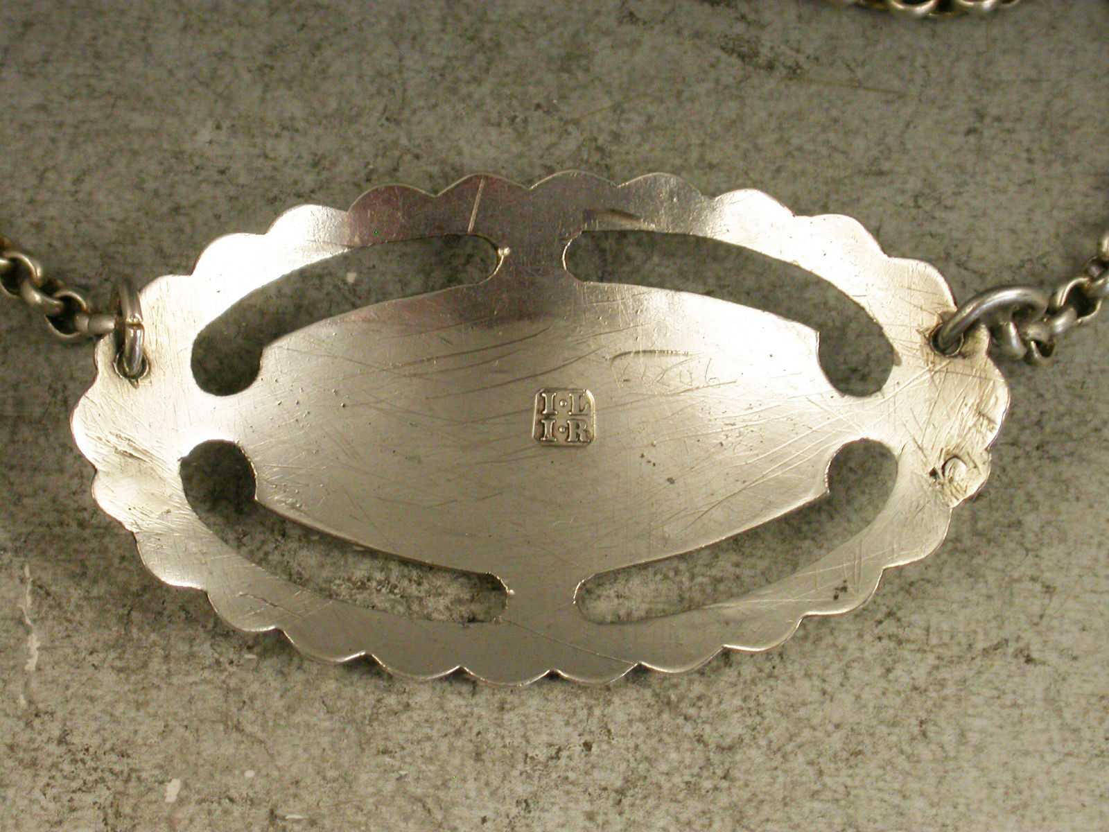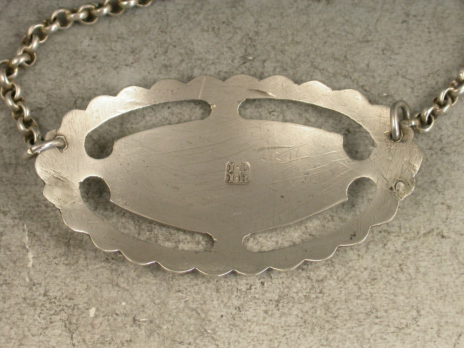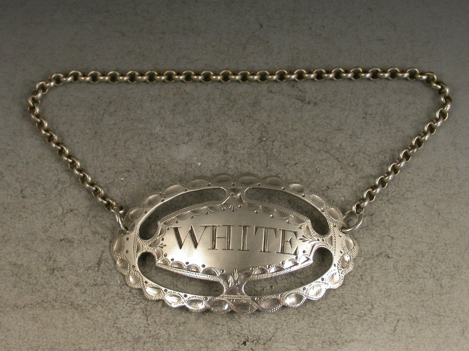 An extremely fine and rare George III Provincial silver Wine Label of pierced oval form with bright-cut and prick dot engraved decoration to the borders, incised for White.