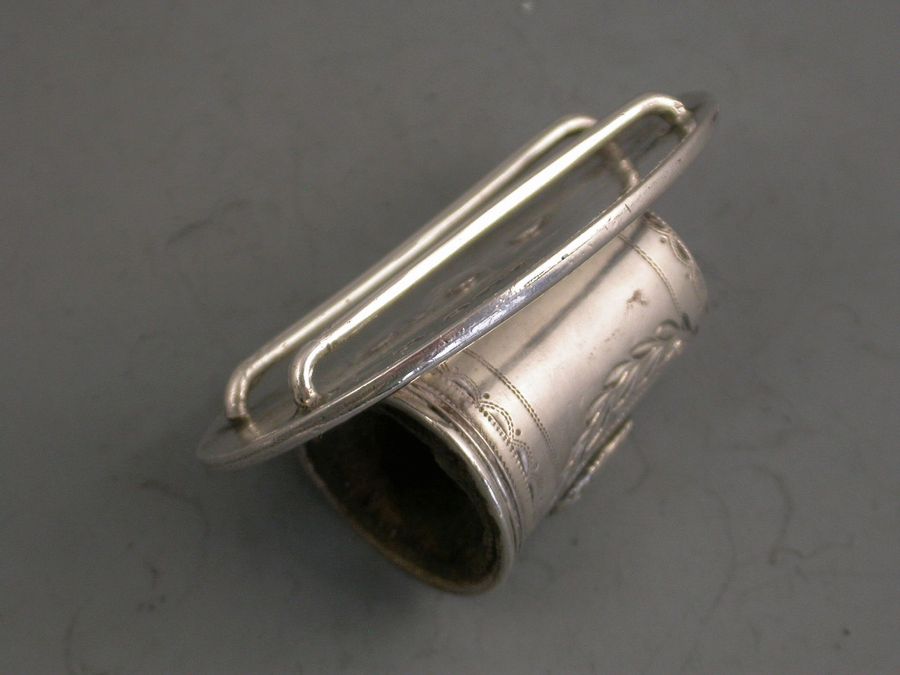 A rare George III Regimental silver Standard Bearer's Staff Holder in the form of a tapering thimble shaped cup on an oval back plate with belt loops, the holder with applied lion mask and engraved with the emblem of the Light Infantry.