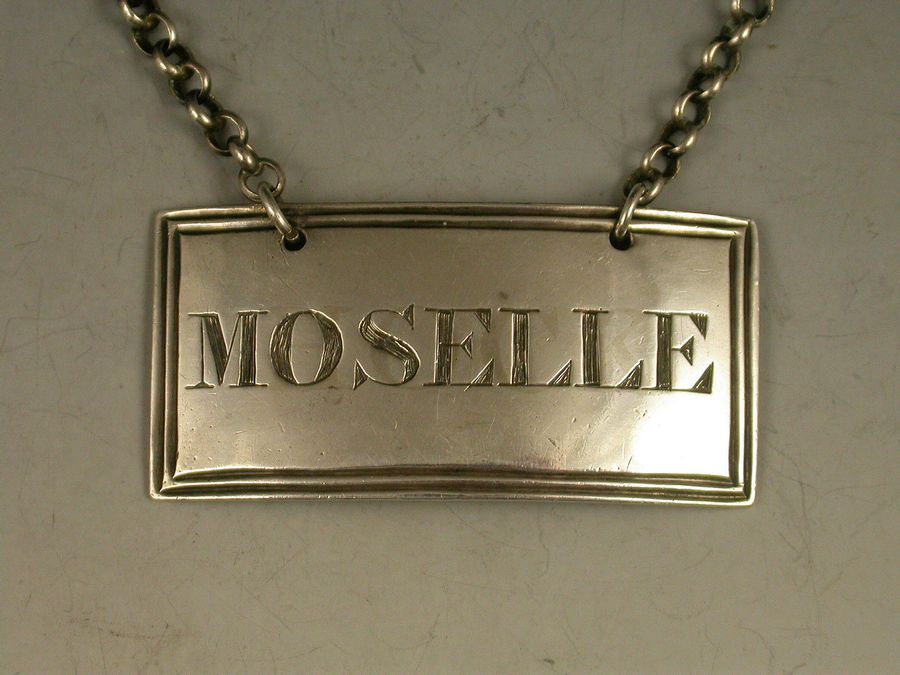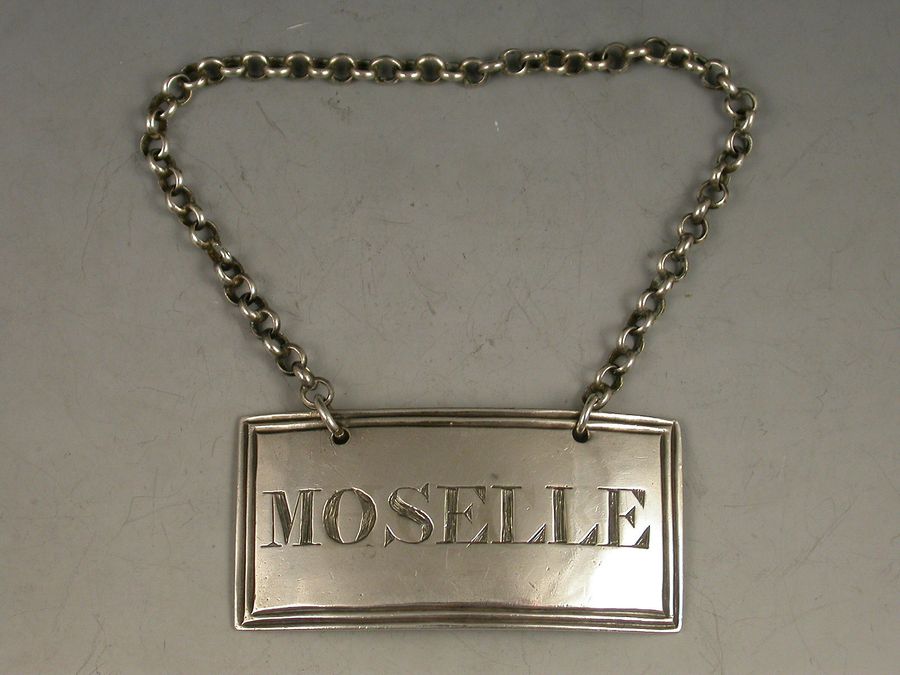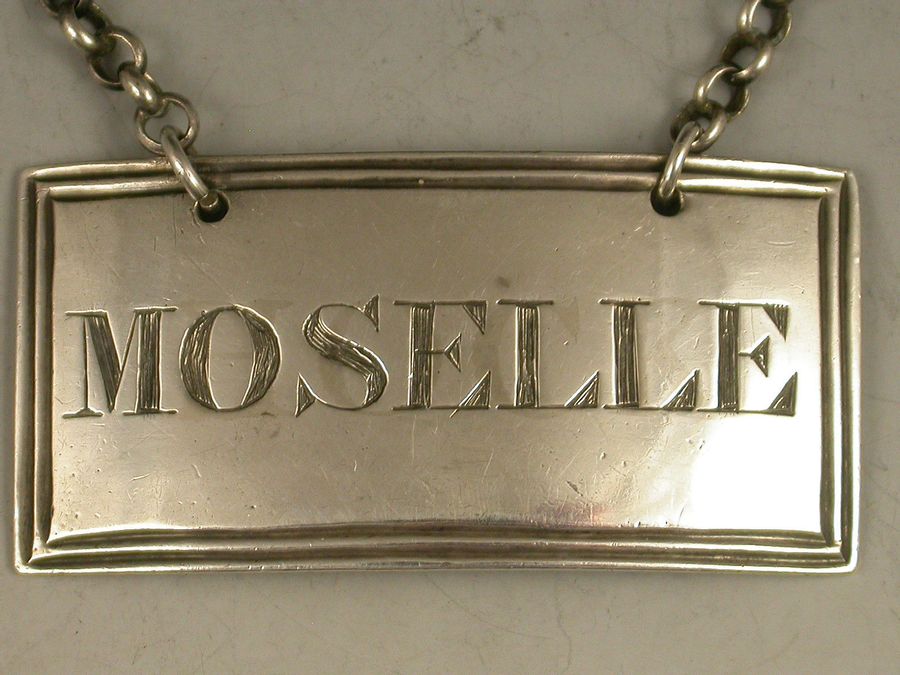 An extremely rare George III Royal silver Wine Label of plain rectangular form with double reeded border, incised for Moselle over the original title for Hock.