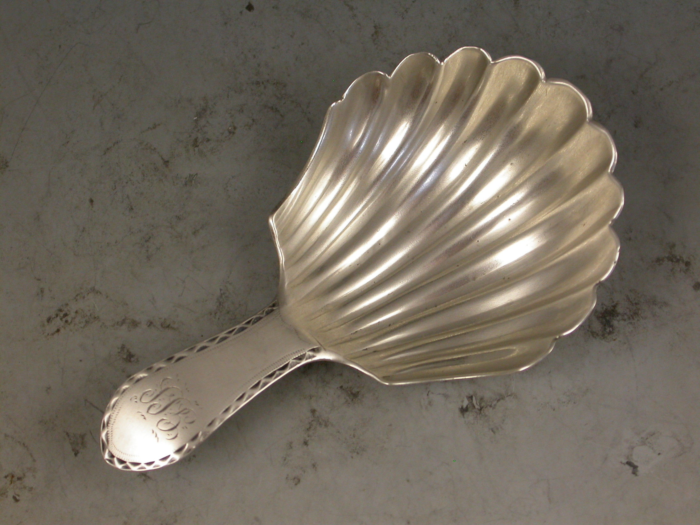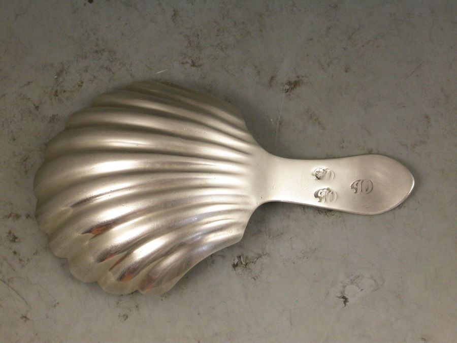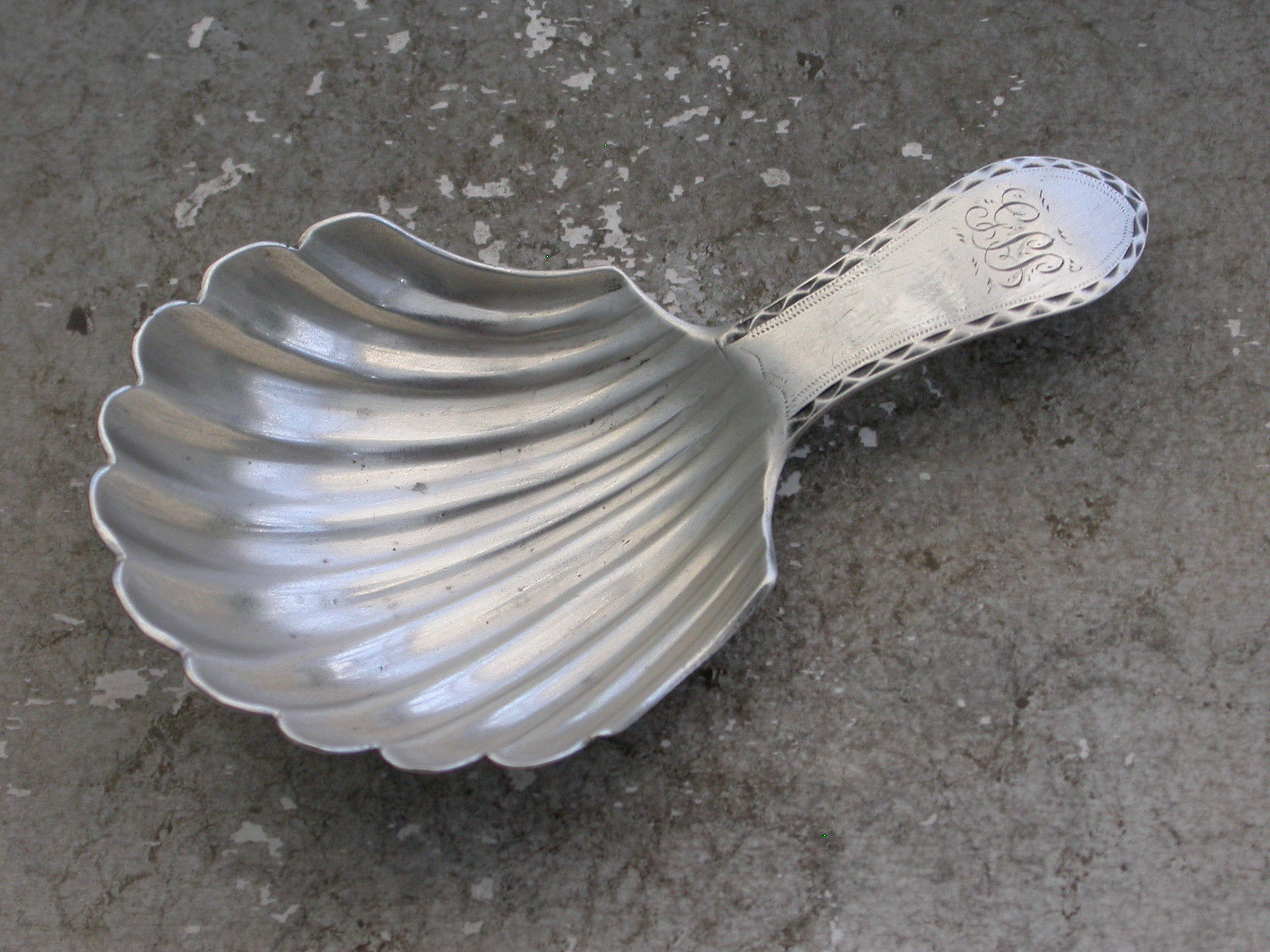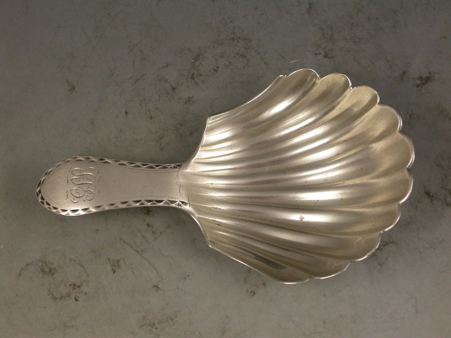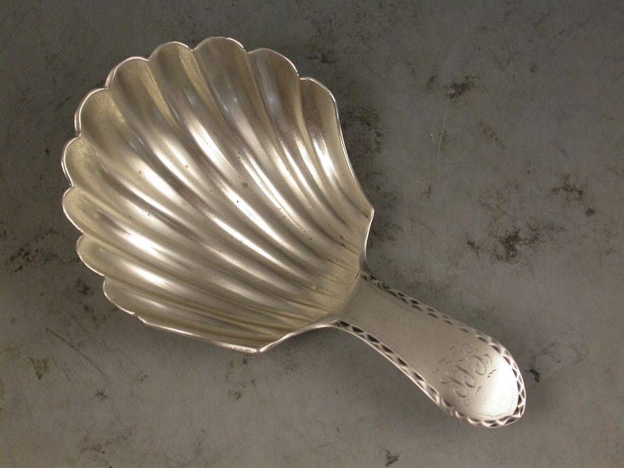 A rare George III Scottish Provincial silver Caddy Spoon with a large fluted scallop shell bowl and bright-cut engraved Celtic point type handle engraved with initials.